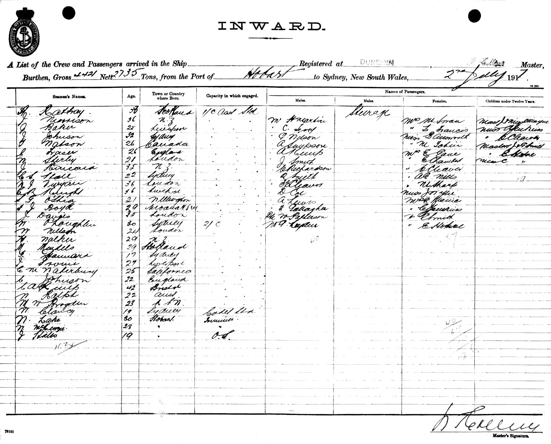 Source: State Records Authority of New South Wales: Shipping Master's Office; Passengers Arriving 1855 - 1922; NRS13278, [X425] reels 2098 & 2099. Transcribed by Lyn & Maurie. You may view/print a scan of the original list - a monitor set to high resolution is recommended for clarity. Use your back button to return. |