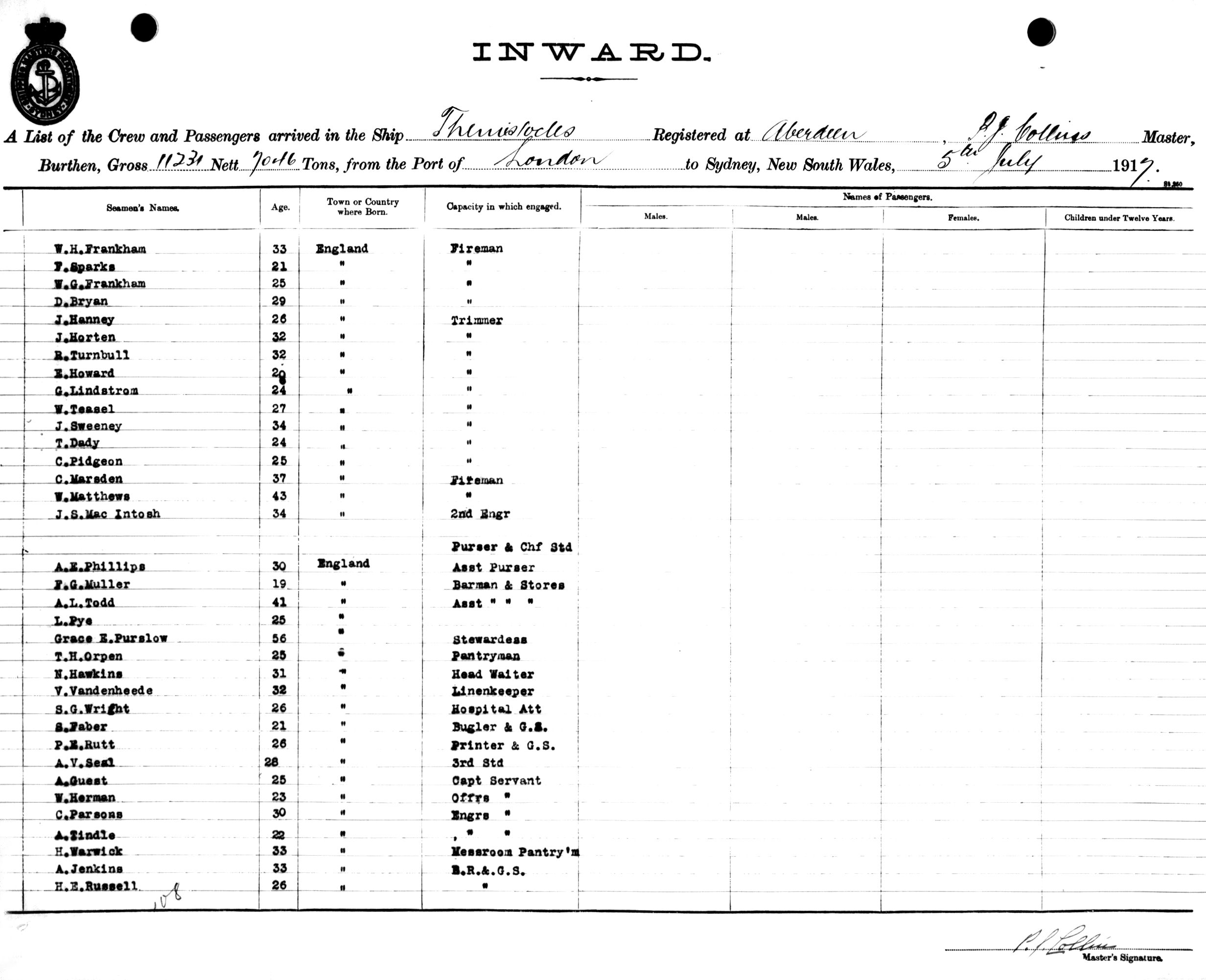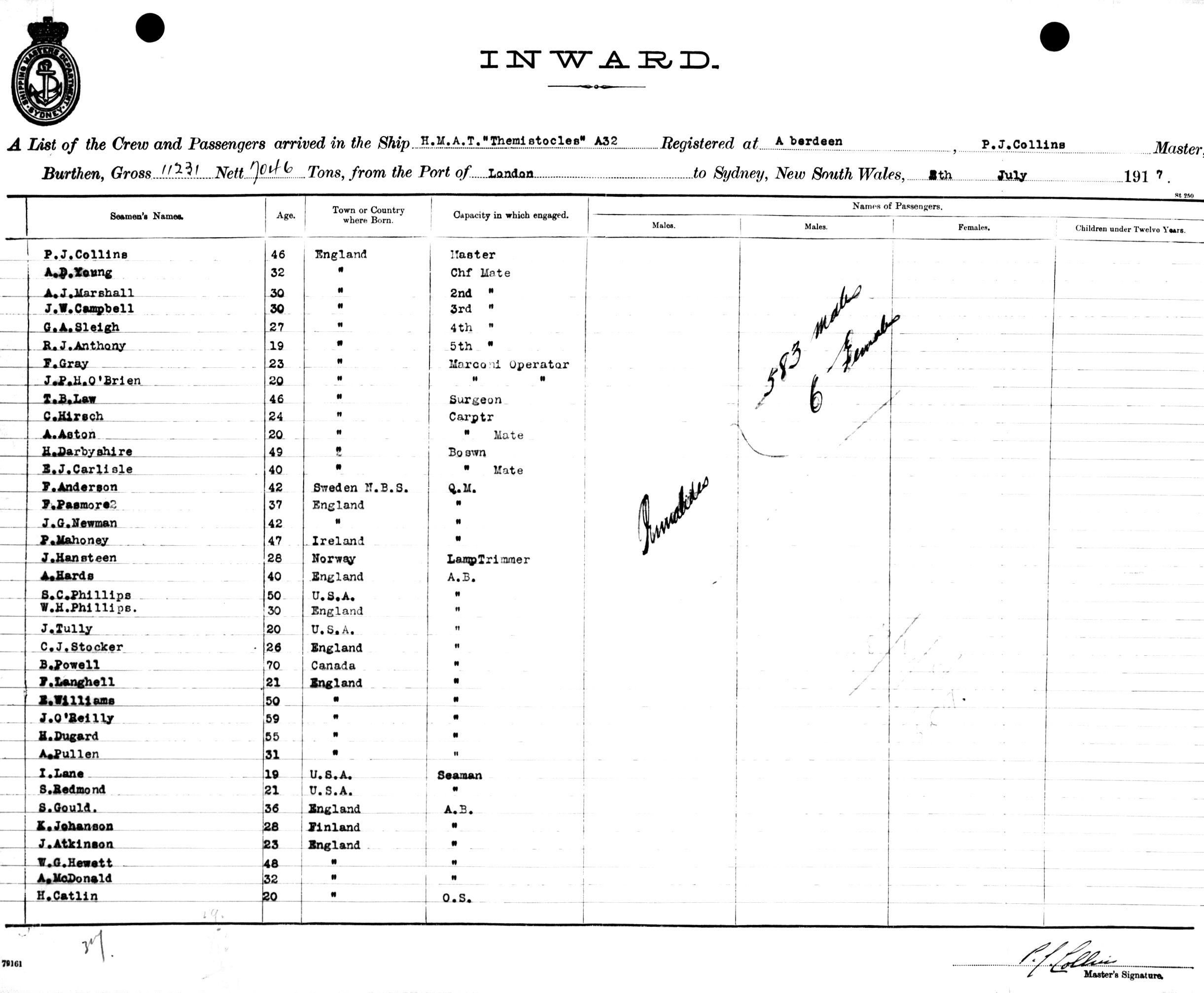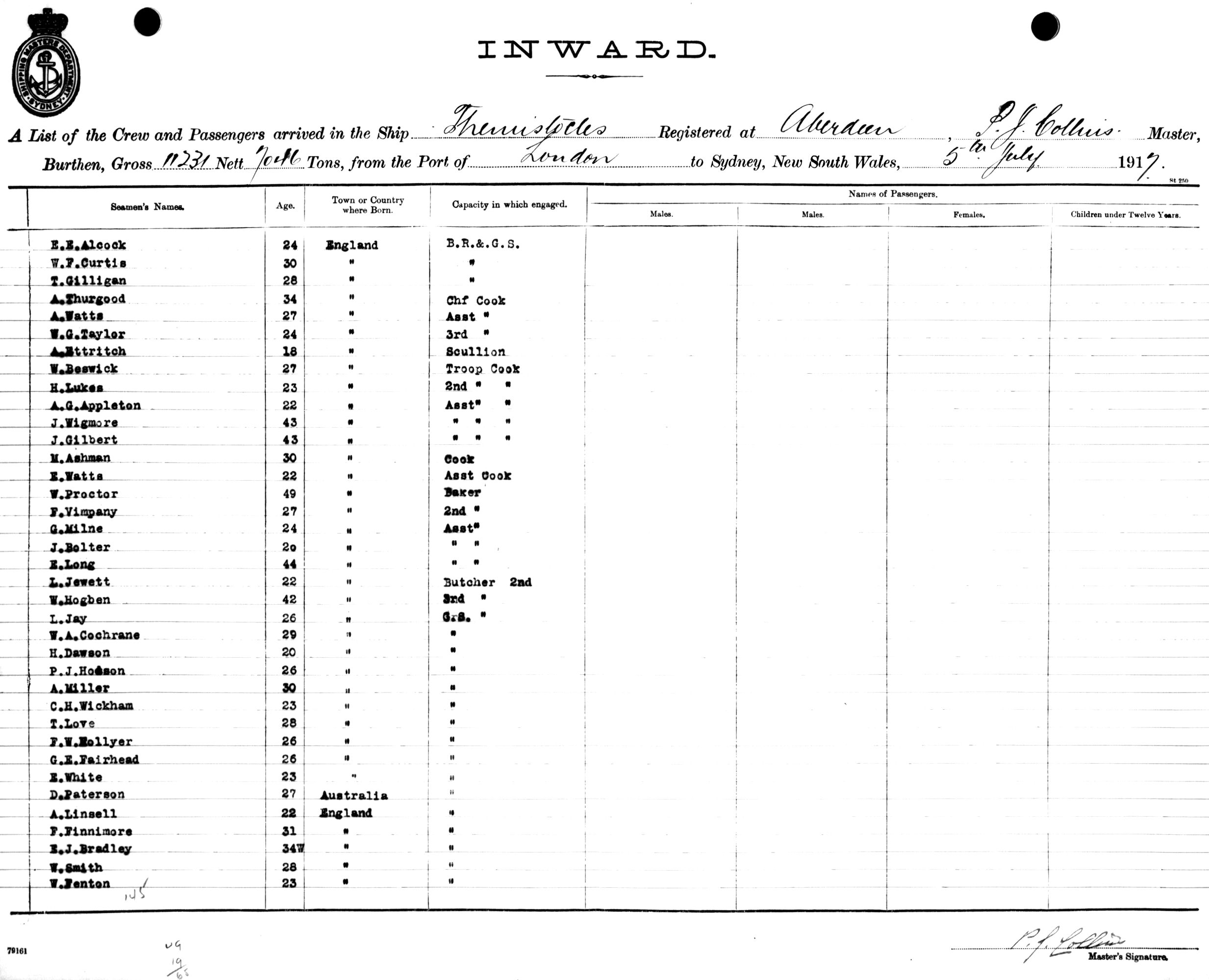 THEMISTOCLESOF ABERDEEN, P. J COLLINS, MASTER, BURTHEN 11231/7046 TONS FROM THE PORT OF LONDON TO SYDNEY, NEW SOUTH WALES, 5TH JULY 1917 |