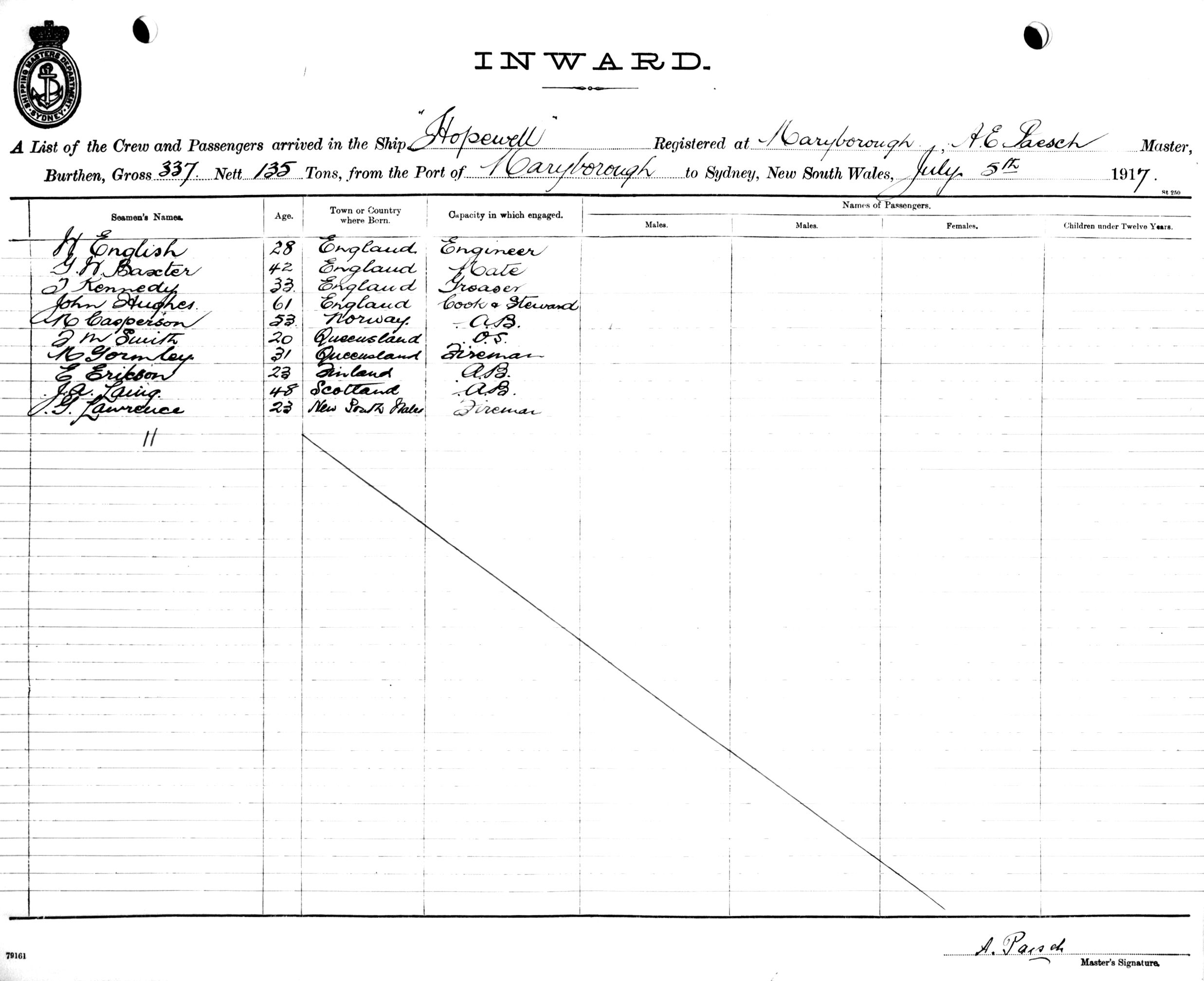 HOPEWELLOF MARYBOROUGH, A. E. PAESCH, MASTER, BURTHEN 337/135 TONS FROM THE PORT OF MARYBOROUGH TO SYDNEY, NEW SOUTH WALES, 5TH JULY 1917 |