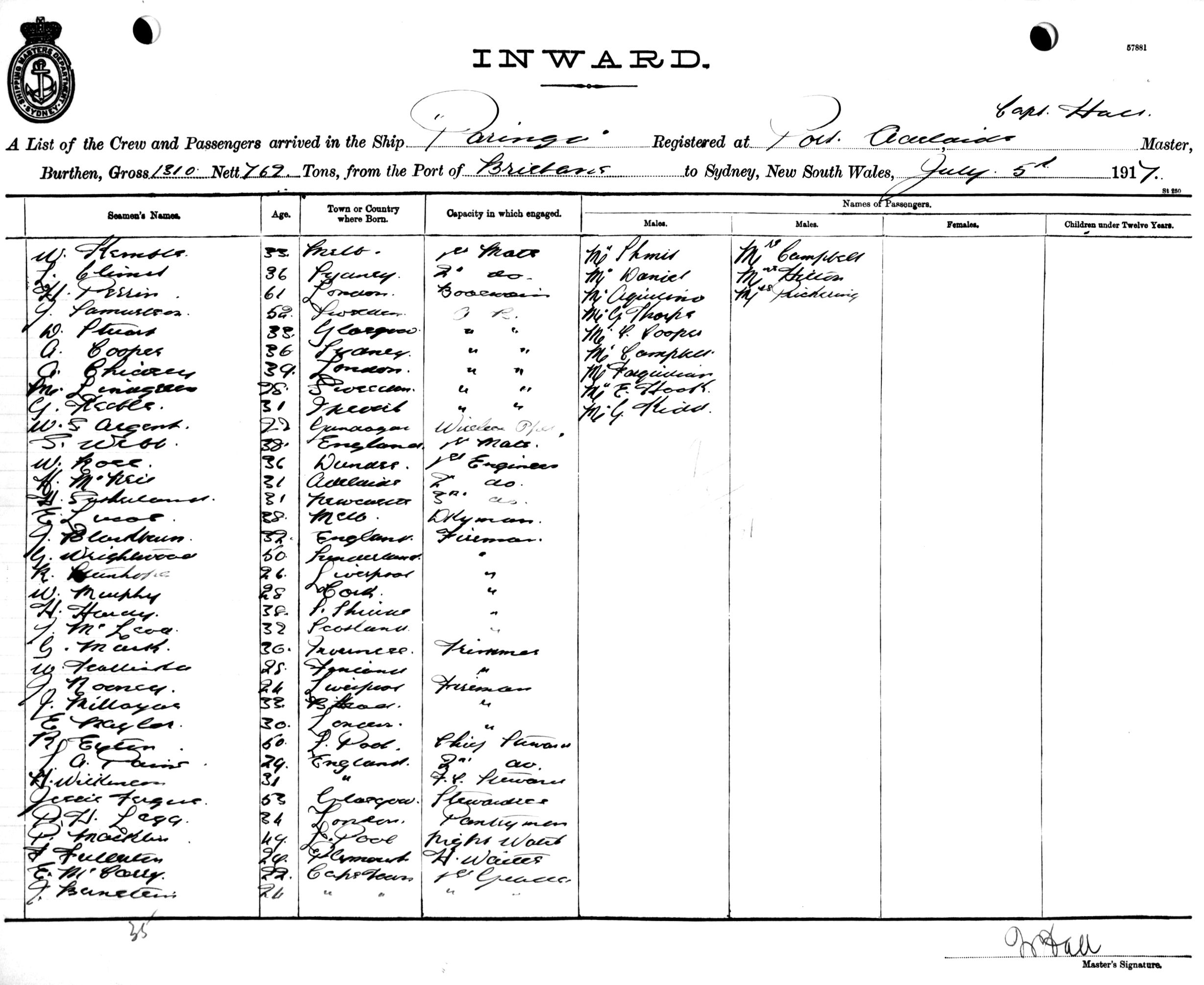 PARINGAOF PORT ADELAIDE, W. HALL, MASTER, BURTHEN 1310/762 TONS FROM THE PORT OF BRISBANE TO SYDNEY, NEW SOUTH WALES, 5TH JULY 1917 |