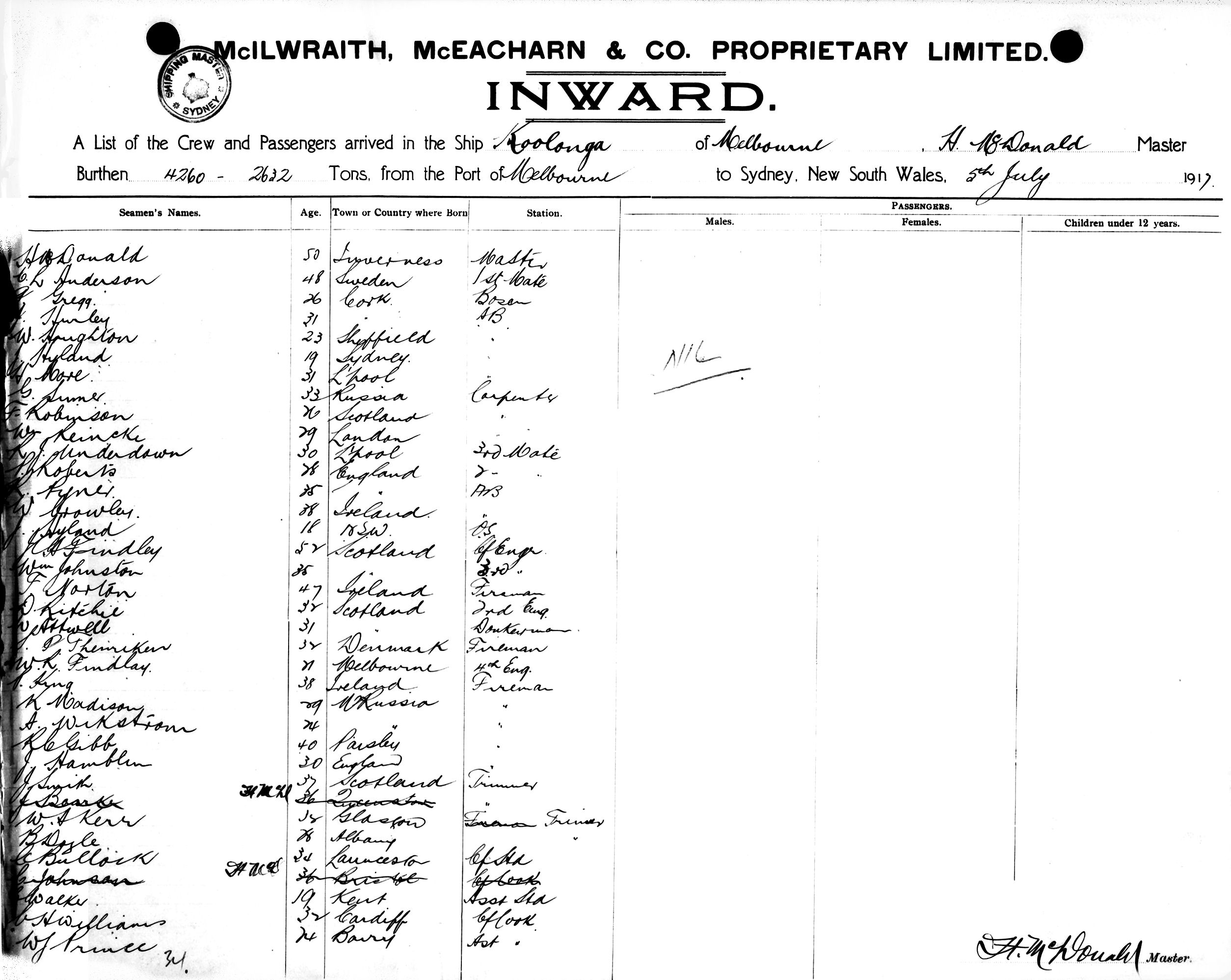 KOOLONGAOF MELBOURNE, H. MCDONALD, MASTER, BURTHEN 4260/2632 TONS FROM THE PORT OF MELBOURNE TO SYDNEY, NEW SOUTH WALES, 5TH JULY 1917 |