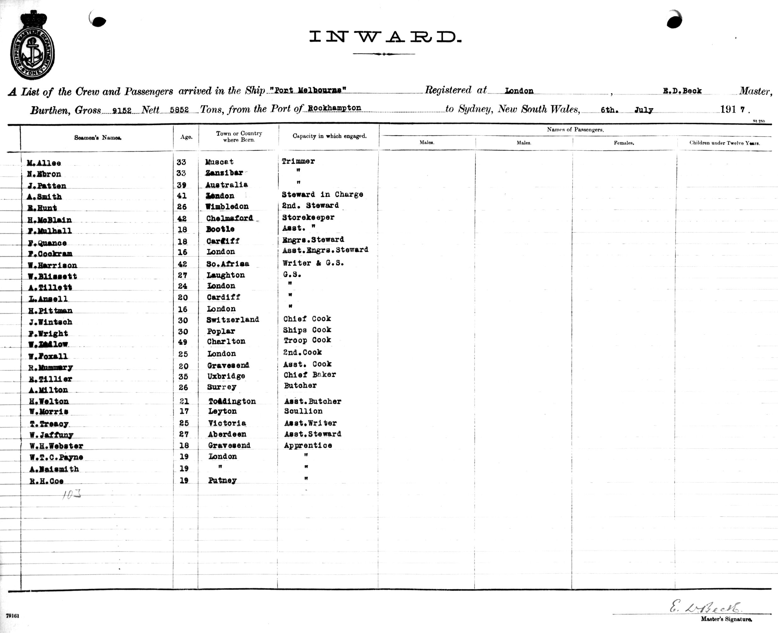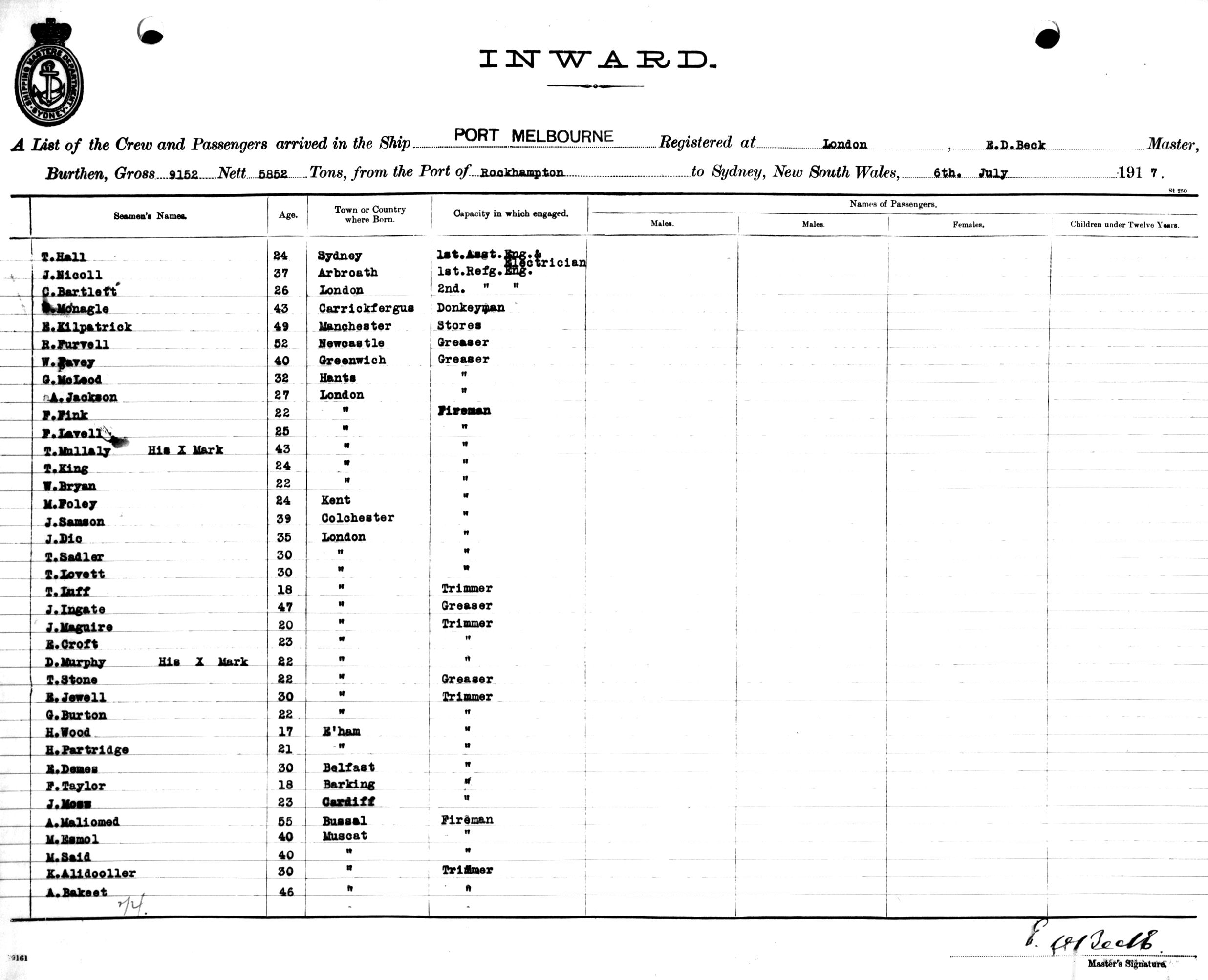 PORT MELBOURNEOF LONDON, E. D. BECK, MASTER, BURTHEN 9152/5852 TONS FROM THE PORT OF ROCKHAMPTON TO SYDNEY, NEW SOUTH WALES, 6TH JULY 1917 |