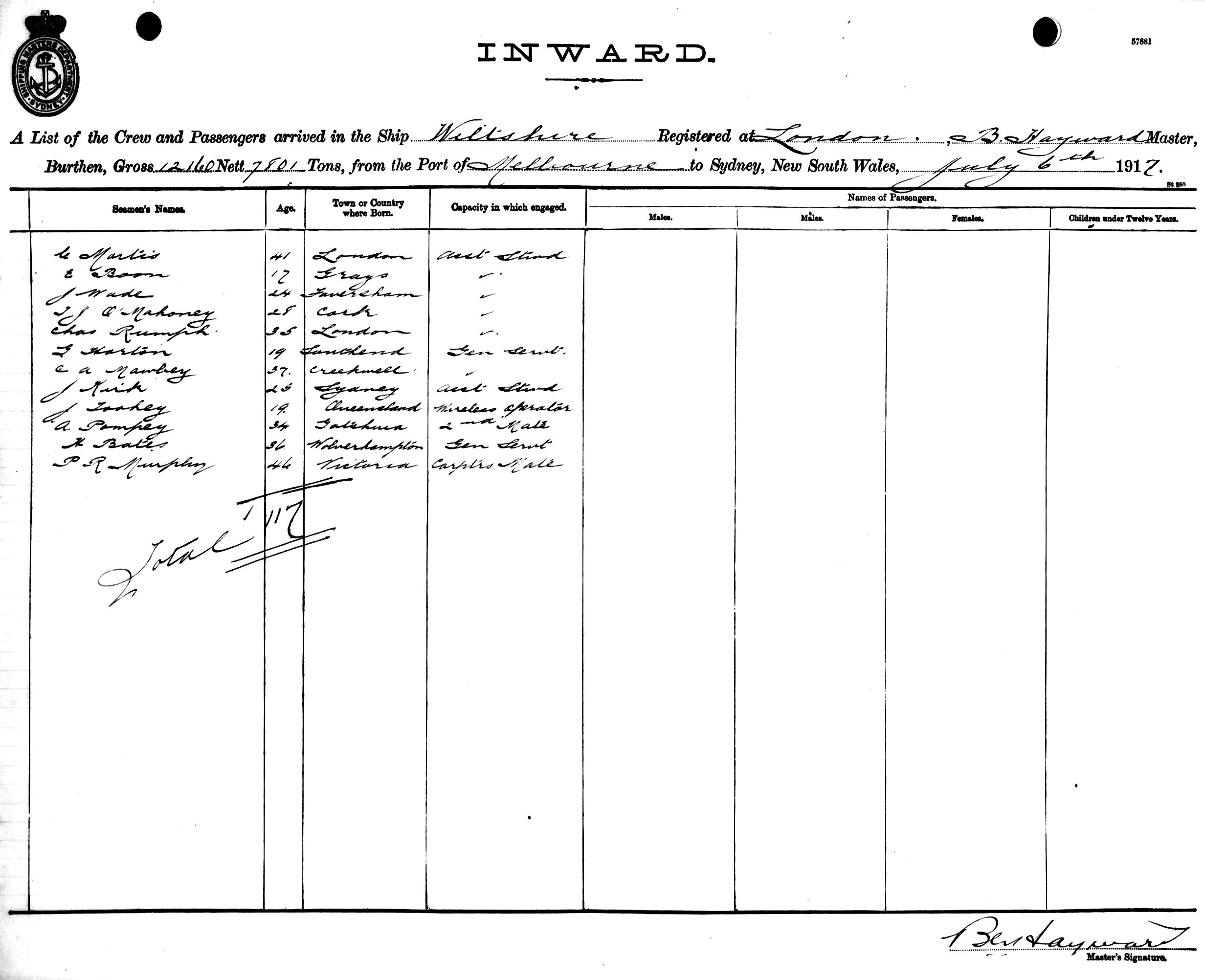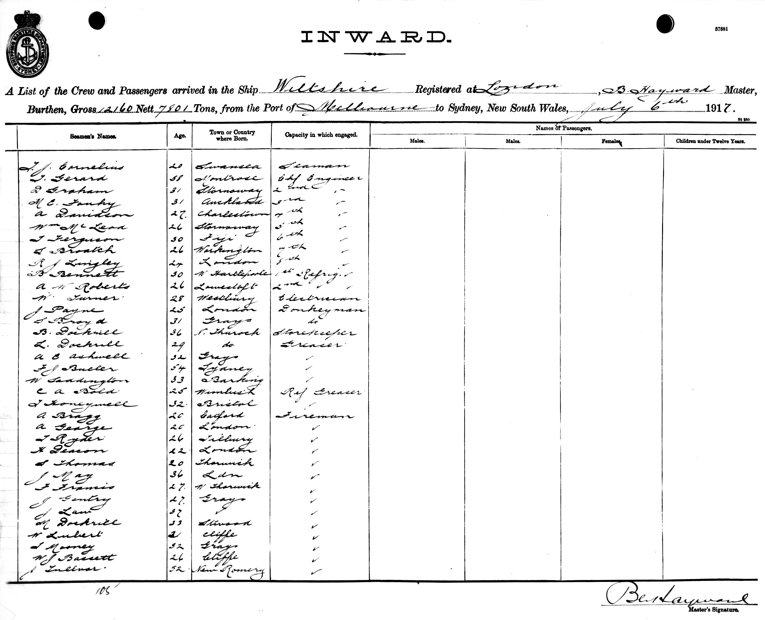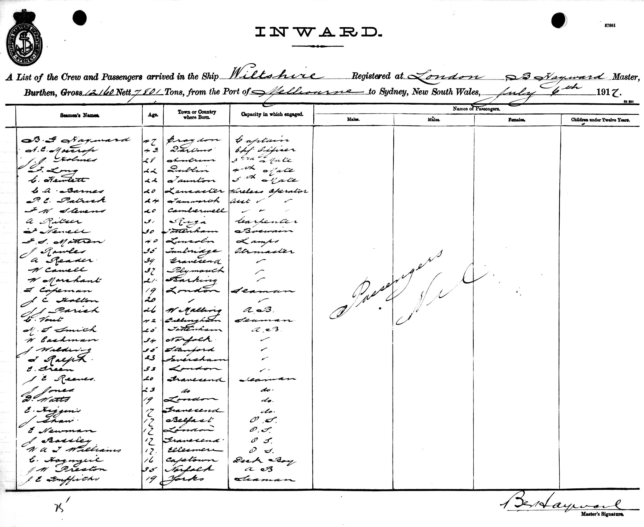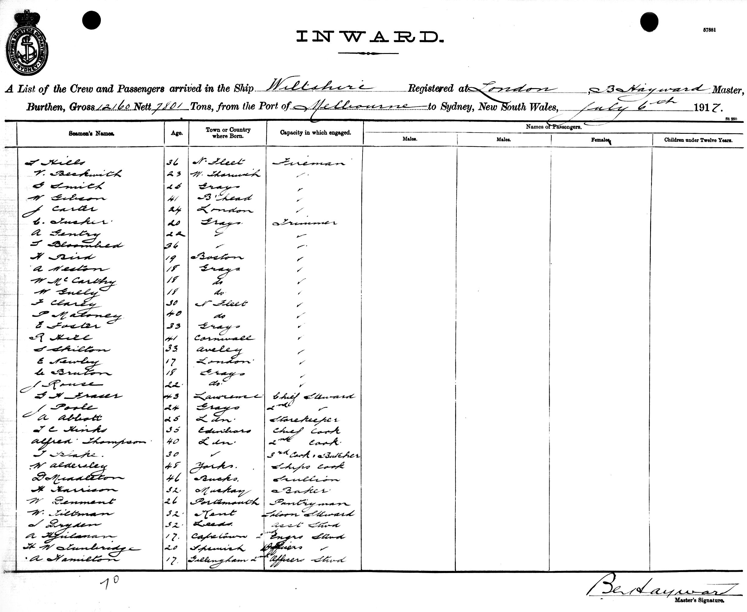 WILTSHIREOF LONDON, B. HAYWARD, MASTER, BURTHEN 12160/7801 TONS FROM THE PORT OF MELBOURNE TO SYDNEY, NEW SOUTH WALES, 6TH JULY 1917 |