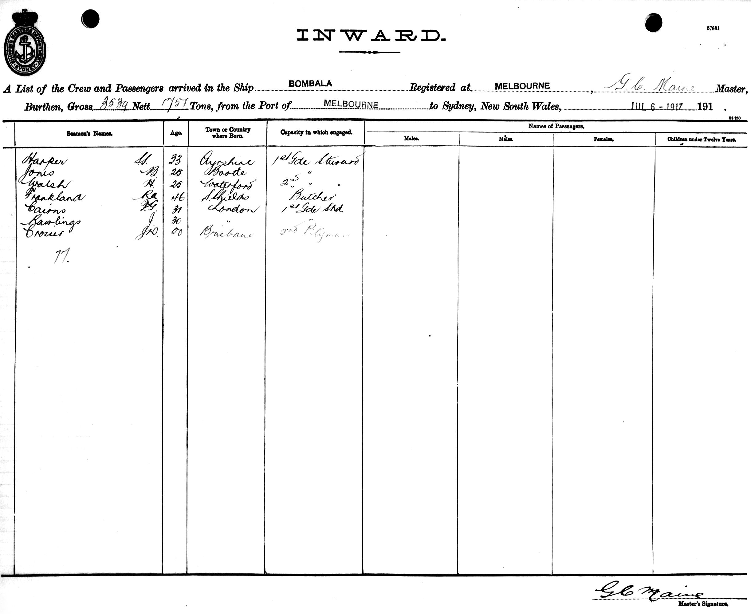 BOMBALAOF MELBOURNE, G. C. MAINE, MASTER, BURTHEN 3539/1751 TONS FROM THE PORT OF MELBOURNE TO SYDNEY, NEW SOUTH WALES, 6TH JULY 1917 |