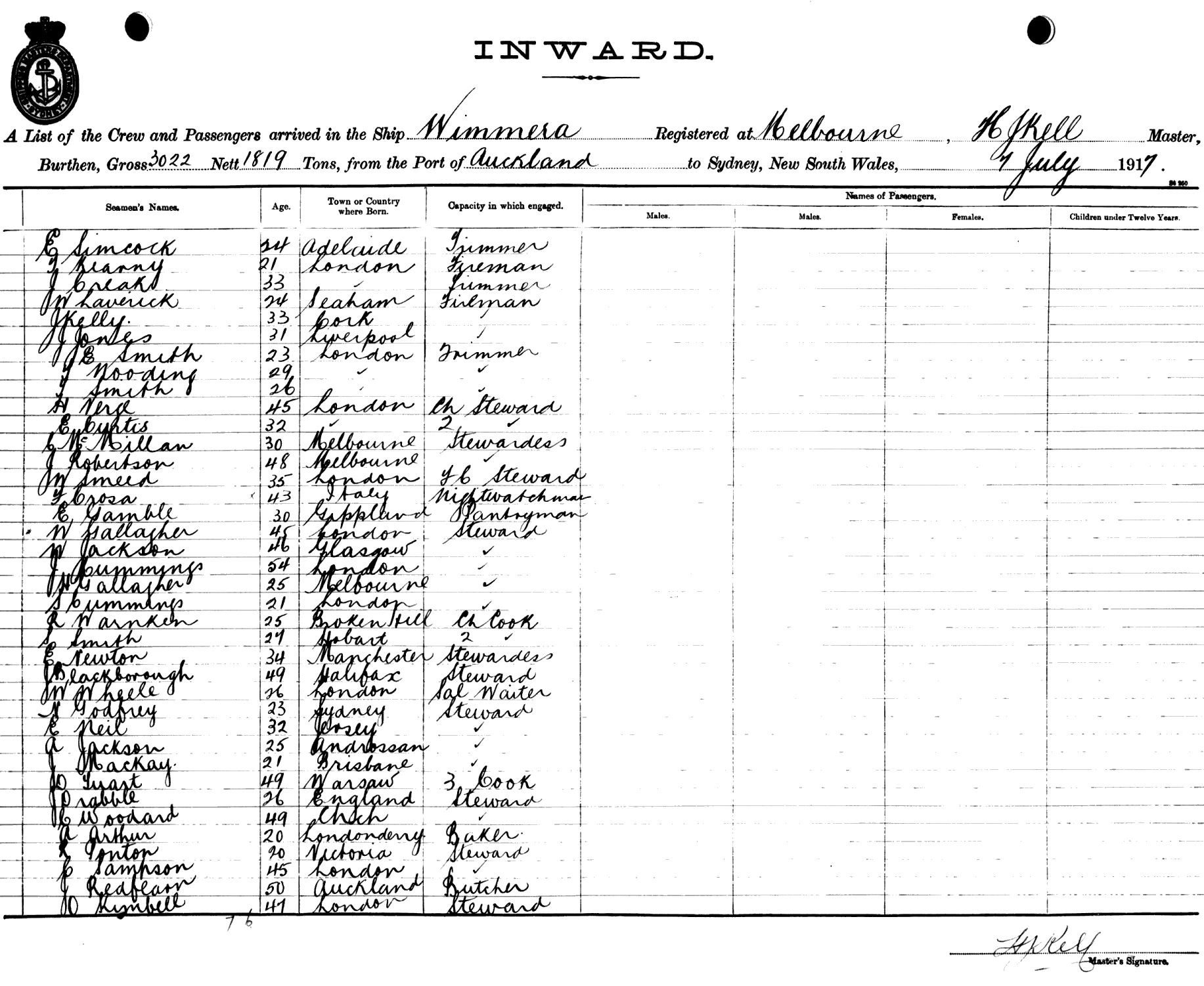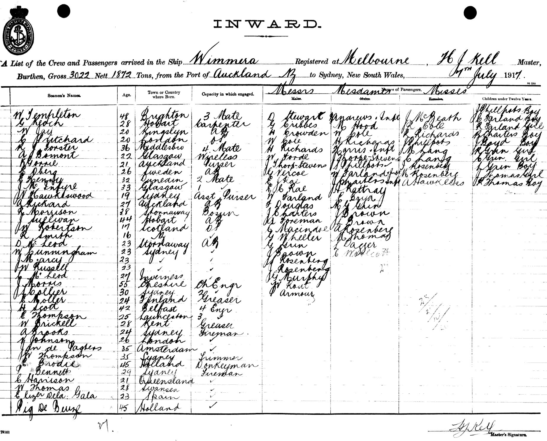 WIMMERAOF MELBOURNE, H. J. KELL, MASTER, BURTHEN 3022/1872 TONS FROM THE PORT OF AUCKLAND TO SYDNEY, NEW SOUTH WALES, 7TH JULY 1917 |