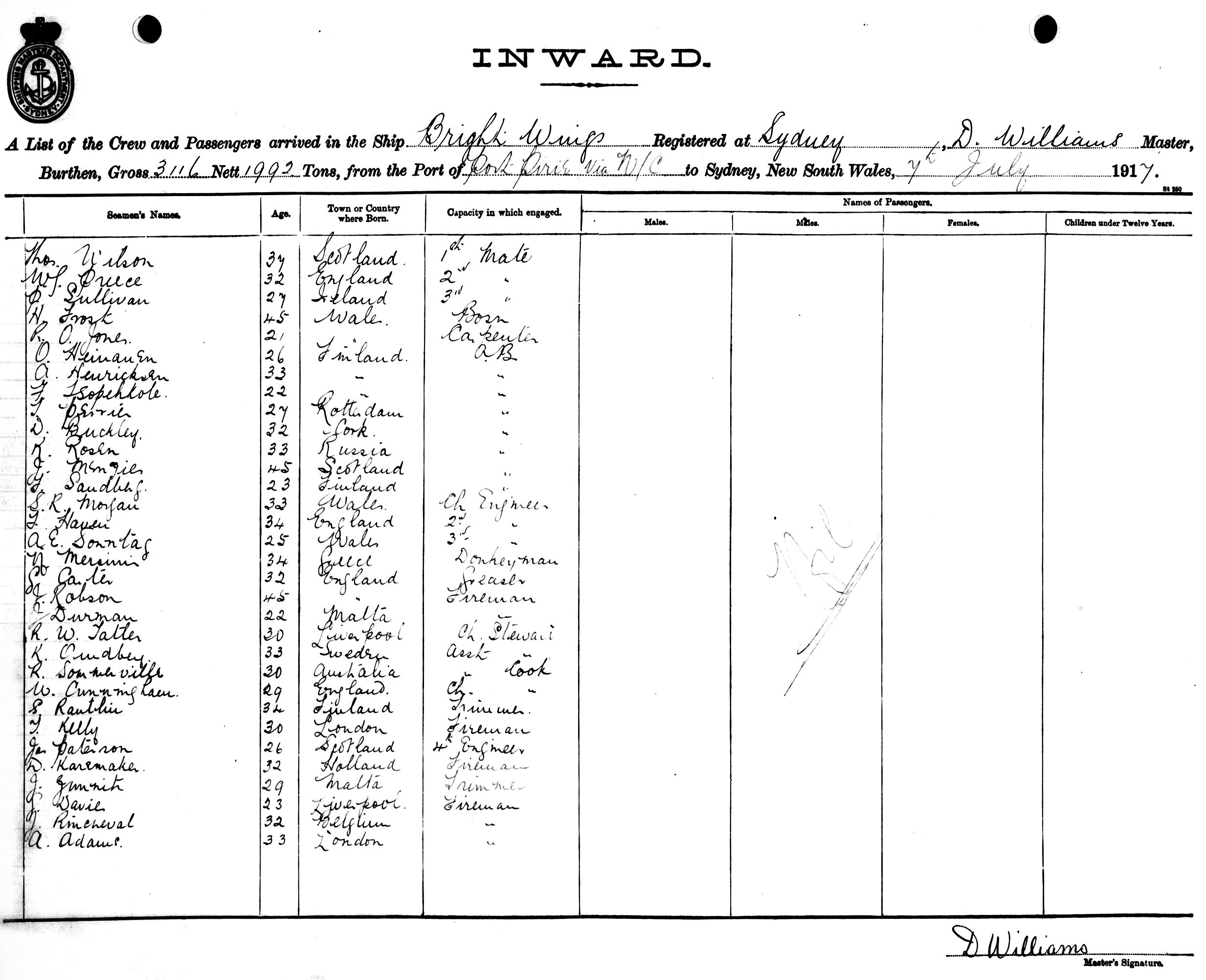 BRIGHT WINGSOF SYDNEY, D. WILLIAMS, MASTER, BURTHEN 3116/1992 TONS FROM THE PORT OF PORT PIRIE via NEWCASTLE TO SYDNEY, NEW SOUTH WALES, 7TH JULY 1917 |