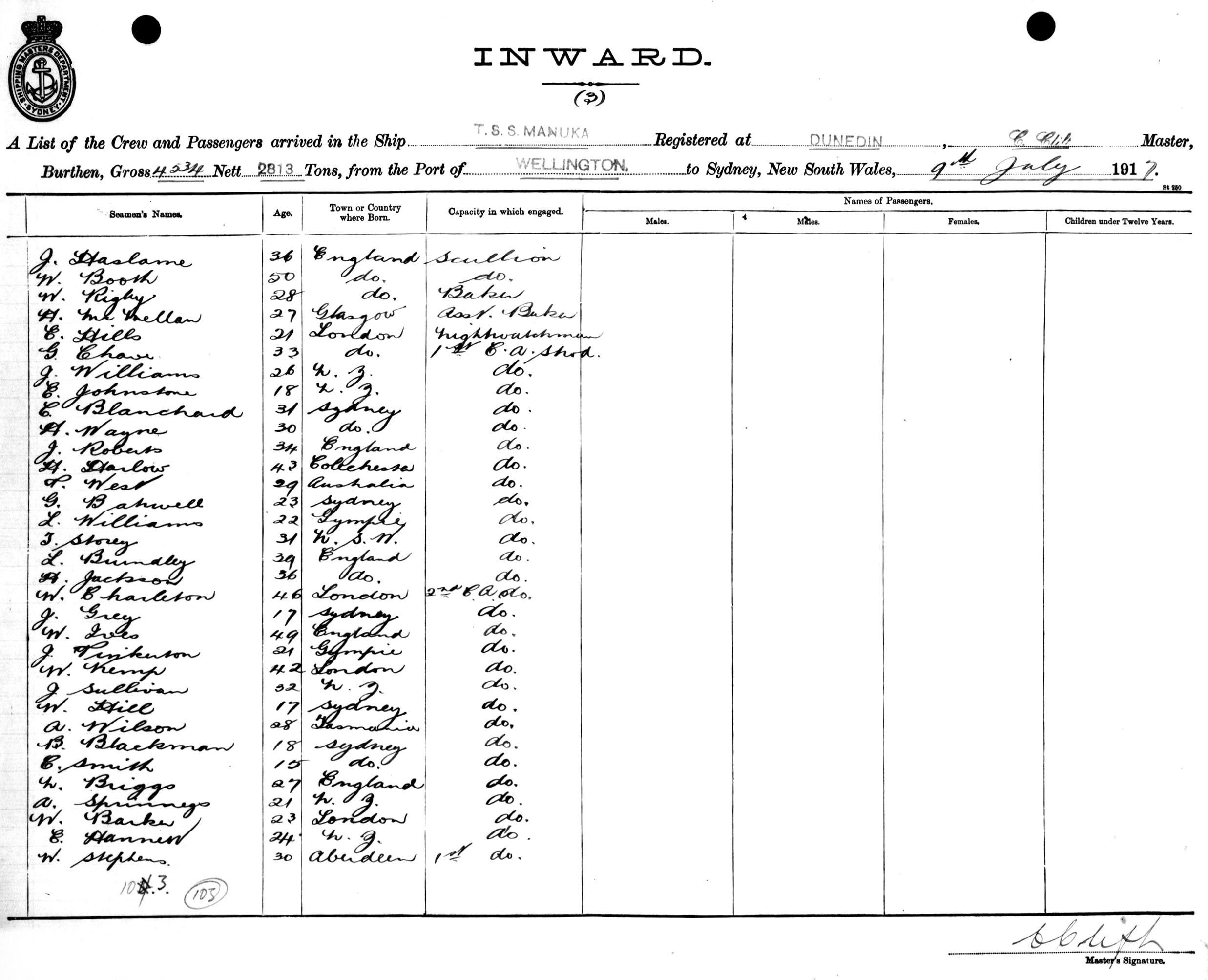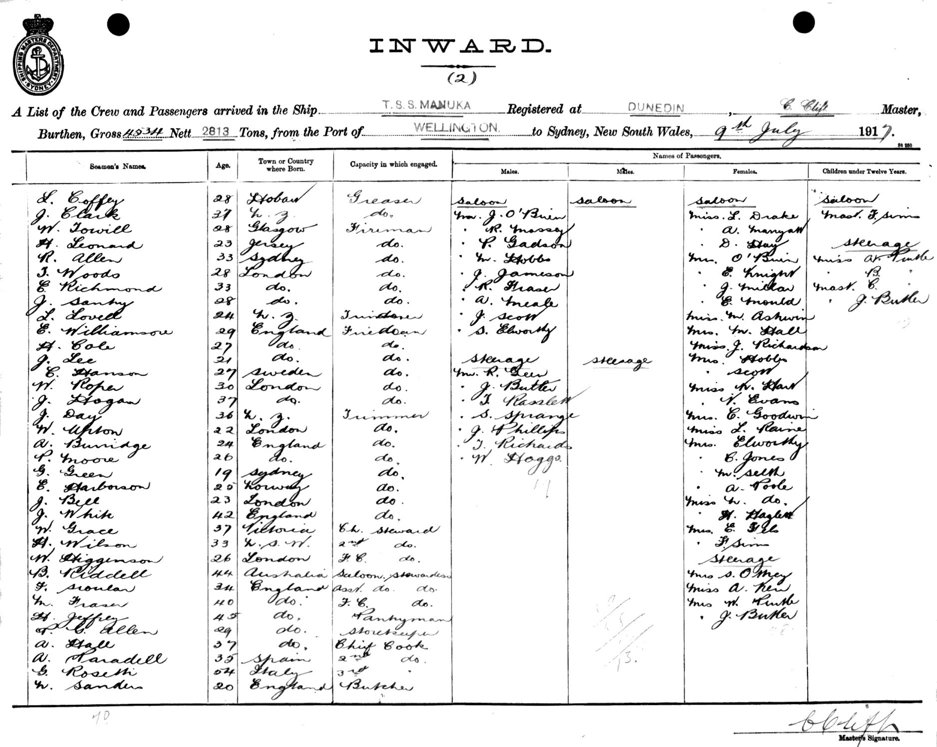 MANUKAOF DUNEDIN, C. CLIFT, MASTER, BURTHEN 4534/2813 TONS FROM THE PORT OF WELLINGTON TO SYDNEY, NEW SOUTH WALES, 9TH JULY 1917 |