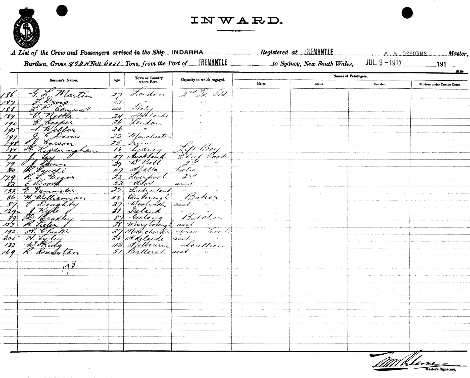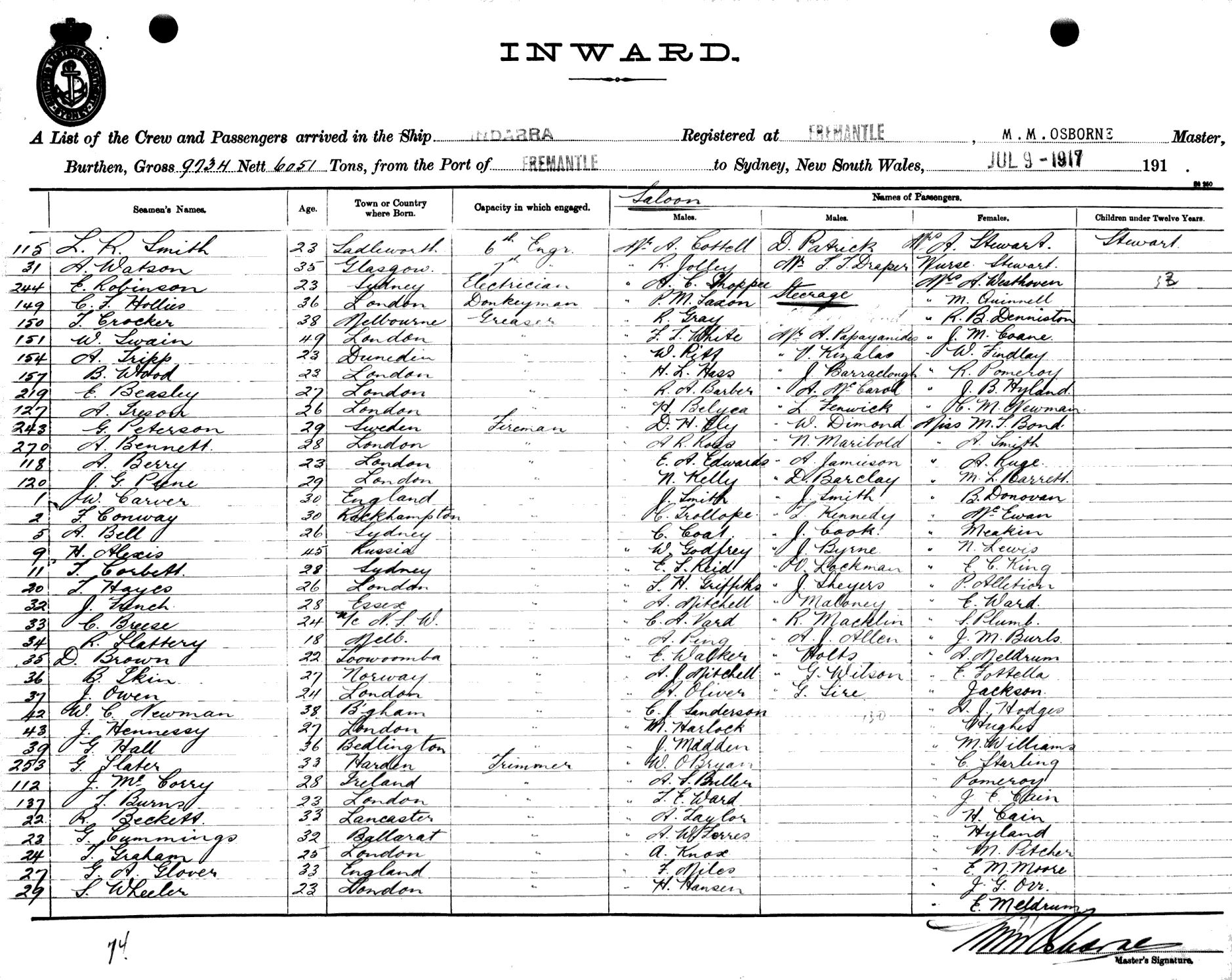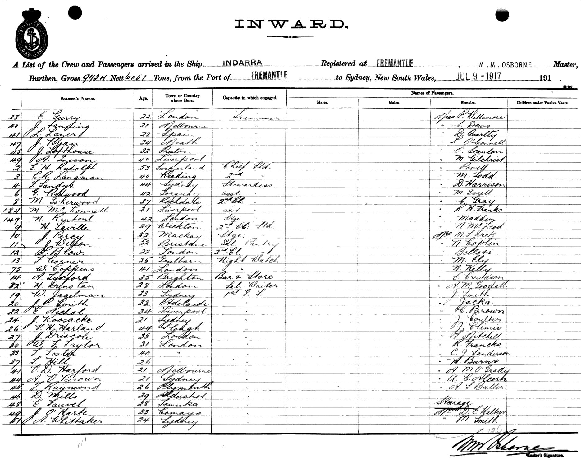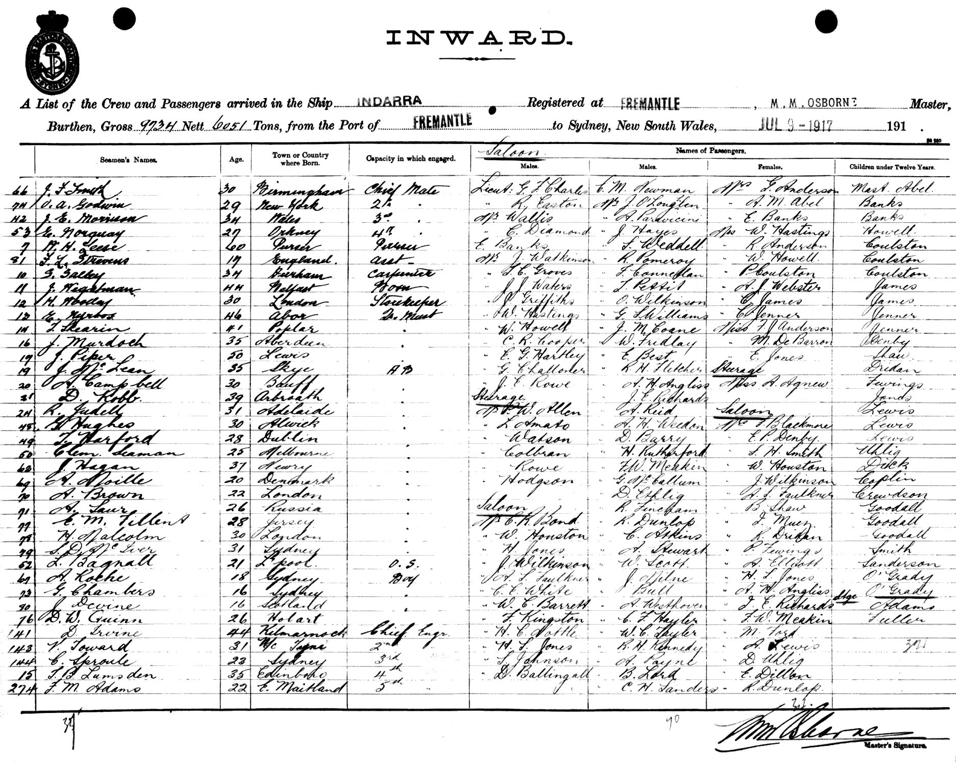 INDARRAOF FREMANTLE, M. M. OSBORNE, MASTER, BURTHEN 9734/6051 TONS FROM THE PORT OF FREMANTLE TO SYDNEY, NEW SOUTH WALES, 9TH JULY 1917 |