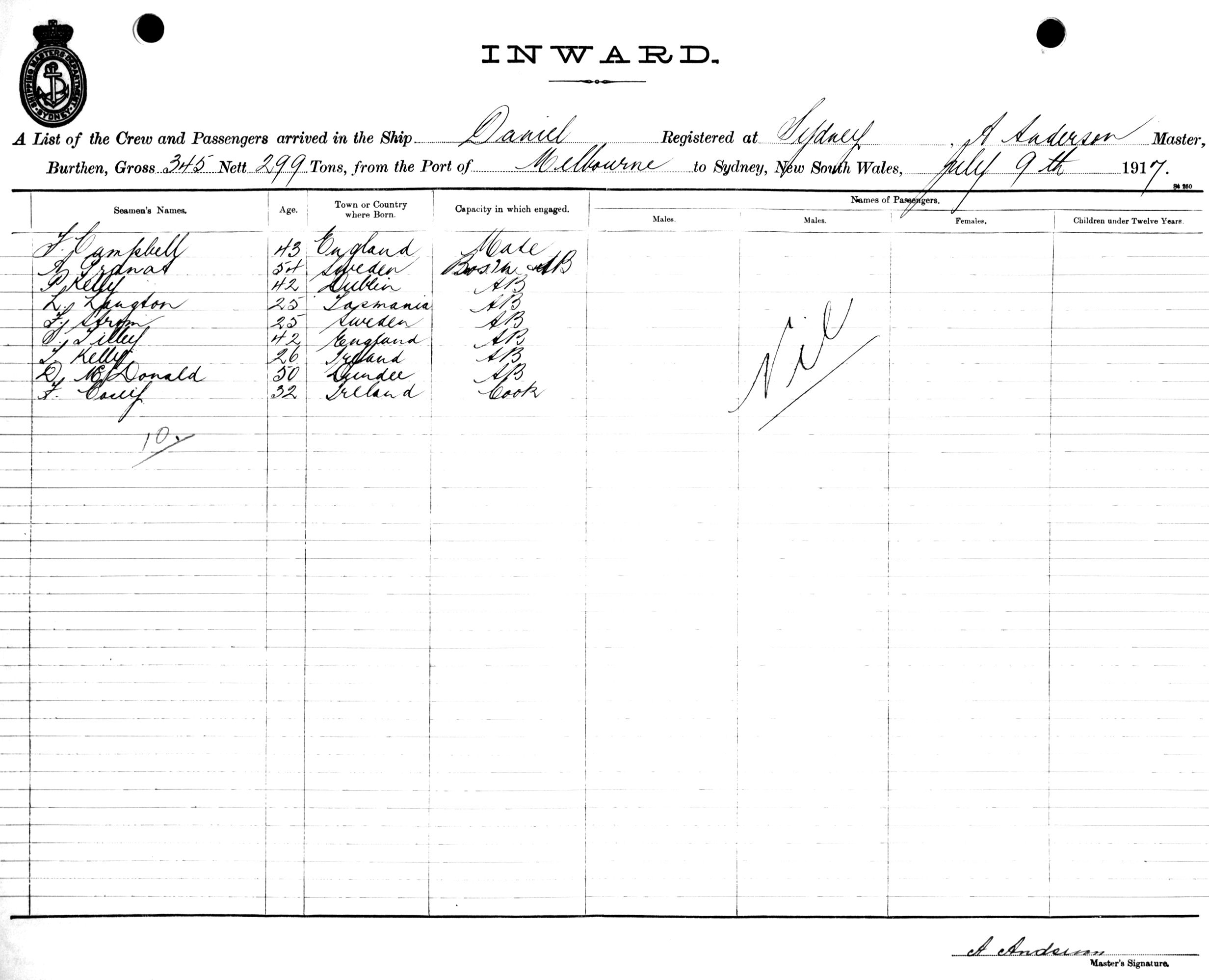 DANIELOF SYDNEY, A. ANDERSON, MASTER, BURTHEN 345/299 TONS FROM THE PORT OF MELBOURNE TO SYDNEY, NEW SOUTH WALES, 9TH JULY 1917 |