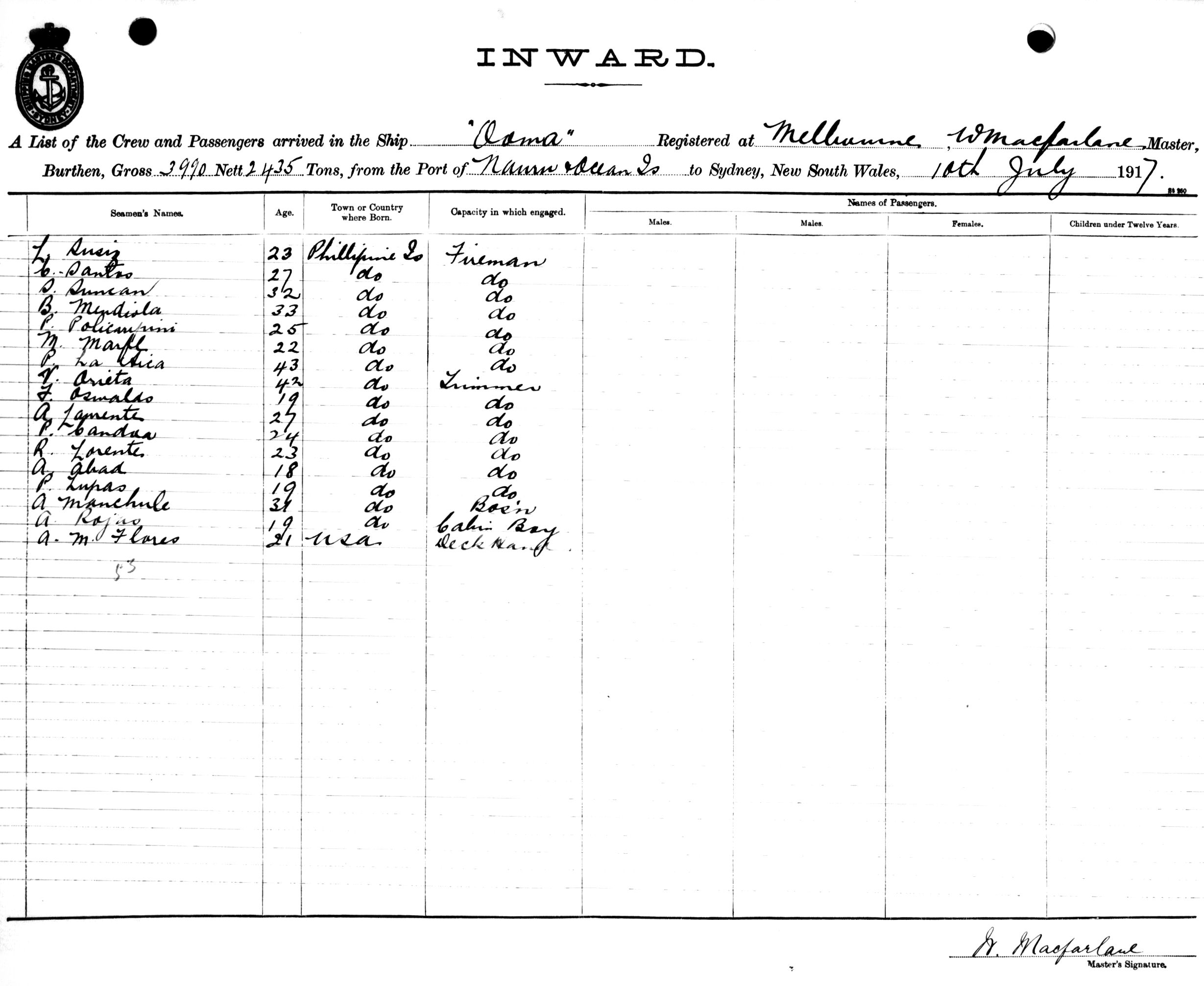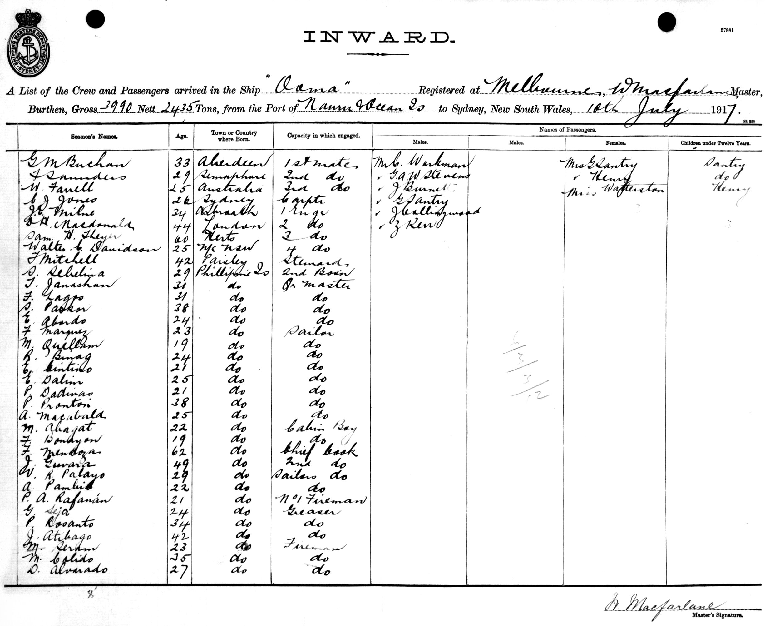 OOMAOF MELBOURNE, W. MACFARLANE, MASTER, BURTHEN 3990/2435 TONS FROM THE PORT OF NAURU & OCEAN ISLAND TO SYDNEY, NEW SOUTH WALES, 10TH JULY 1917 |