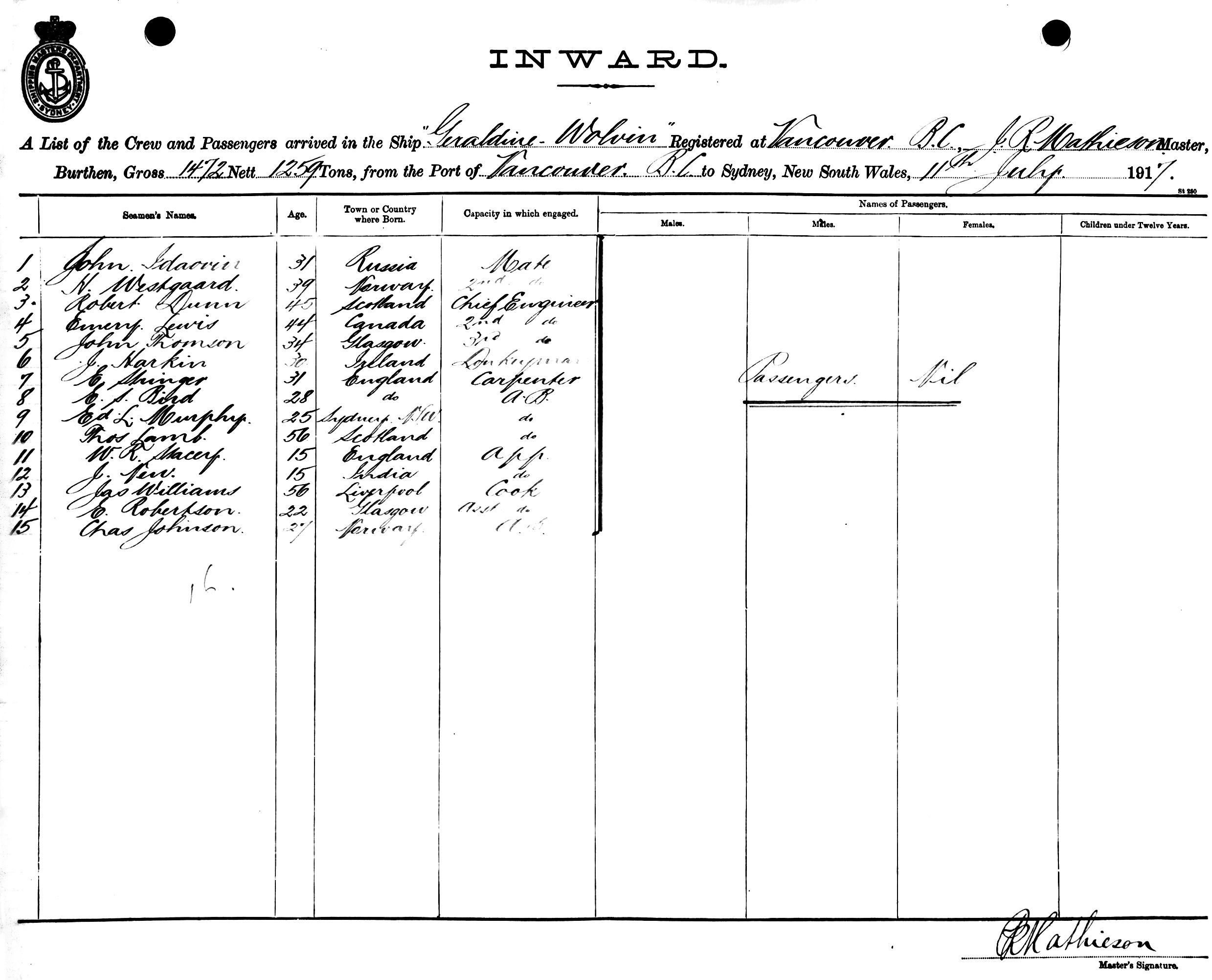 GERALDINE WOLVINOF VANCOUVER B. C., J. R. MATHIESON, MASTER, BURTHEN 1472/1259 TONS FROM THE PORT OF VANCOUVER B. C. TO SYDNEY, NEW SOUTH WALES, 11TH JULY 1917 |