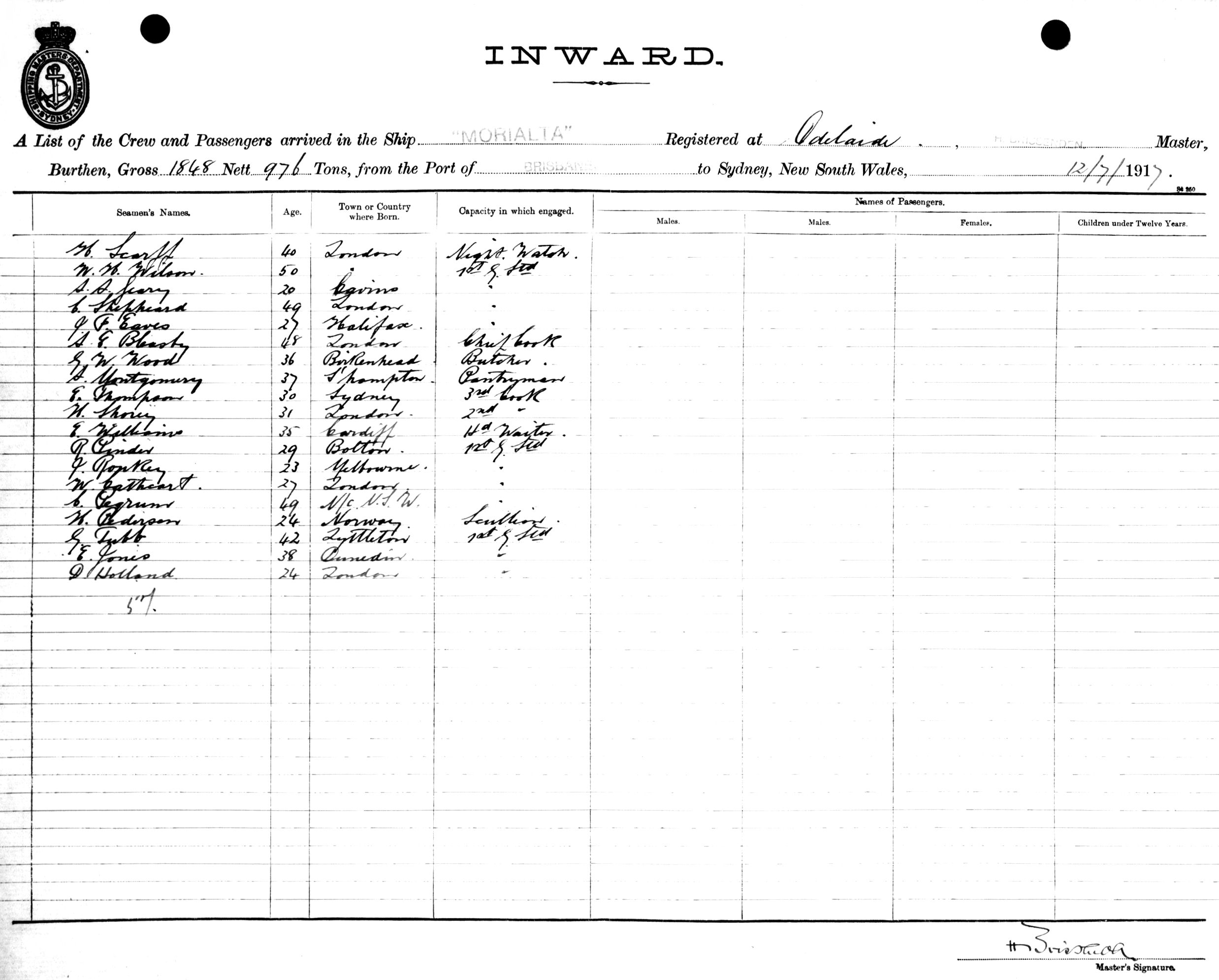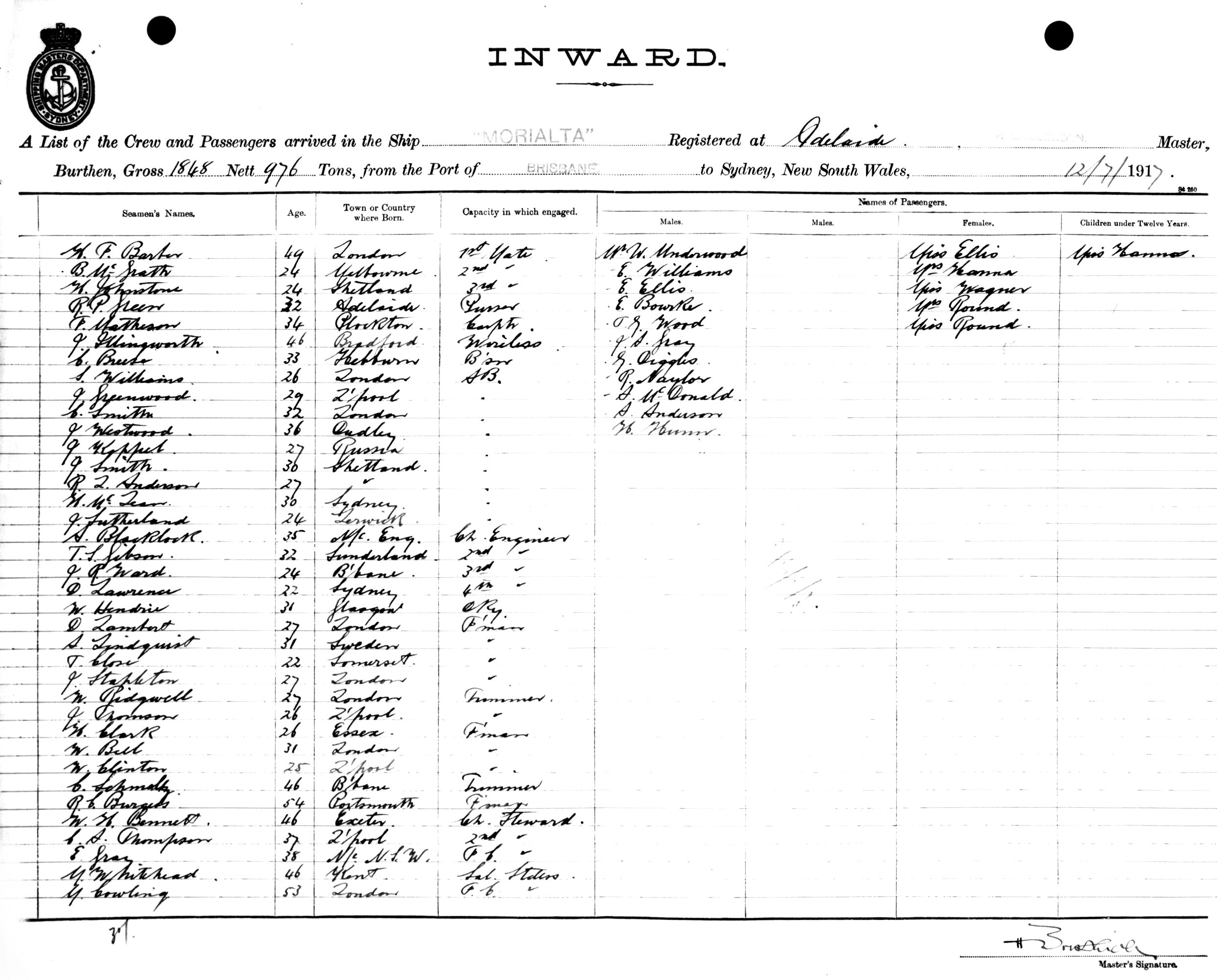 Mariners and ships in Australian Waters | MORIALTAOF ADELAIDE, H. BRISSENDEN, MASTER, BURTHEN 1848/976 TONS FROM THE PORT OF BRISBANE TO SYDNEY, NEW SOUTH WALES, 12TH JULY 1917 |