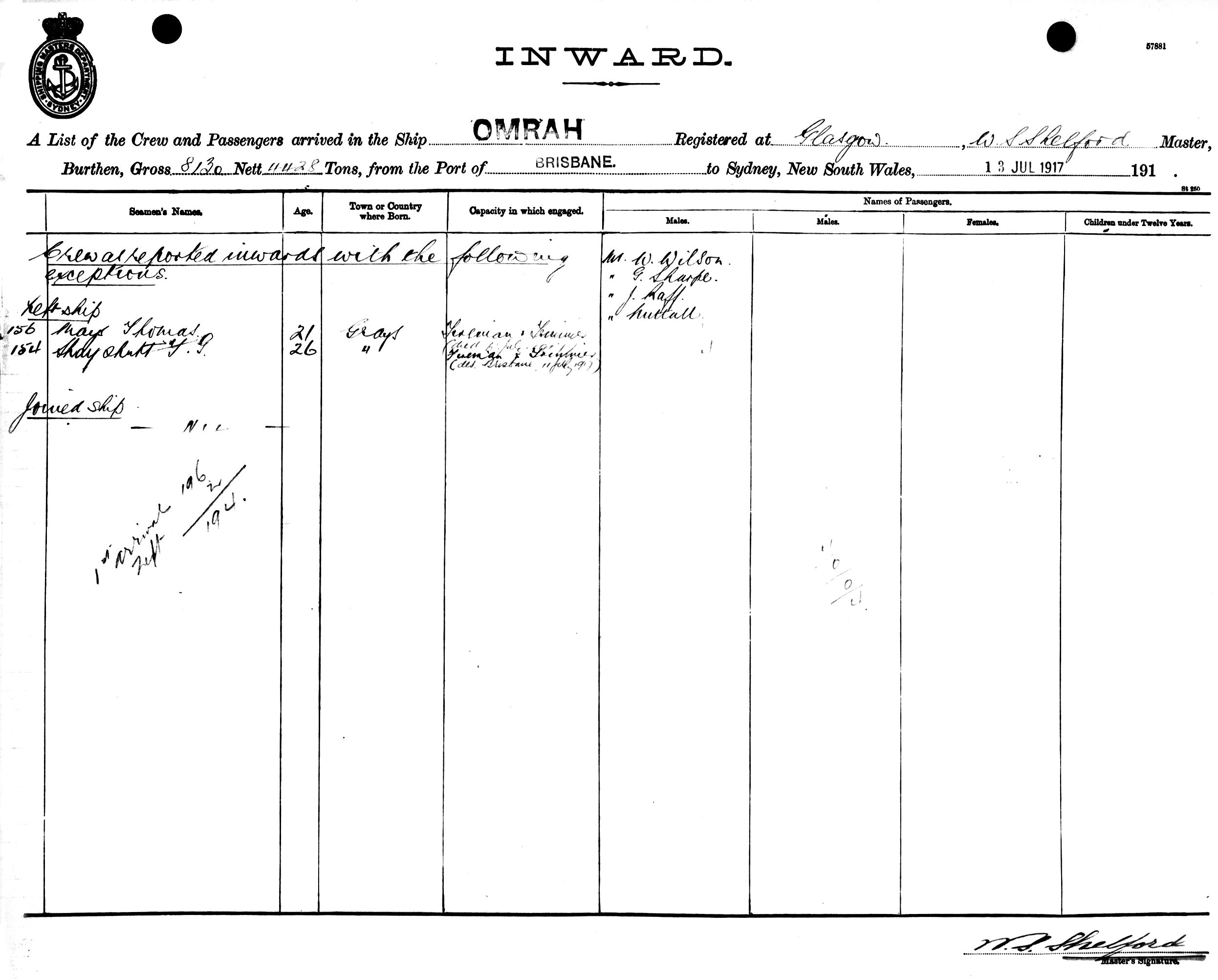 OMRAHOF GLASGOW, W. S. SHELFORD, MASTER, BURTHEN 8130/4428 TONS FROM THE PORT OF BRISBANE TO SYDNEY, NEW SOUTH WALES, 13TH JULY 1917 |