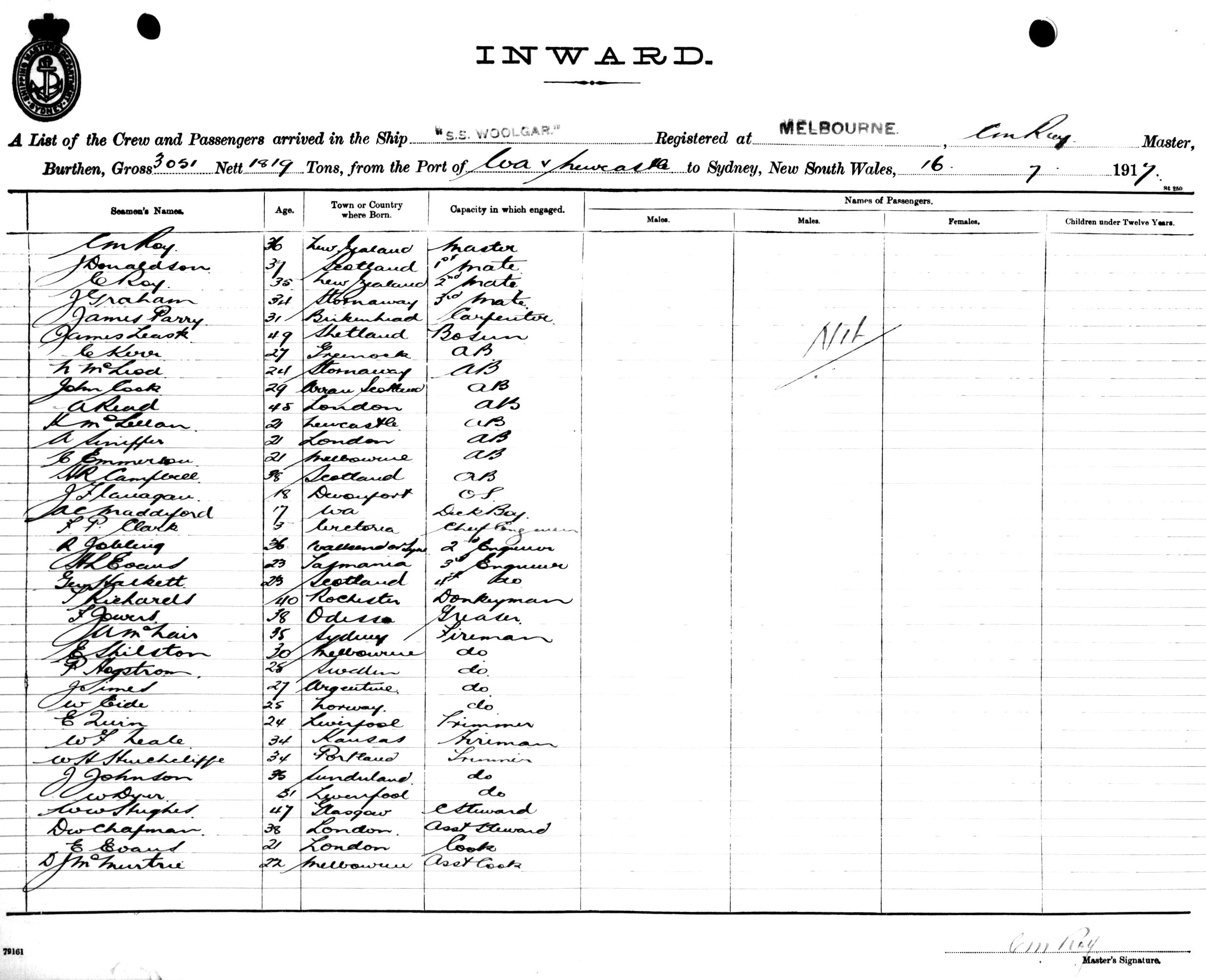 WOOLGAROF MELBOURNE, C. M. ROY, MASTER, BURTHEN 3051/1819 TONS FROM THE PORT OF WESTERN AUSTRALIA via NEWCASTLE TO SYDNEY, NEW SOUTH WALES, 16TH JULY 1917 |