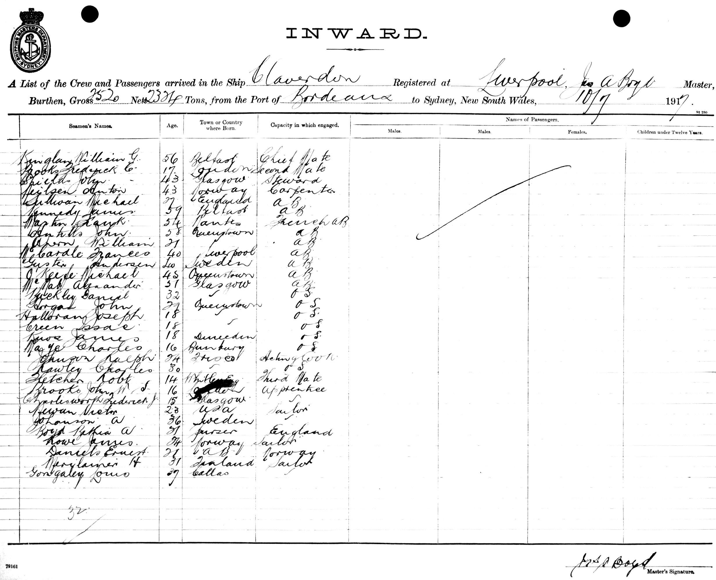 Mariners and ships in Australian Waters | CLAVERDONOF LIVERPOOL, JAS. A. BOYD, MASTER, BURTHEN 2520/2324 TONS FROM THE PORT OF BORDEAUX TO SYDNEY, NEW SOUTH WALES, 10TH JULY 1917 |