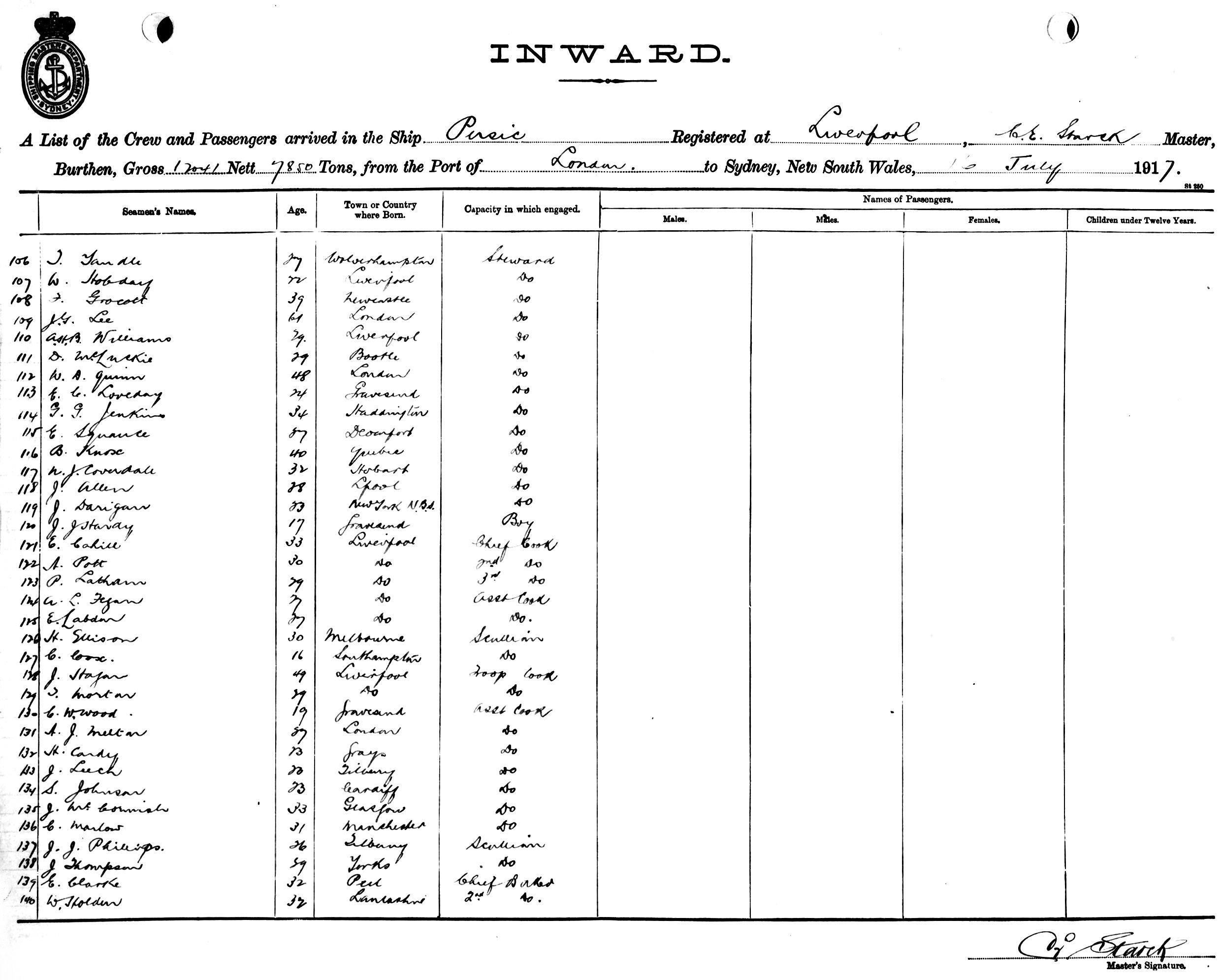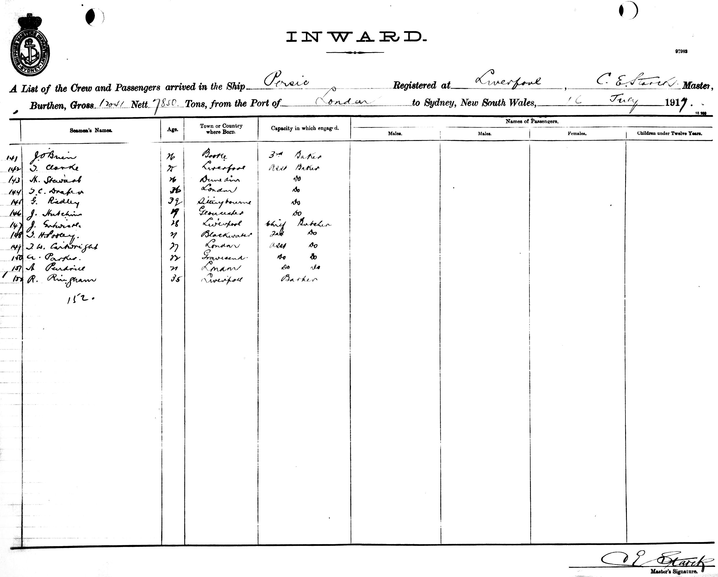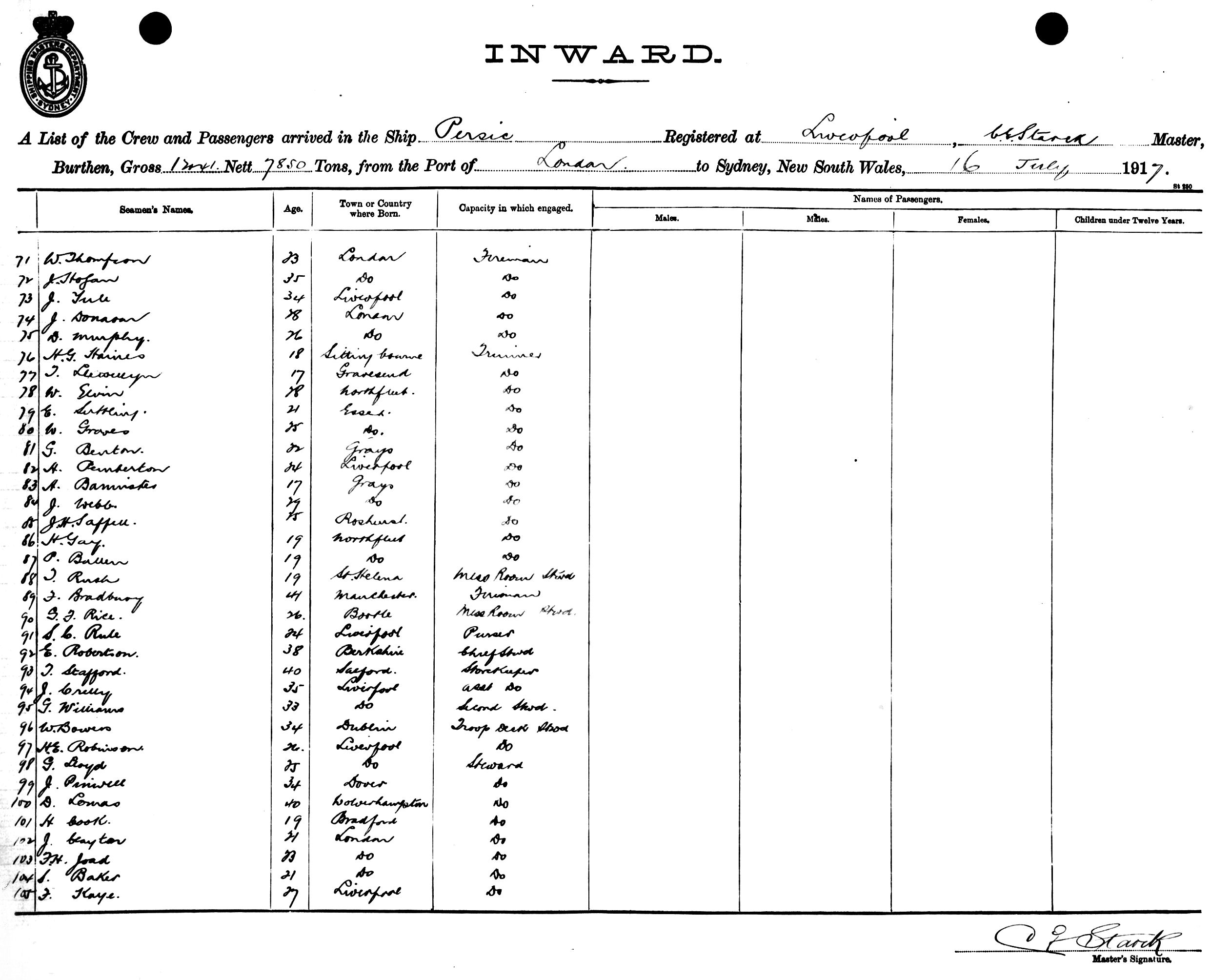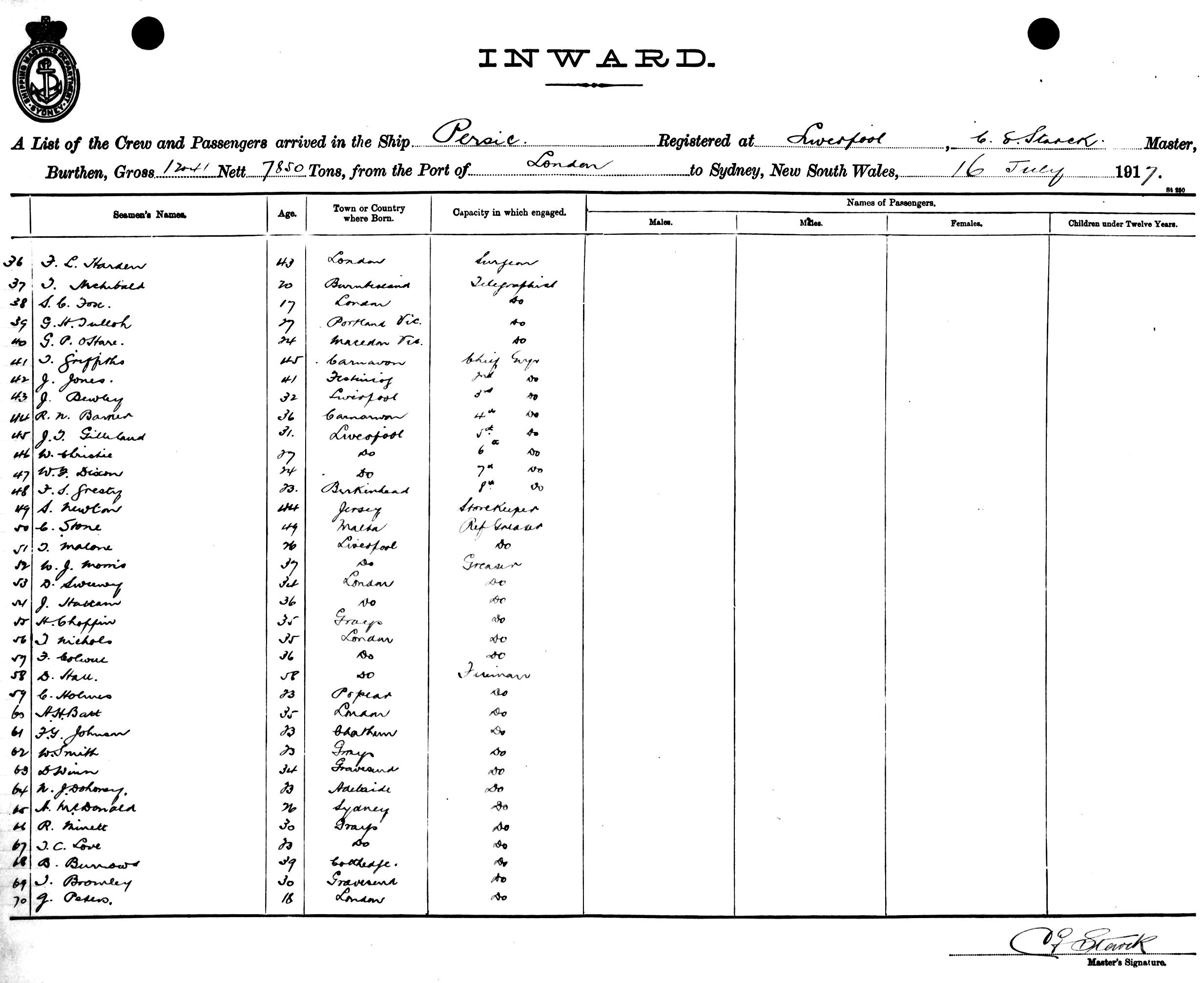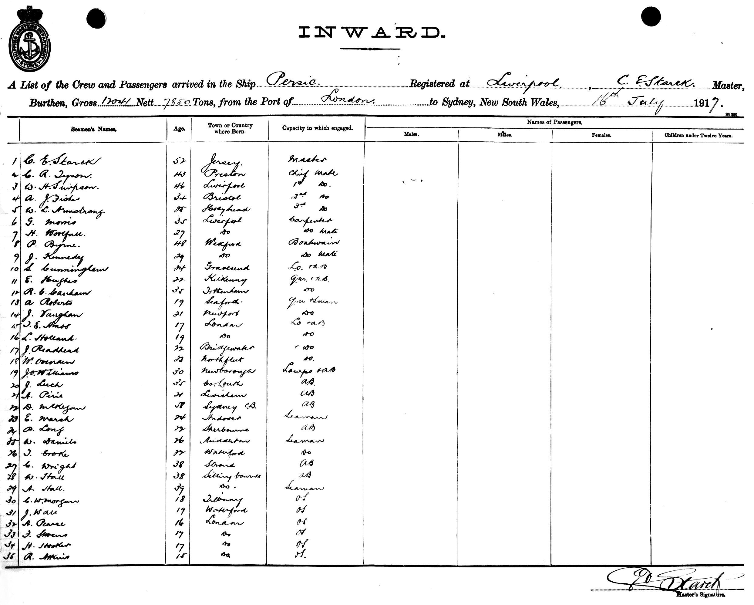Mariners and ships in Australian Waters | PERSICOF LIVERPOOL, C. E. STARCK, MASTER, BURTHEN 12041/7850 TONS FROM THE PORT OF LONDON TO SYDNEY, NEW SOUTH WALES, 16TH JULY 1917 |