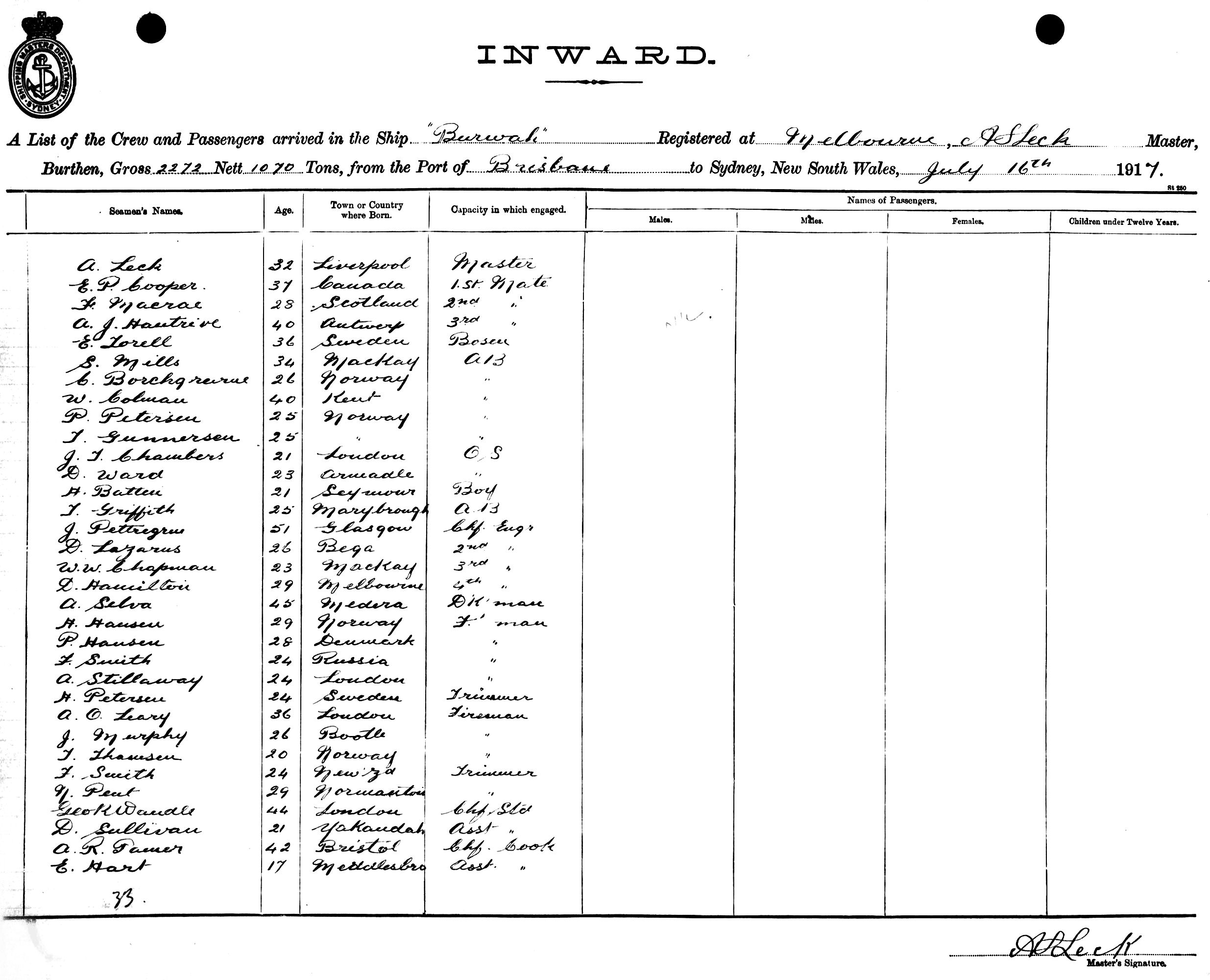 BURWAHOF MELBOURNE, A. S. LECK, MASTER, BURTHEN 2272/1070 TONS FROM THE PORT OF BRISBANE TO SYDNEY, NEW SOUTH WALES, 16TH JULY 1917 |