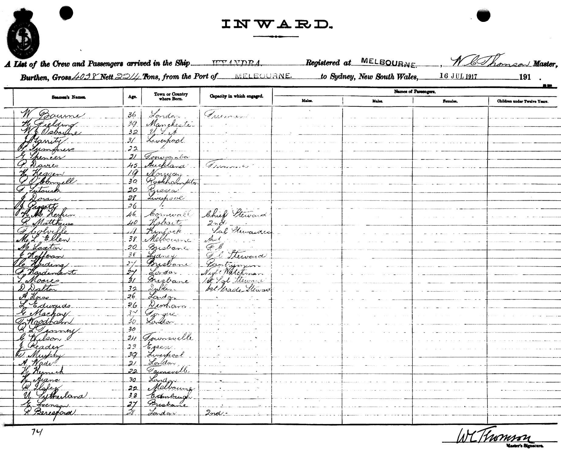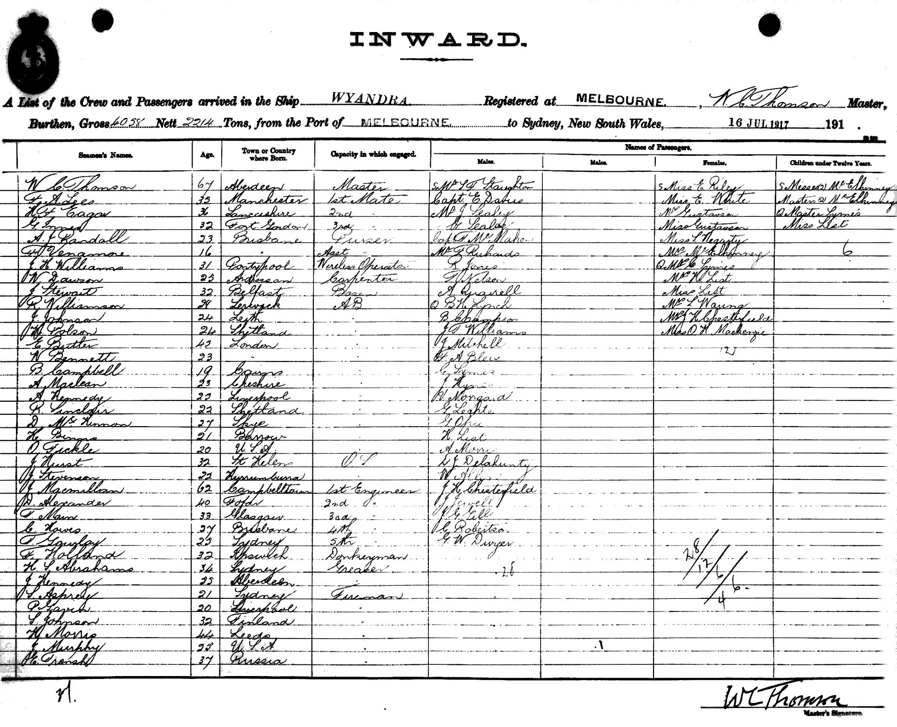 WYANDRAOF MELBOURNE, W. C. THOMSON, MASTER, BURTHEN 4058/2214 TONS FROM THE PORT OF MELBOURNE TO SYDNEY, NEW SOUTH WALES, 16TH JULY 1917 |