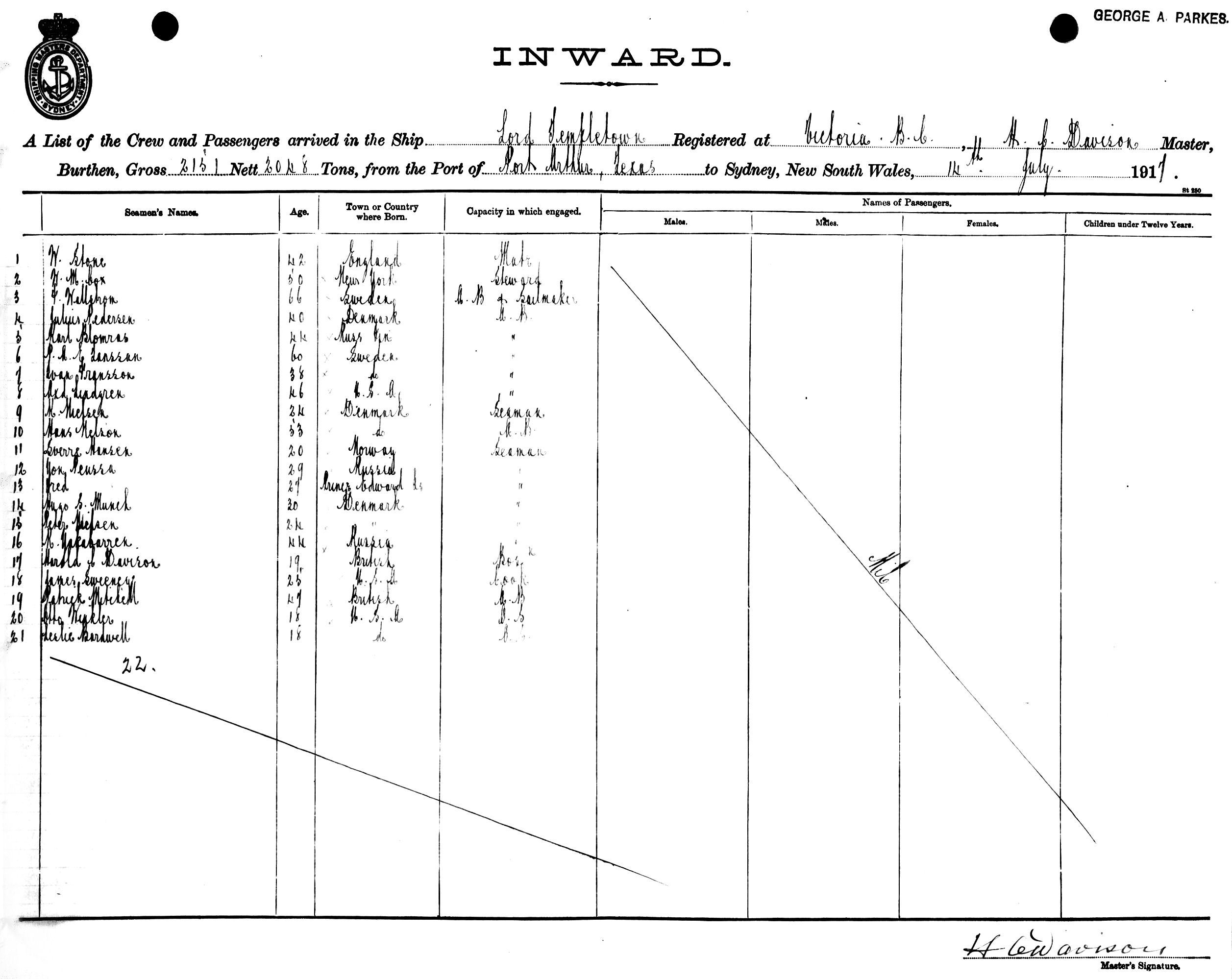 LORD TEMPLETOWNOF VICTORIA B. C. , H. C. DAVISON, MASTER, BURTHEN 2151/2048 TONS FROM THE PORT OF PORT ARTHUR, TEXAS TO SYDNEY, NEW SOUTH WALES, 14TH JULY 1917 |