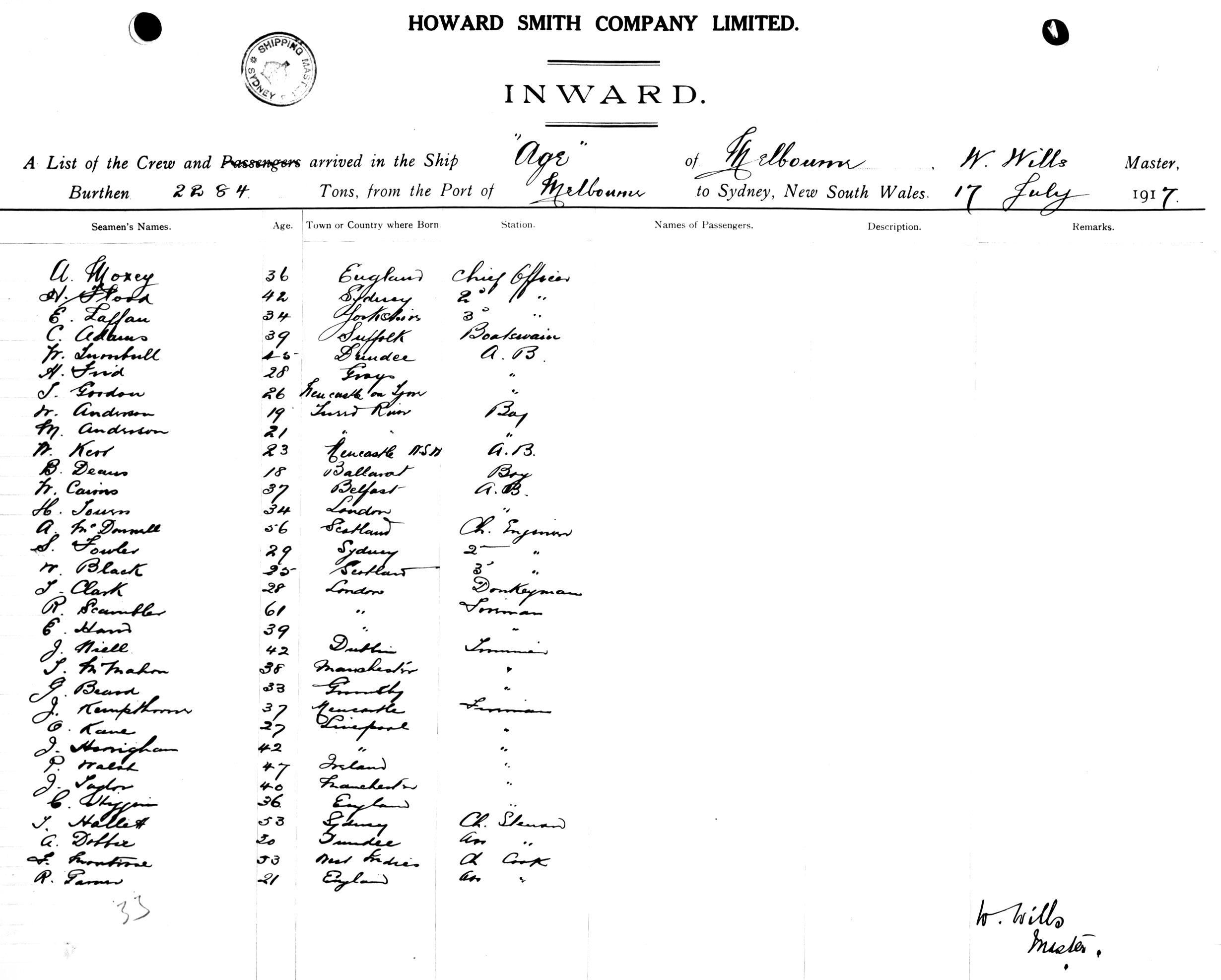 AGEOF MELBOURNE, W. WILLS, MASTER, BURTHEN 2284TONS FROM THE PORT OF MELBOURNE TO SYDNEY, NEW SOUTH WALES, 17TH JULY 1917 |