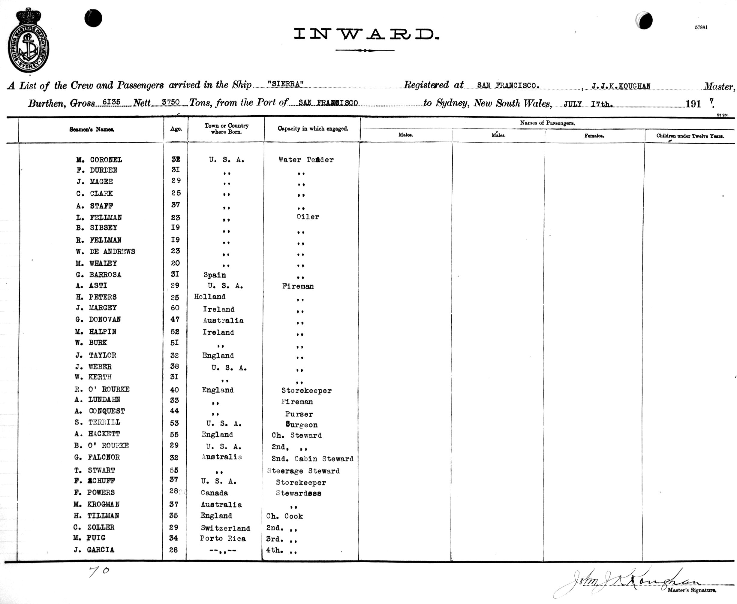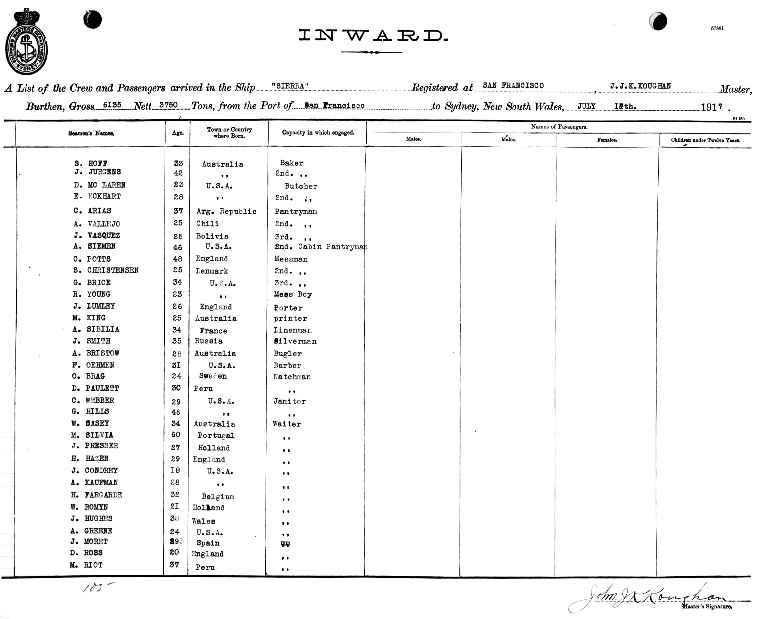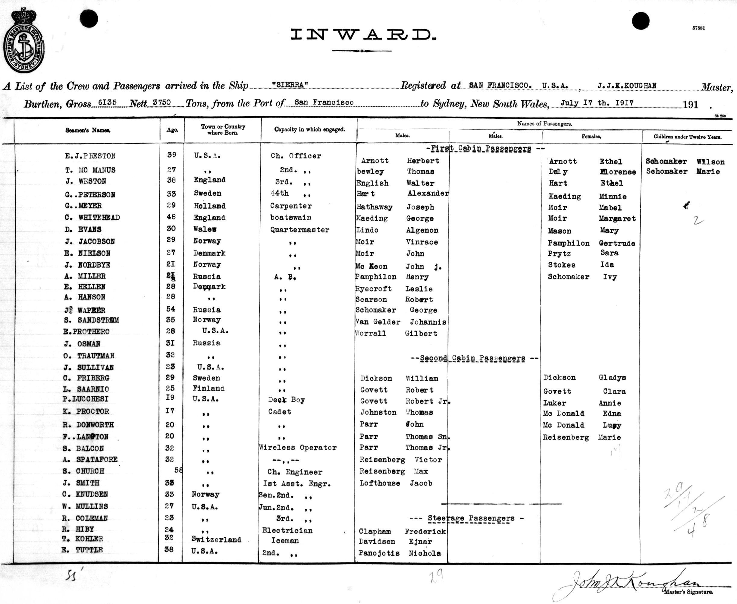 SIERRAOF SAN FRANCISCO, J. J. KOUGHAN, MASTER, BURTHEN 6135/3750 TONS FROM THE PORT OF SAN FRANCISCO TO SYDNEY, NEW SOUTH WALES, 17TH JULY 1917 |