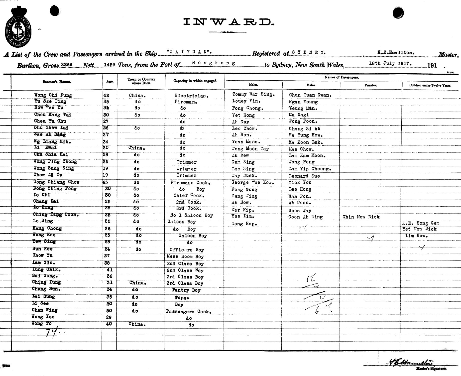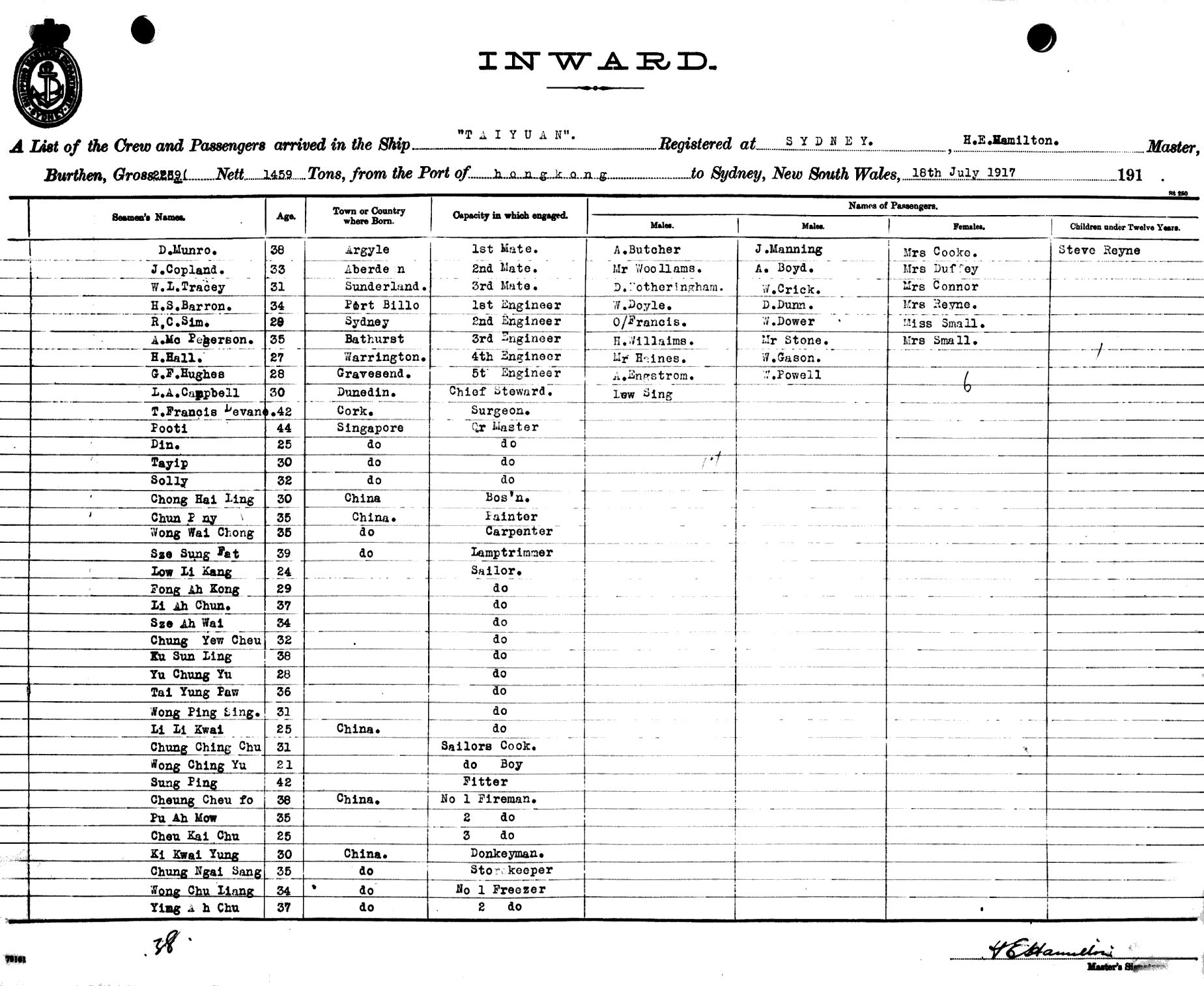 TAIYUANOF SYDNEY, H. E. HAMILTON, MASTER, BURTHEN 2259/1459 TONS FROM THE PORT OF HONGKONG TO SYDNEY, NEW SOUTH WALES, 18TH JULY 1917 |