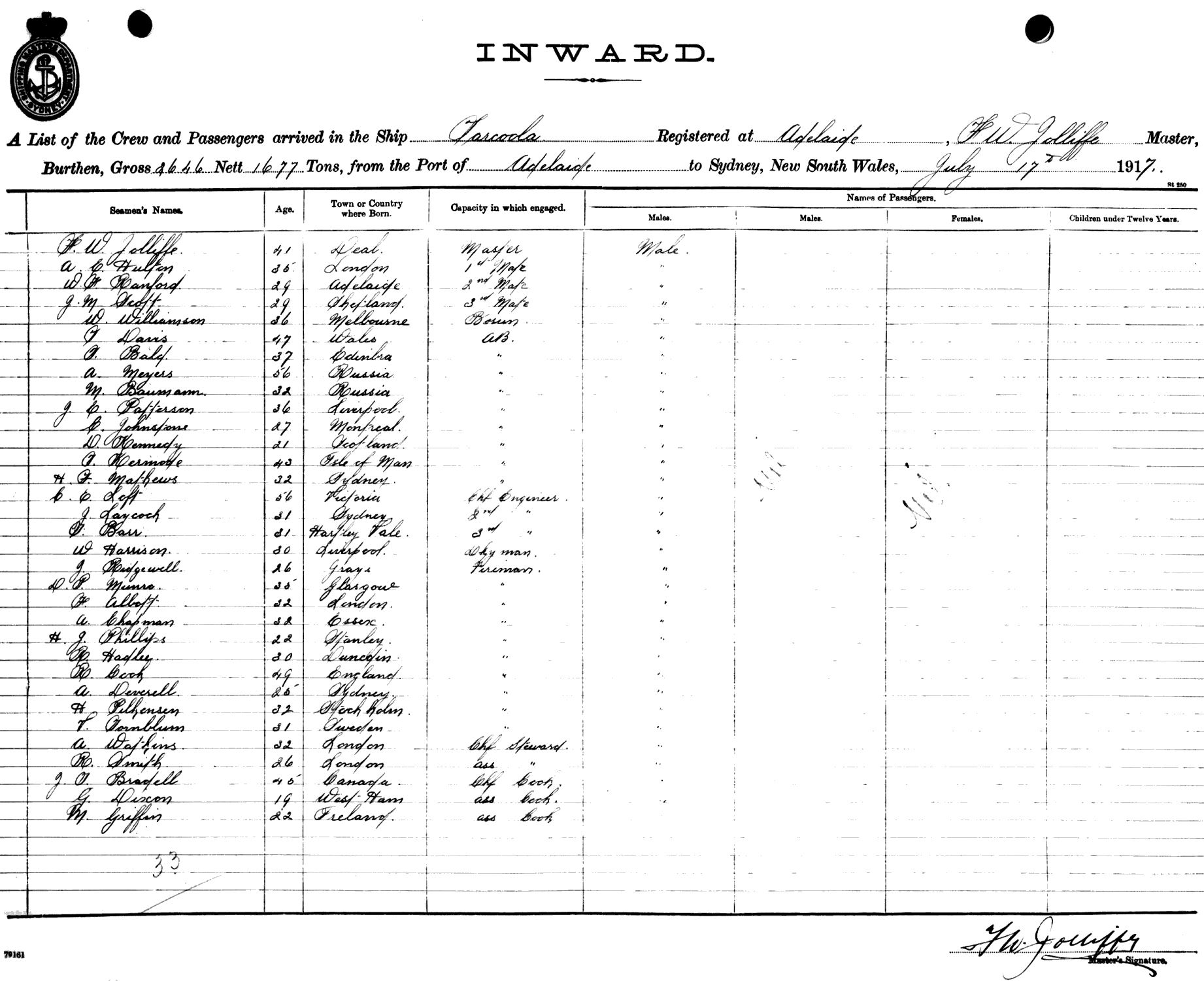 TARCOOLAOF ADELAIDE, F. W. JOLLIFFE, MASTER, BURTHEN 2646/1677 TONS FROM THE PORT OF ADELAIDE TO SYDNEY, NEW SOUTH WALES, 17TH JULY 1917 |