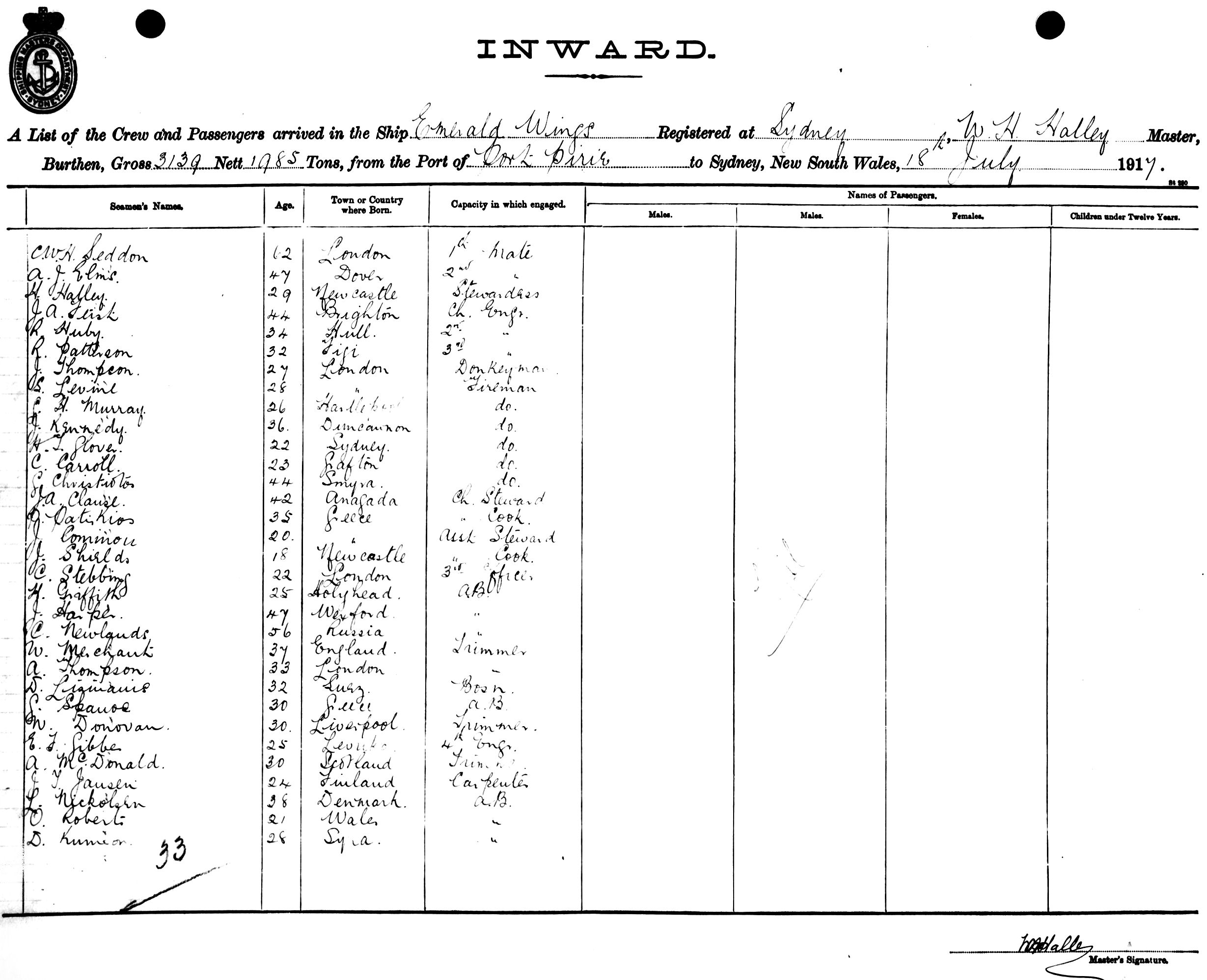 EMERALD WINGSOF SYDNEY, W. H. HALLEY, MASTER, BURTHEN 3139/1985 TONS FROM THE PORT OF PORT PIRIE TO SYDNEY, NEW SOUTH WALES, 18TH JULY 1917 |