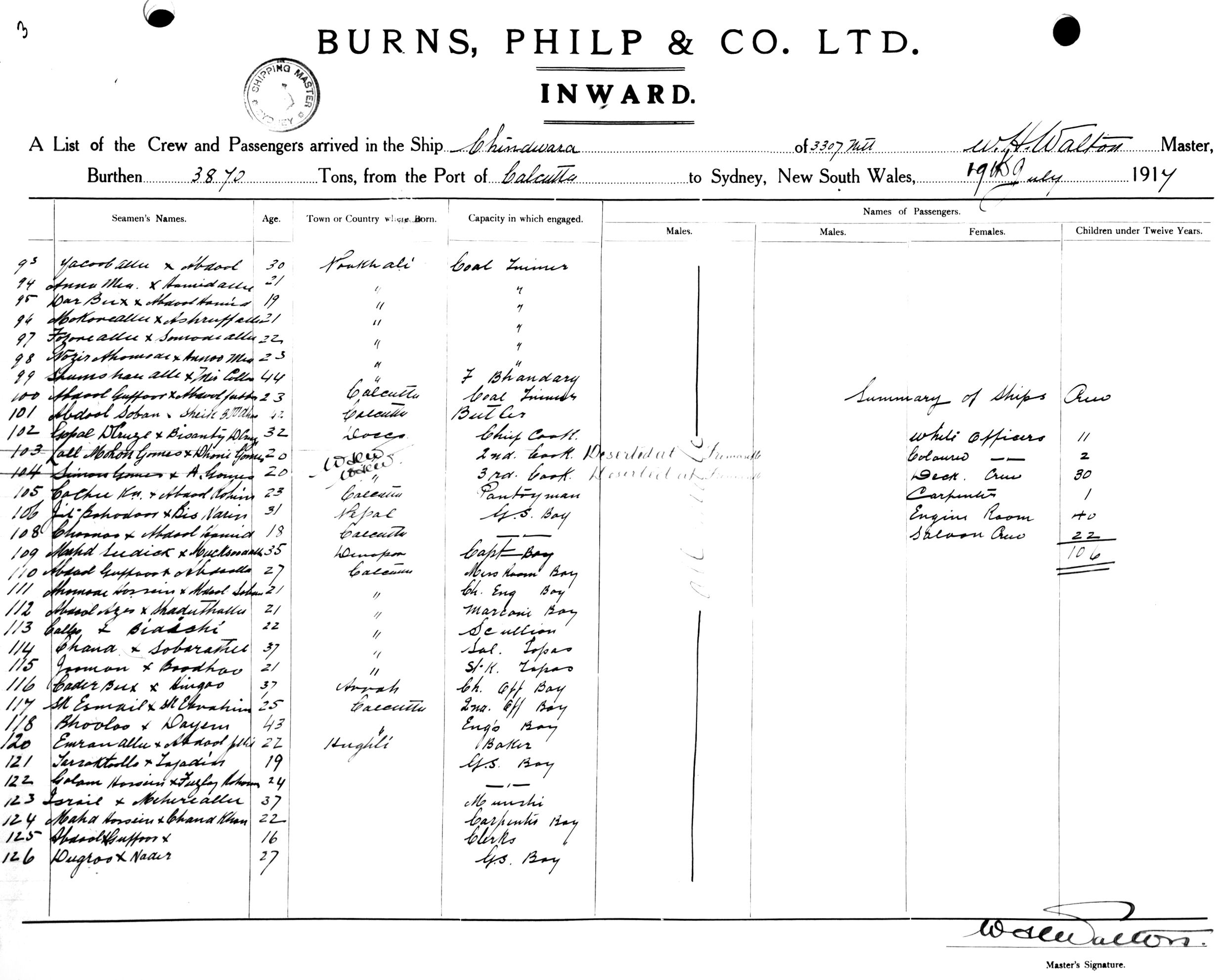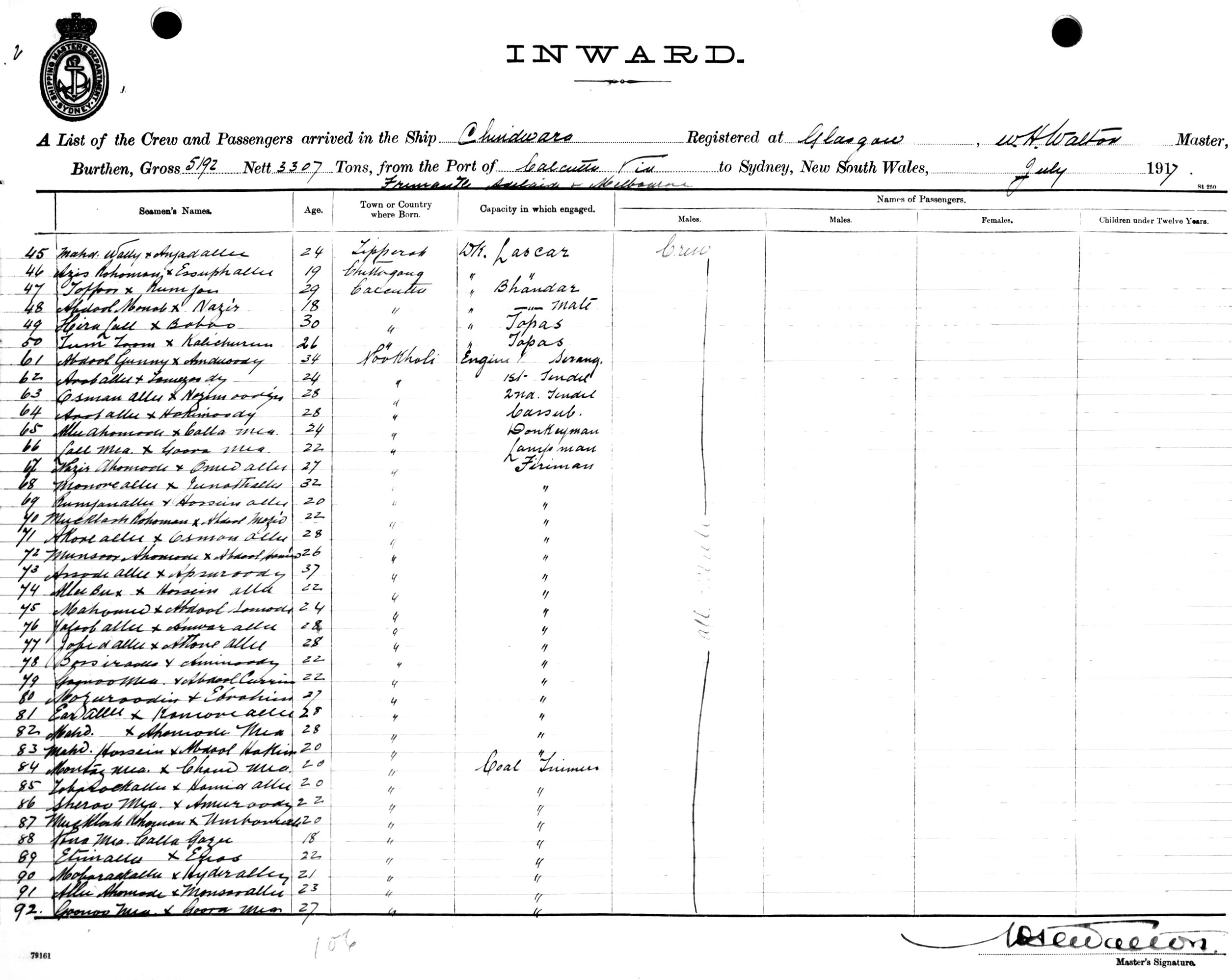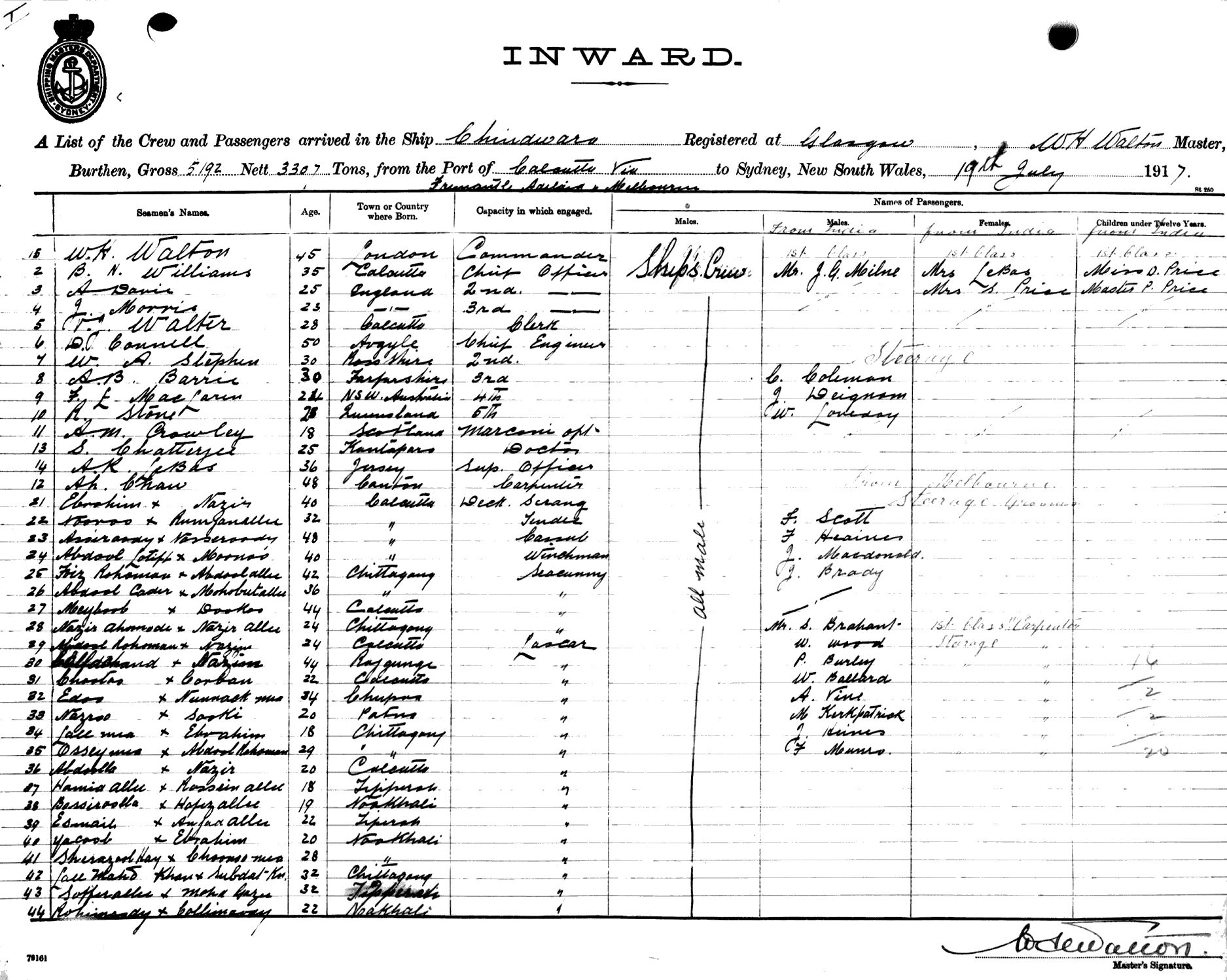 CHINDWARAOF GLASGOW, W. H. WALTON, MASTER, BURTHEN 5192/3307 TONS FROM THE PORT OF CALCUTTA VIA FREMANTLE, ADELAIDE & MELBOURNE TO SYDNEY, NEW SOUTH WALES, 19TH JULY 1917 |