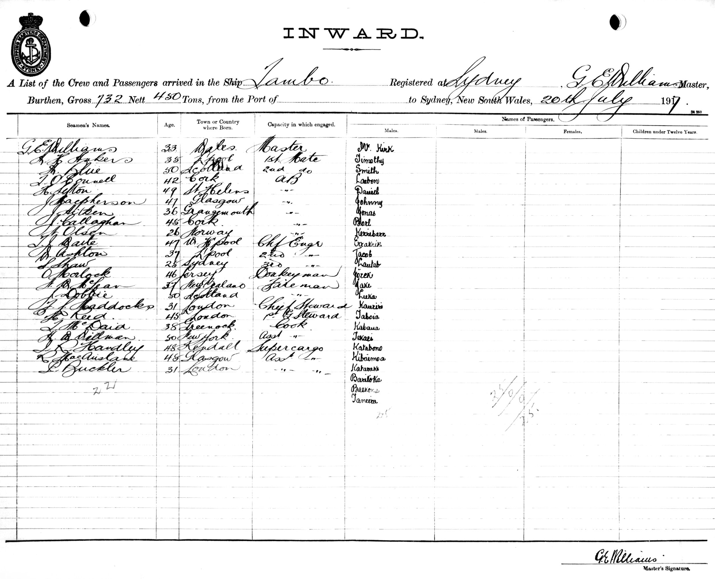 TAMBOOF SYDNEY, G. E. WILLIAMS, MASTER, BURTHEN 732/450 TONS FROM THE PORT OF (SOUTH PACIFIC ISLANDS) TO SYDNEY, NEW SOUTH WALES, 20TH JULY 1917 |