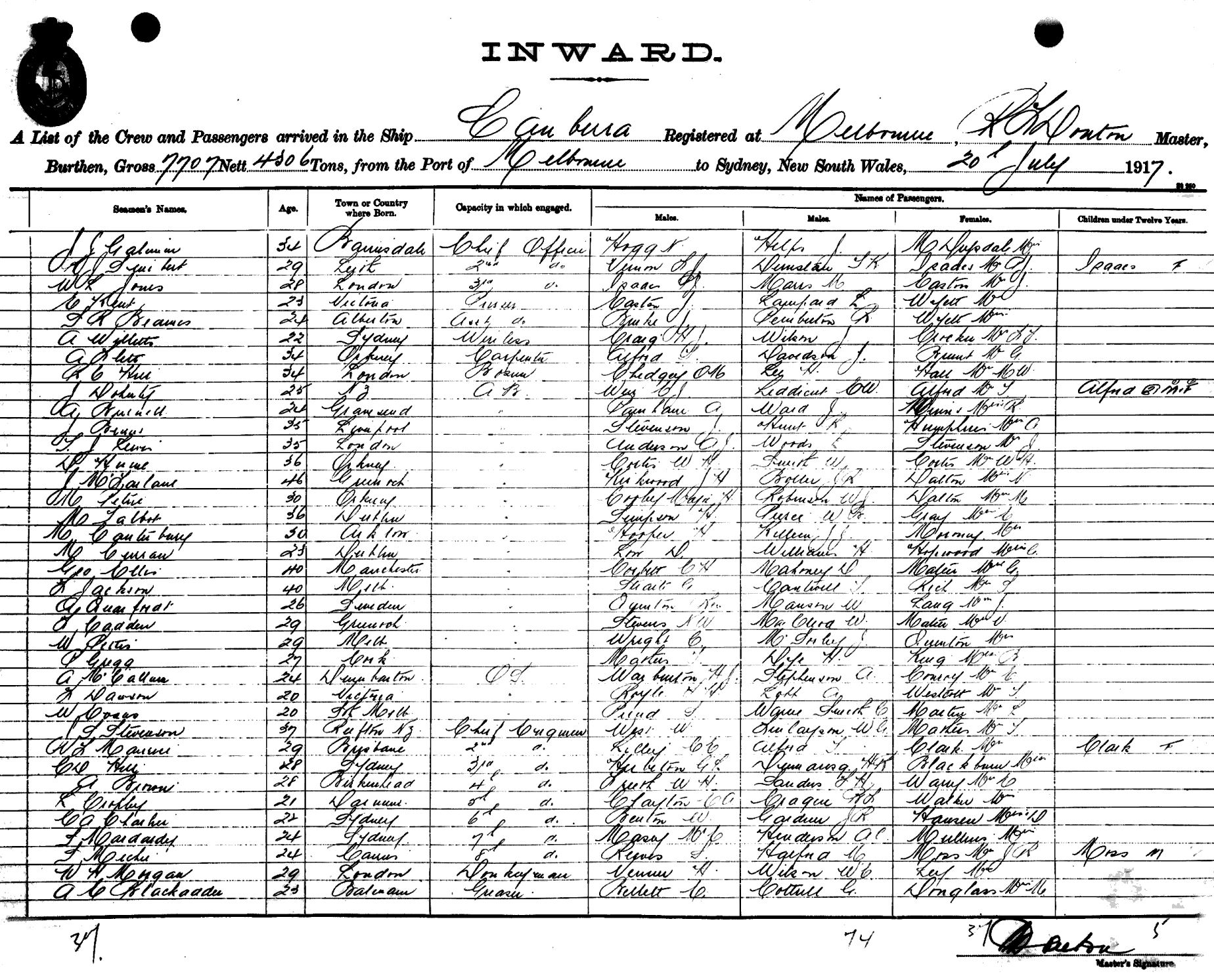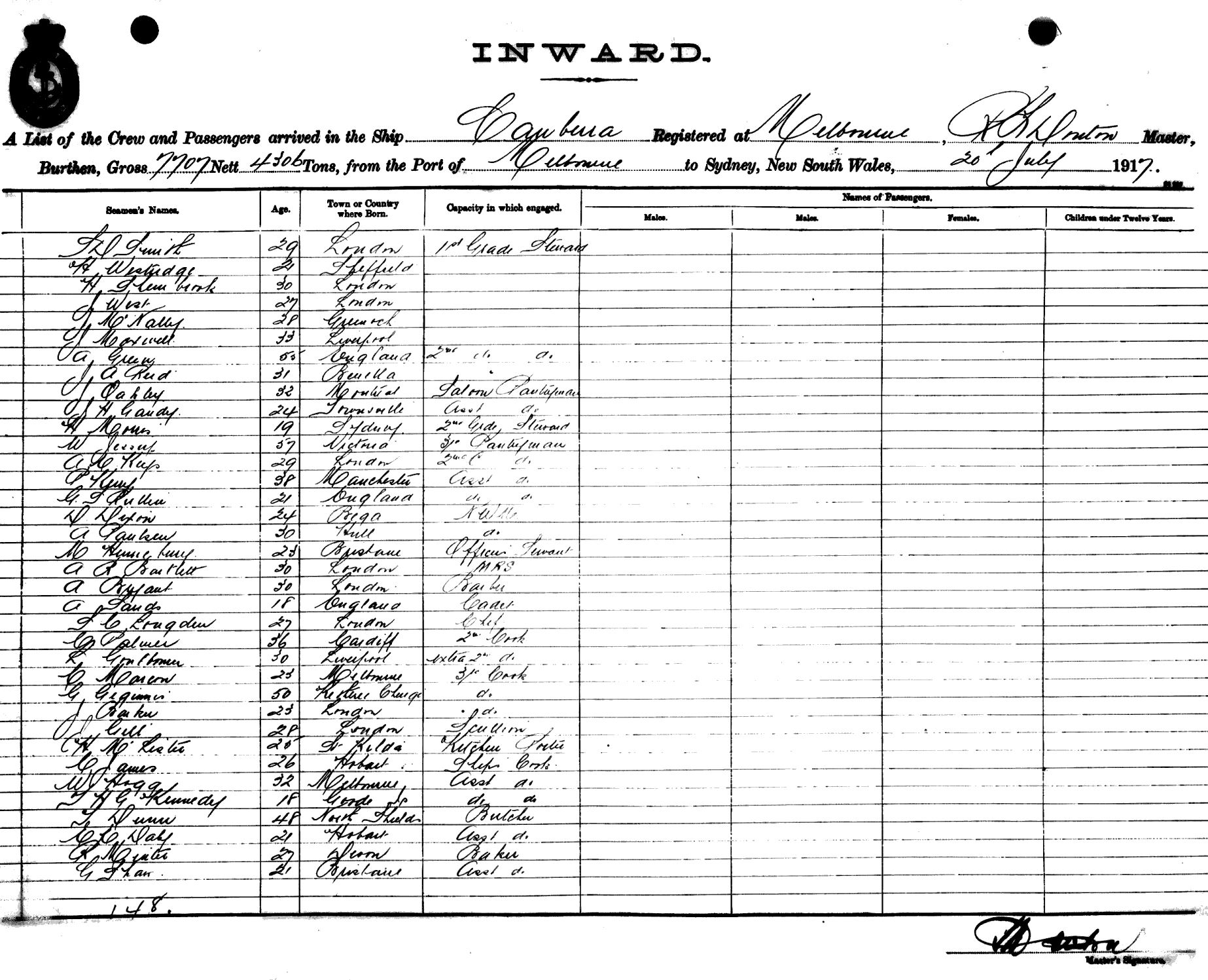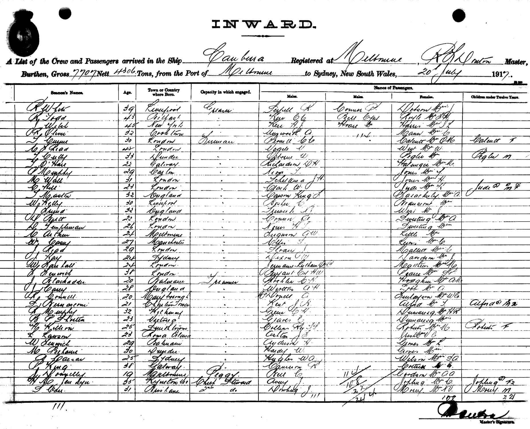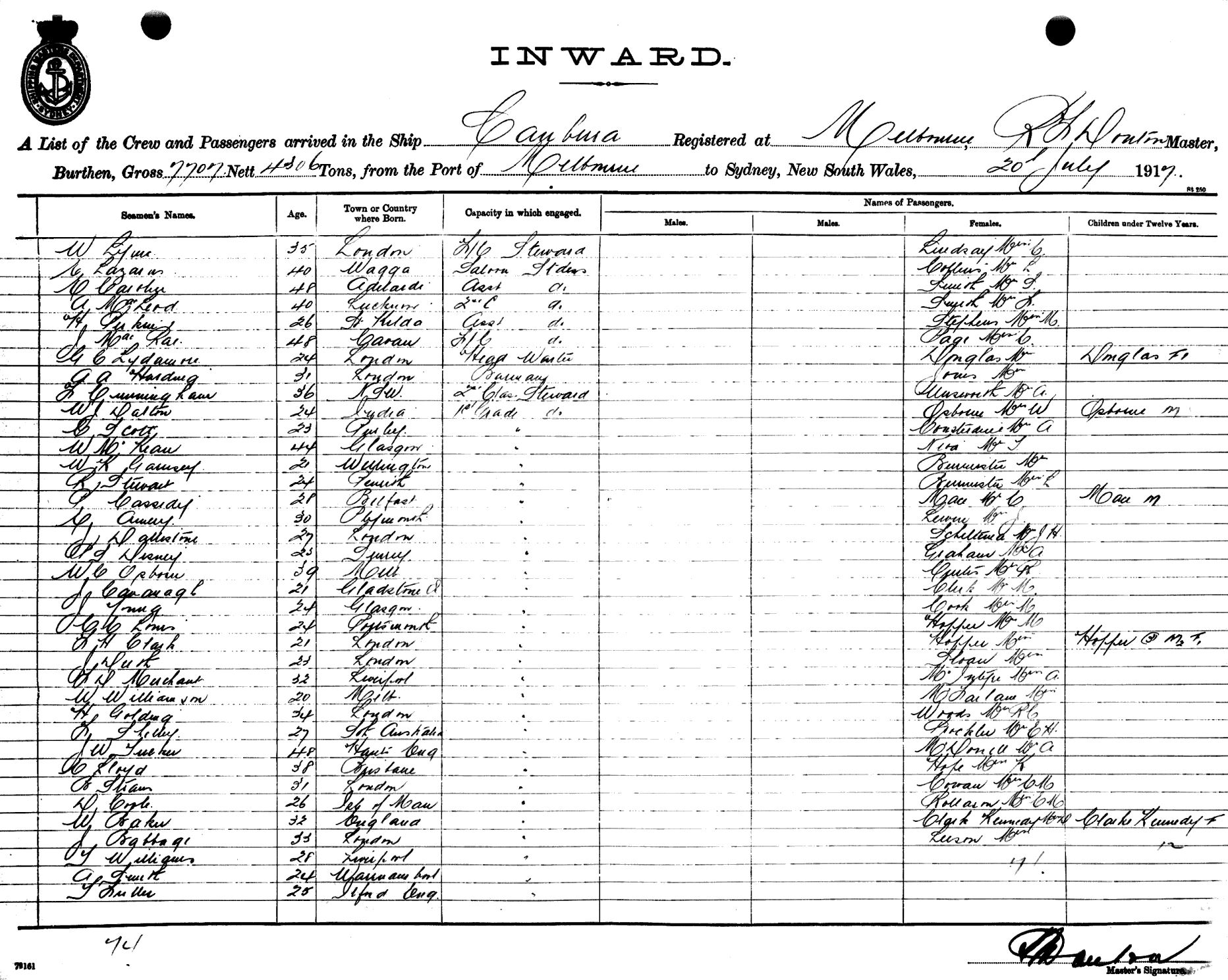 Mariners and ships in Australian Waters | CANBERRAOF MELBOURNE, R. F. DOUTON, MASTER, BURTHEN 7707/4306 TONS FROM THE PORT OF MELBOURNE TO SYDNEY, NEW SOUTH WALES, 20TH JULY 1917 |