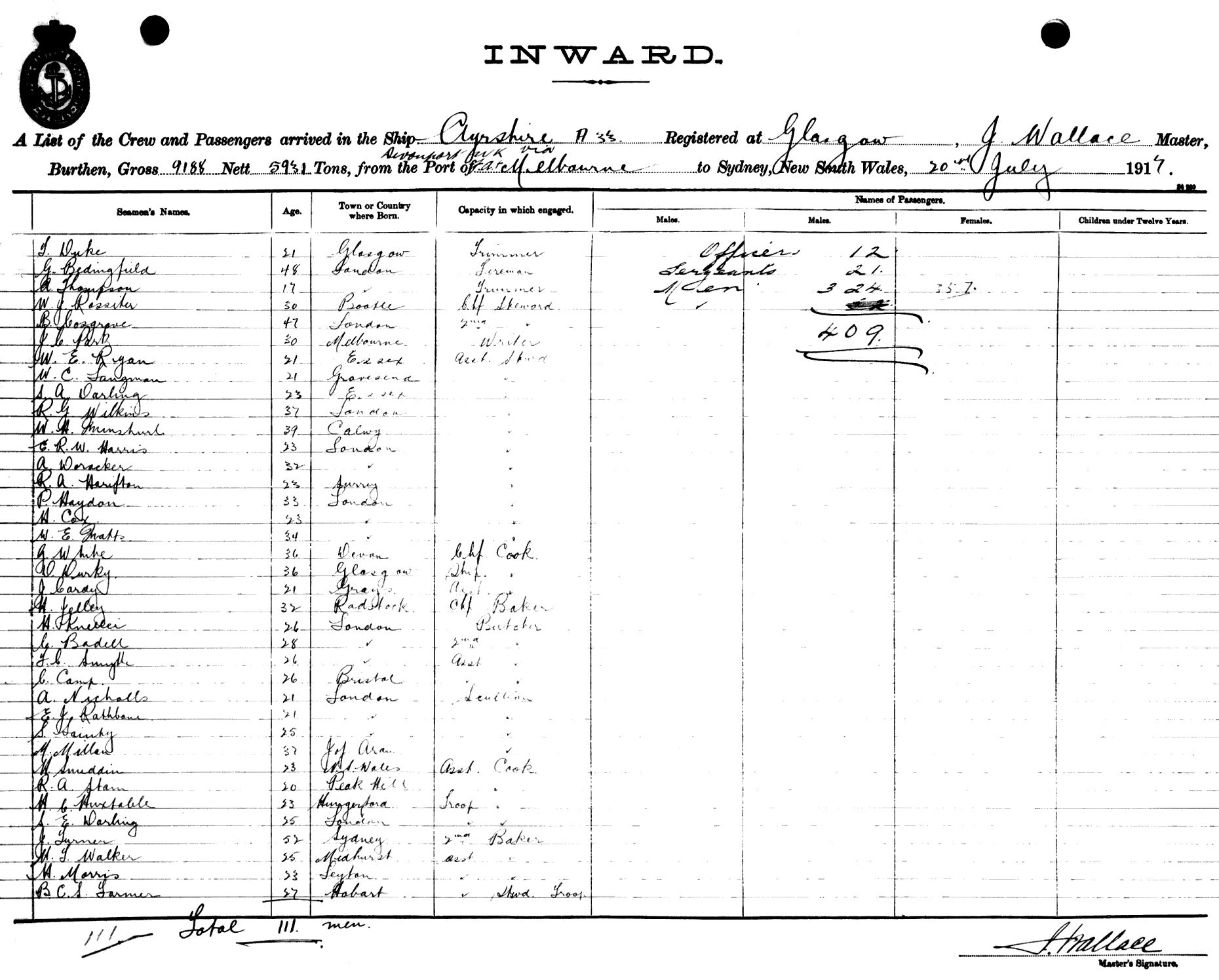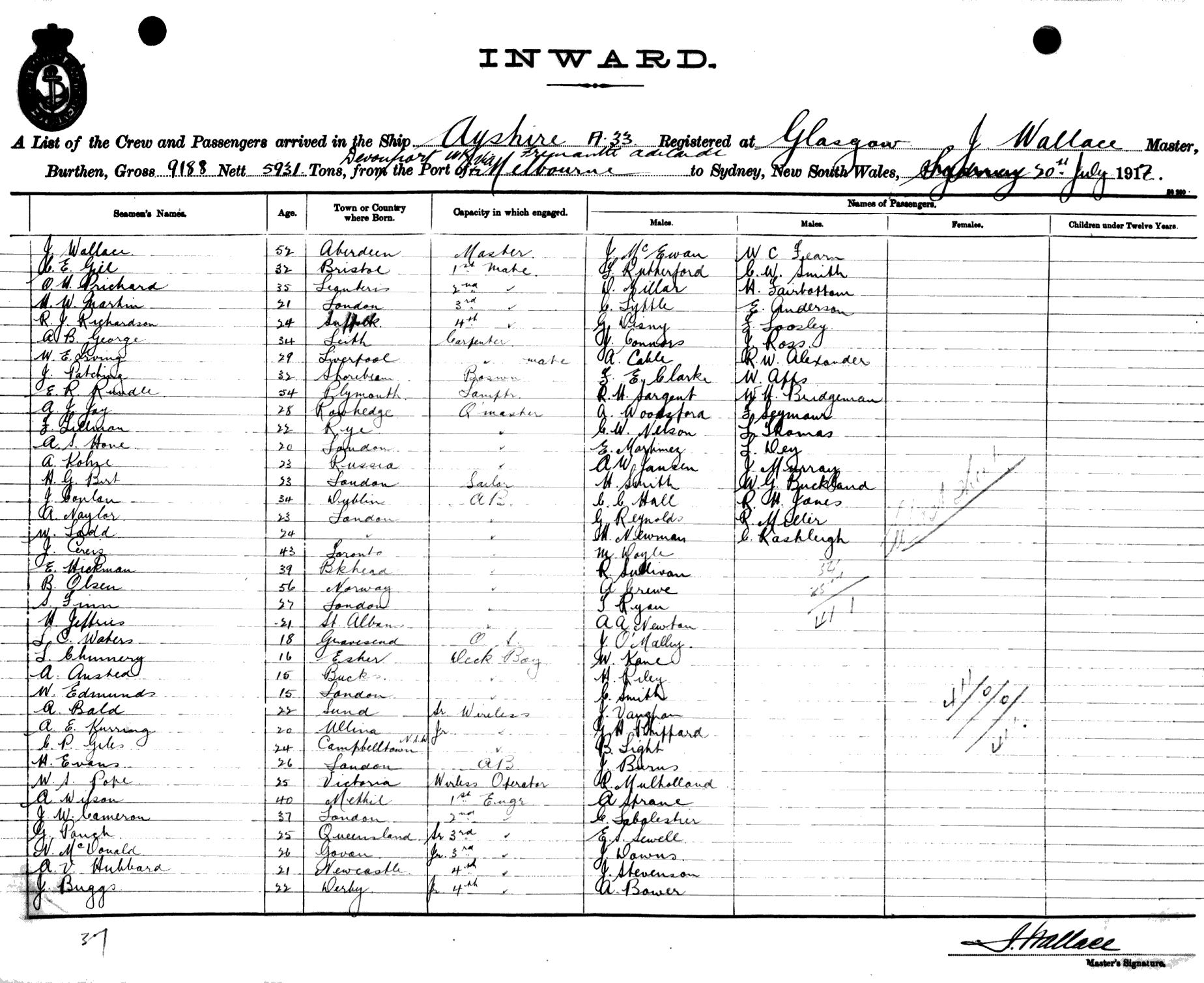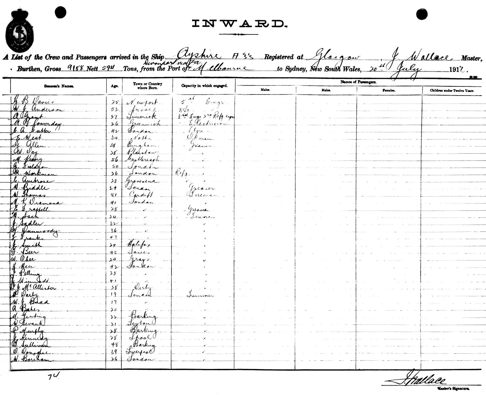 AYRSHIREOF GLASGOW, J. WALLACE, MASTER, BURTHEN 9188/5931 TONS FROM THE PORT OF DEVONPORT, U.K. via FREMANTLE, ADELAIDE & MELBOURNE TO SYDNEY, NEW SOUTH WALES, 20TH JULY 1917 |