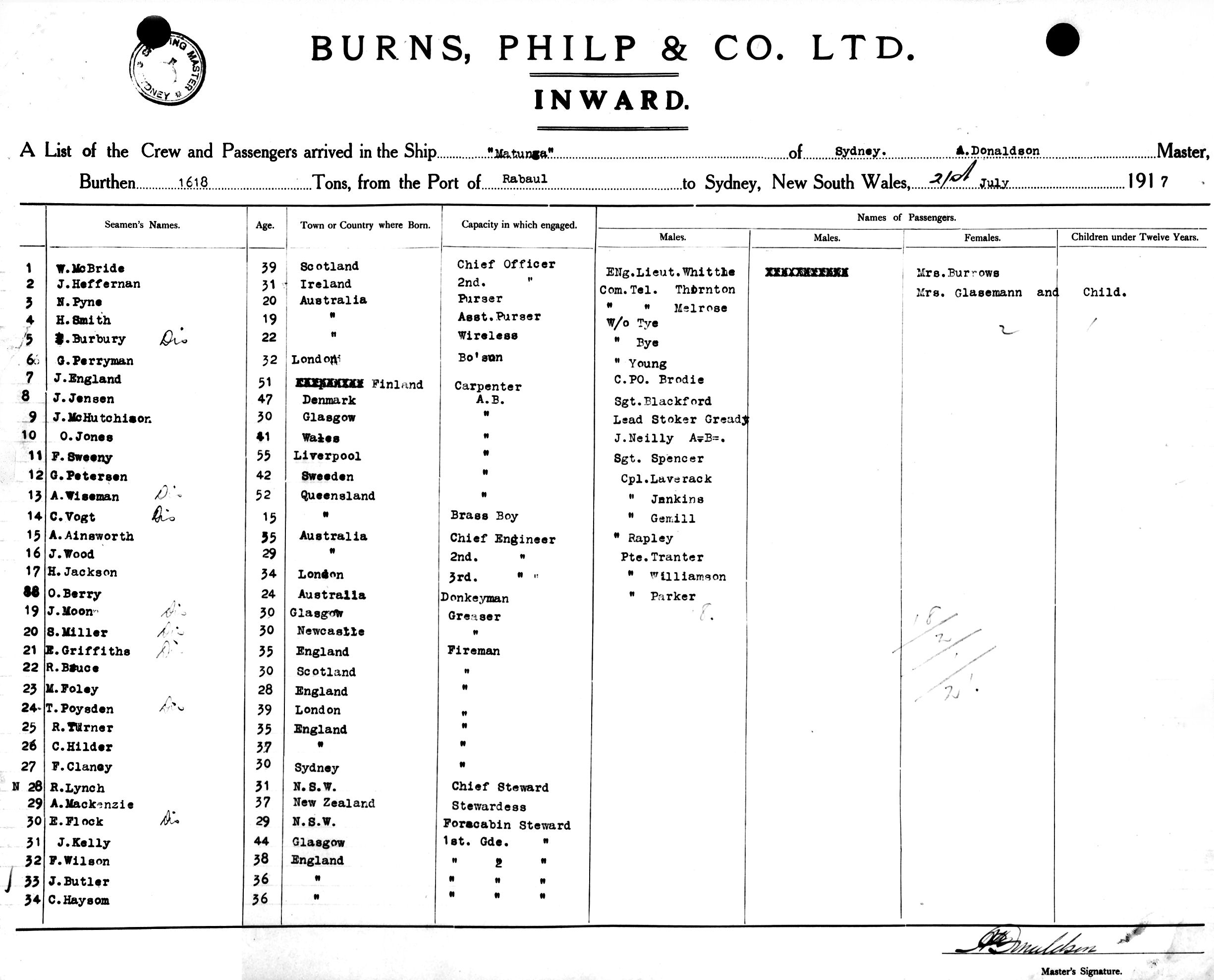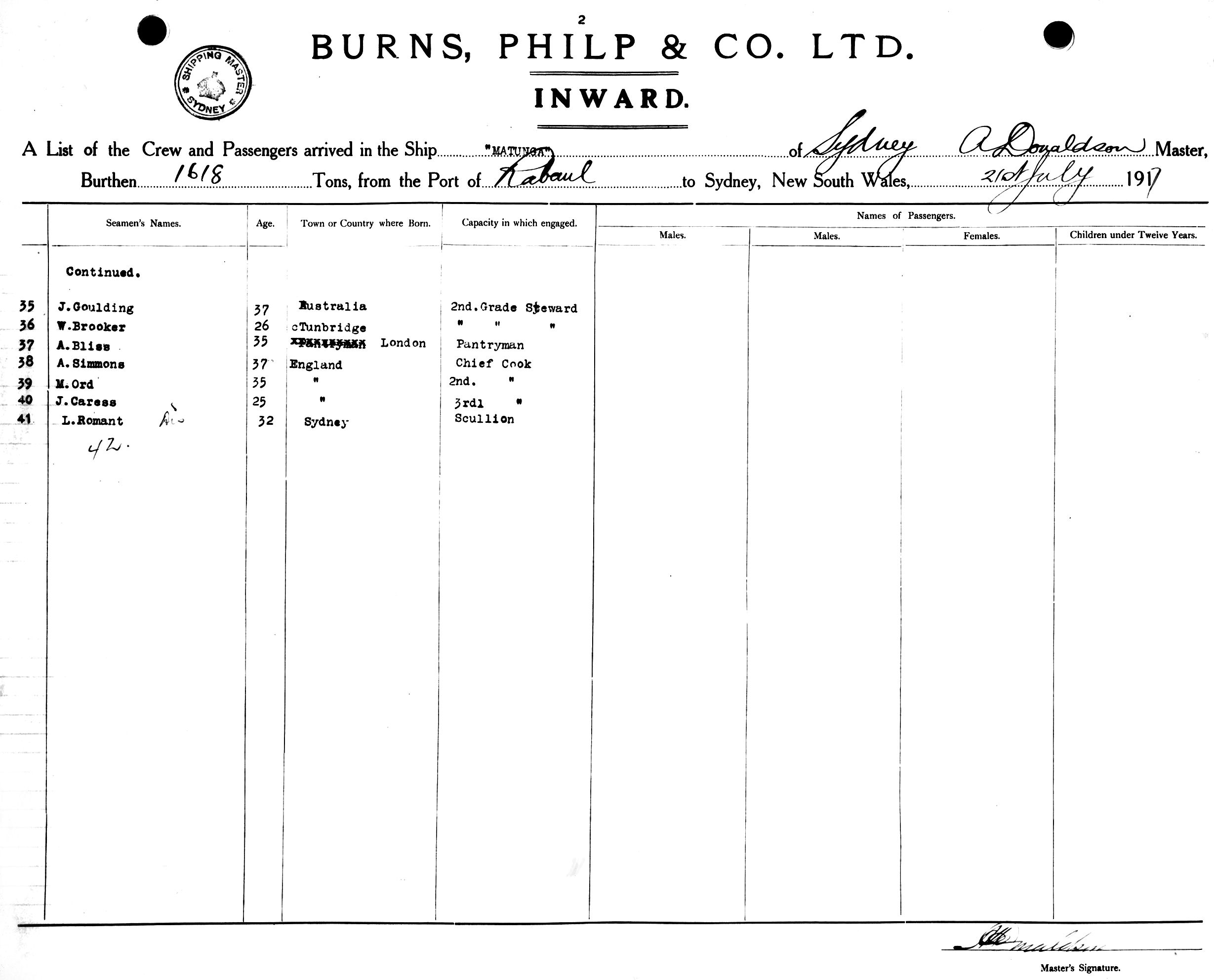 MATUNGAOF SYDNEY, A. DONALDSON, MASTER, BURTHEN 1618 TONS FROM THE PORT OF RABAUL TO SYDNEY, NEW SOUTH WALES, 21ST JULY 1917 |