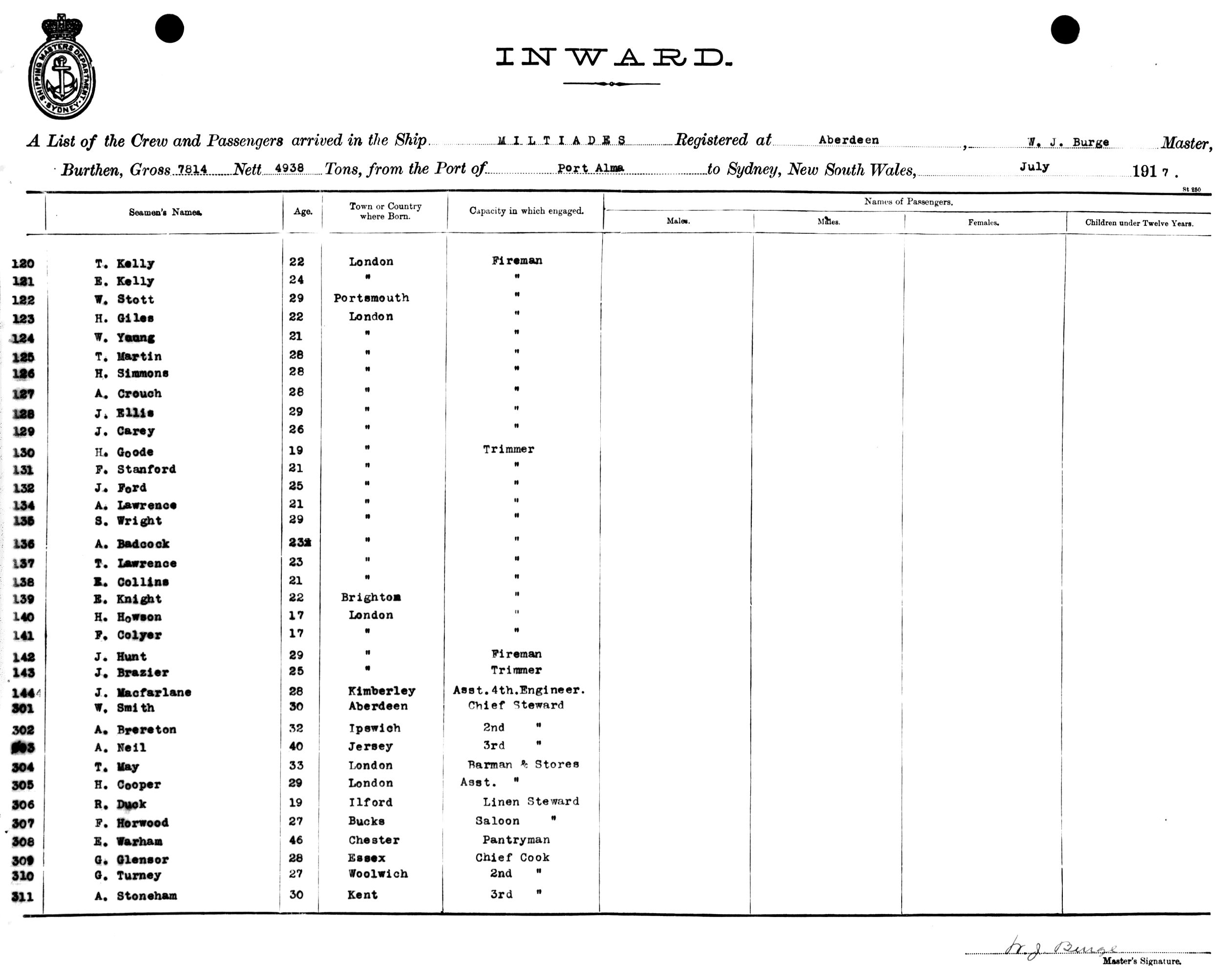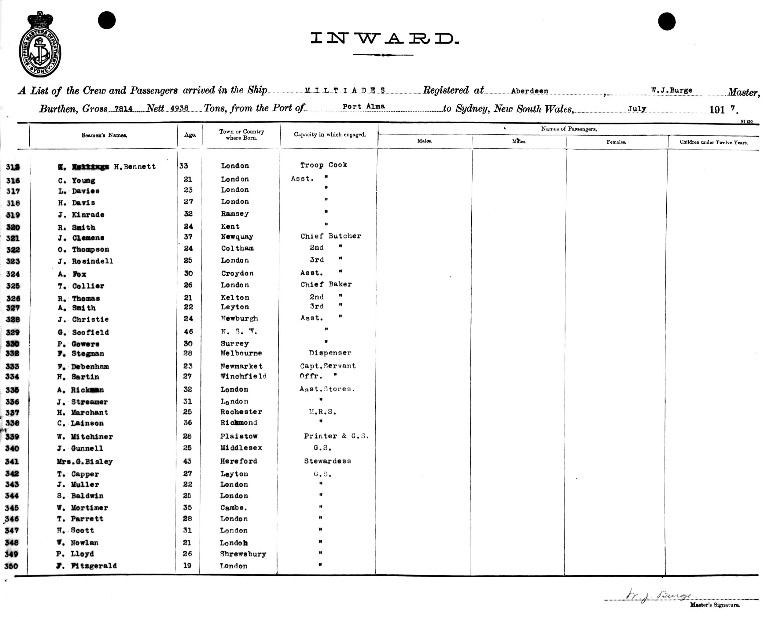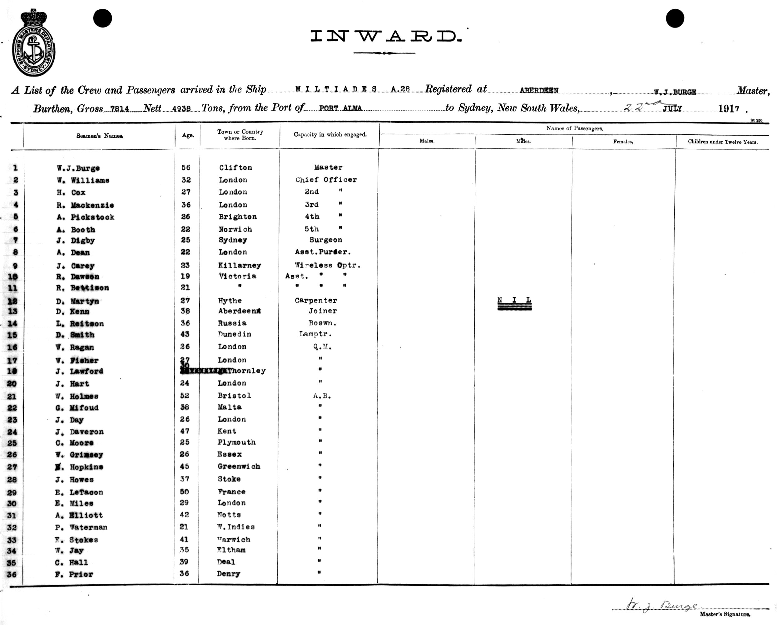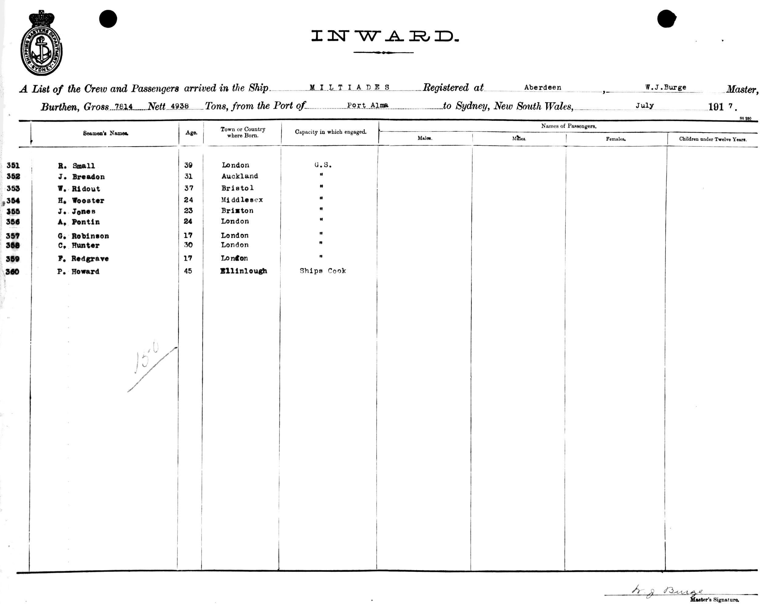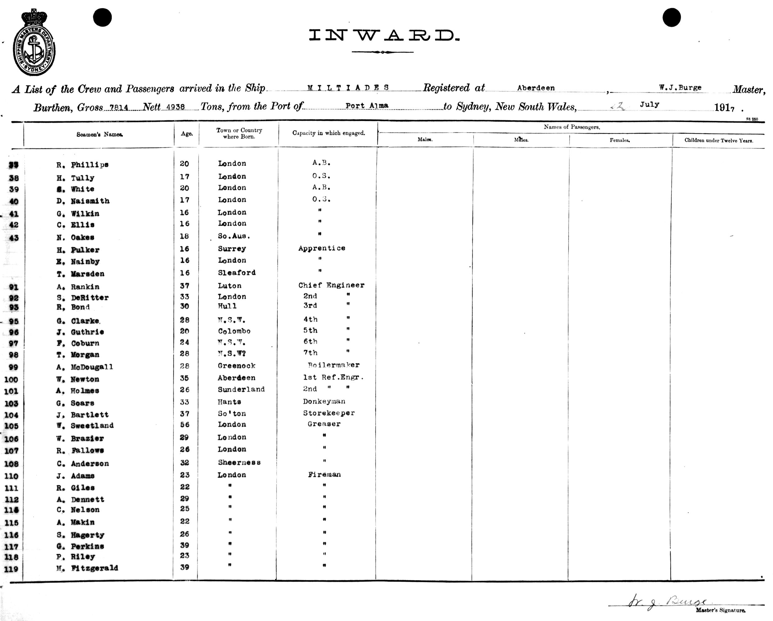 MILTIADESOF ABERDEEN, W. J. BURGE, MASTER, BURTHEN 7814/4938 TONS FROM THE PORT OF PORT ALMA, QUEENSLAND TO SYDNEY, NEW SOUTH WALES, 22ND JULY 1917 |