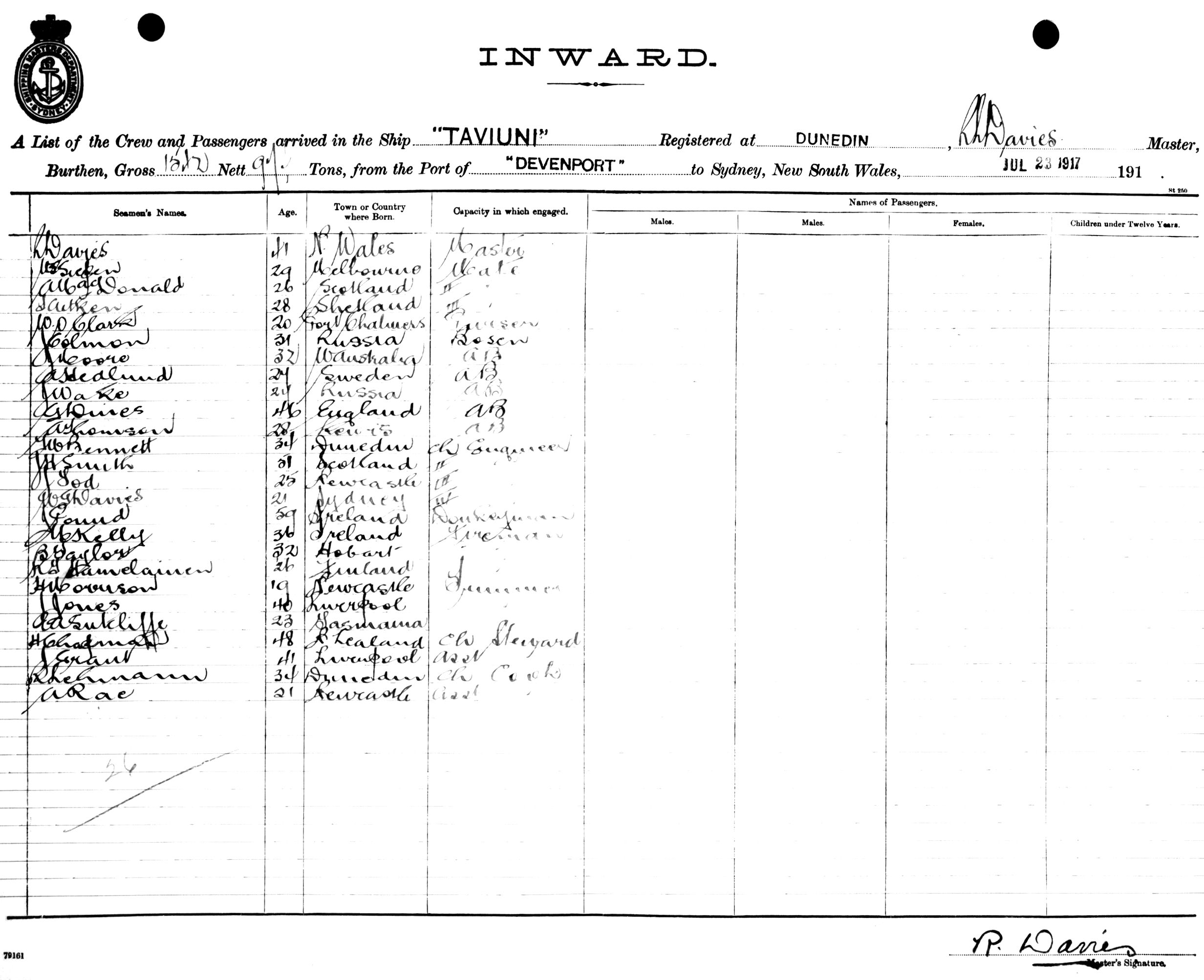 TAVIUNIOF DUNEDIN, R. L. DAVIES, MASTER, BURTHEN 1542/978 TONS FROM THE PORT OF DEVONPORT TO SYDNEY, NEW SOUTH WALES, 23RD JULY 1917 |