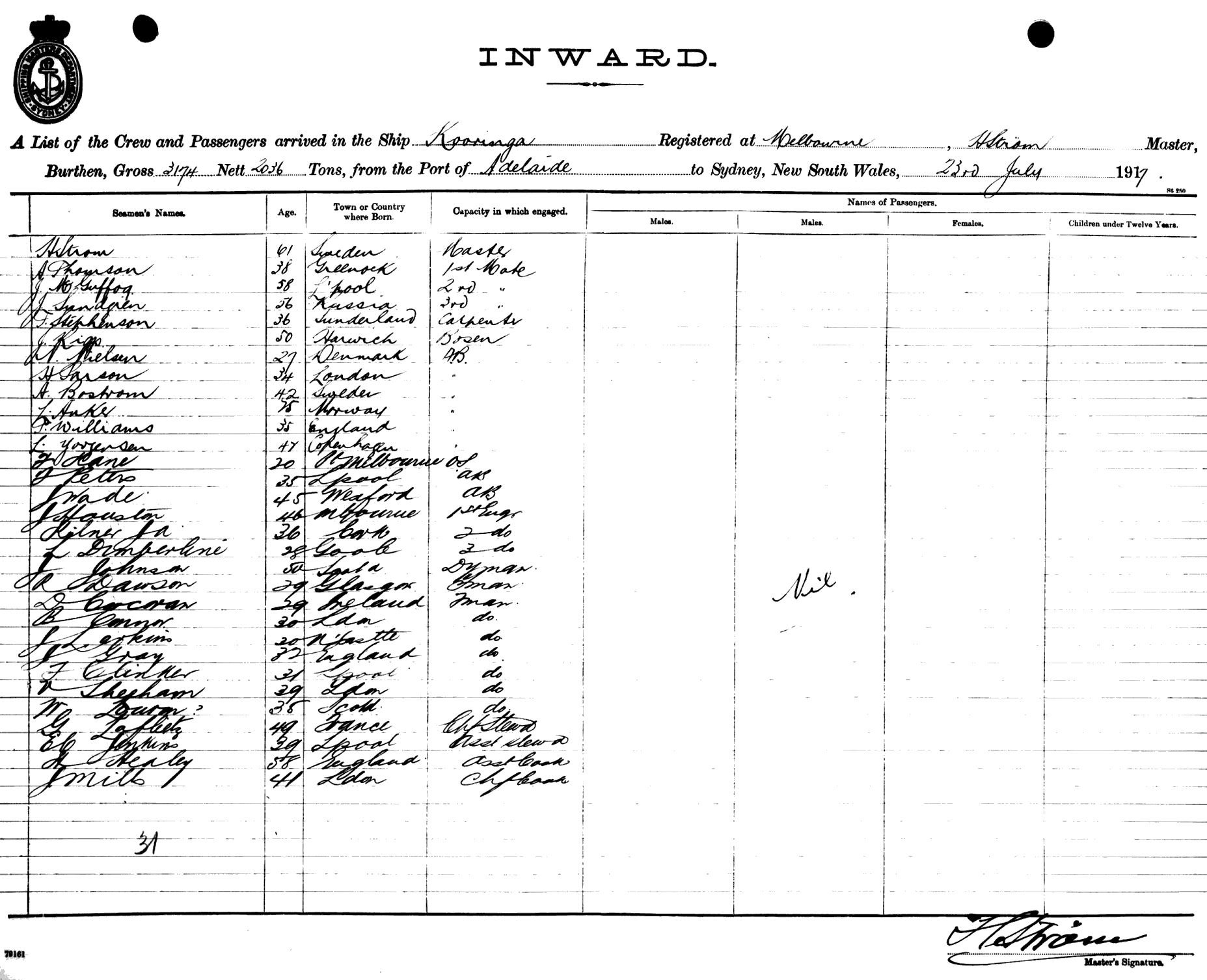 KOORINGAOF MELBOURNE, H. STROM, MASTER, BURTHEN 3174/2036 TONS FROM THE PORT OF ADELAIDE TO SYDNEY, NEW SOUTH WALES, 23RD JULY 1917 |