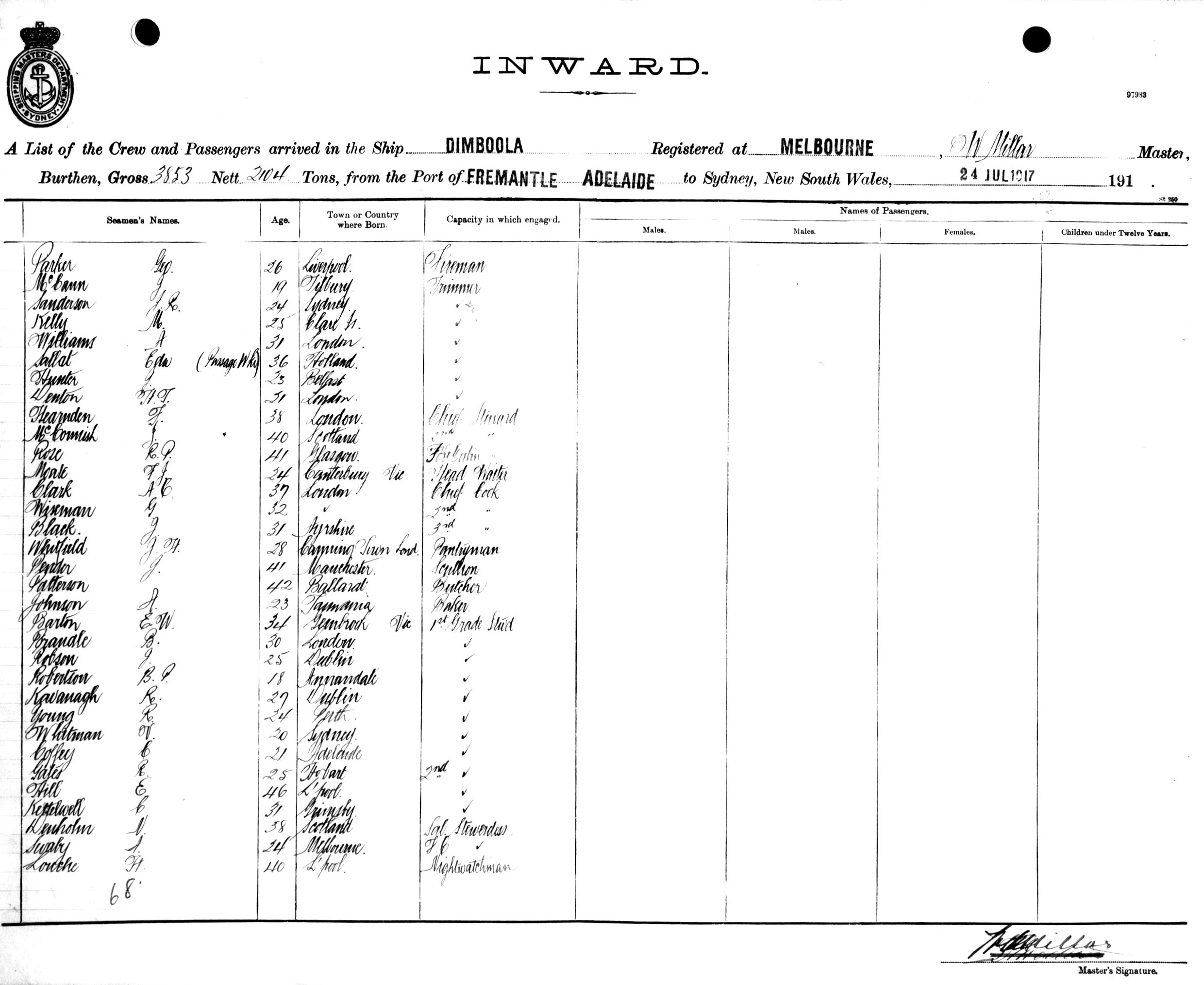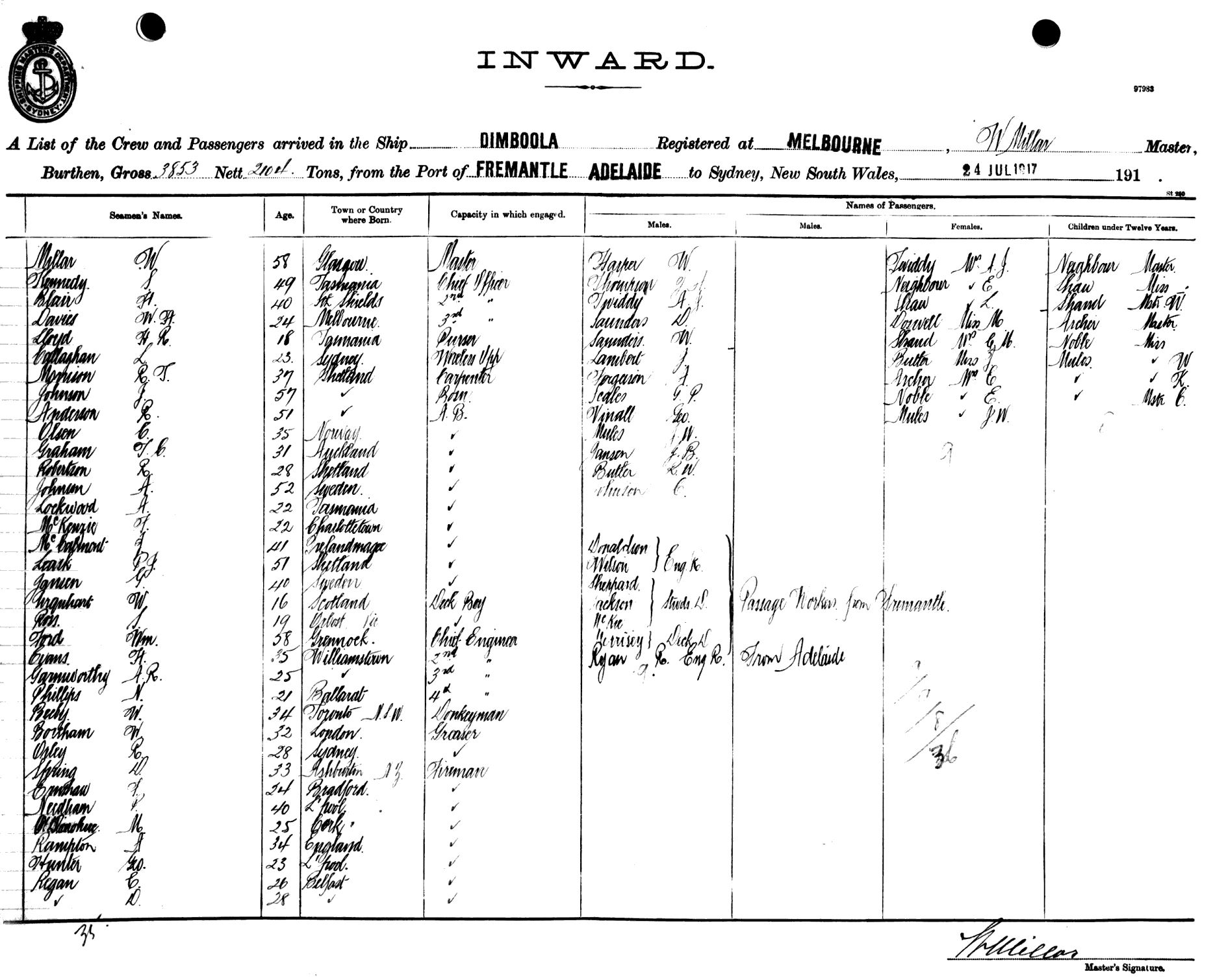 Mariners and ships in Australian Waters | DIMBOOLAOF MELBOUNE, W. MILLAR, MASTER, BURTHEN 3853/2104 TONS FROM THE PORTS OF FREMANTLE & ADELAIDE TO SYDNEY, NEW SOUTH WALES, 24TH JULY 1917 |