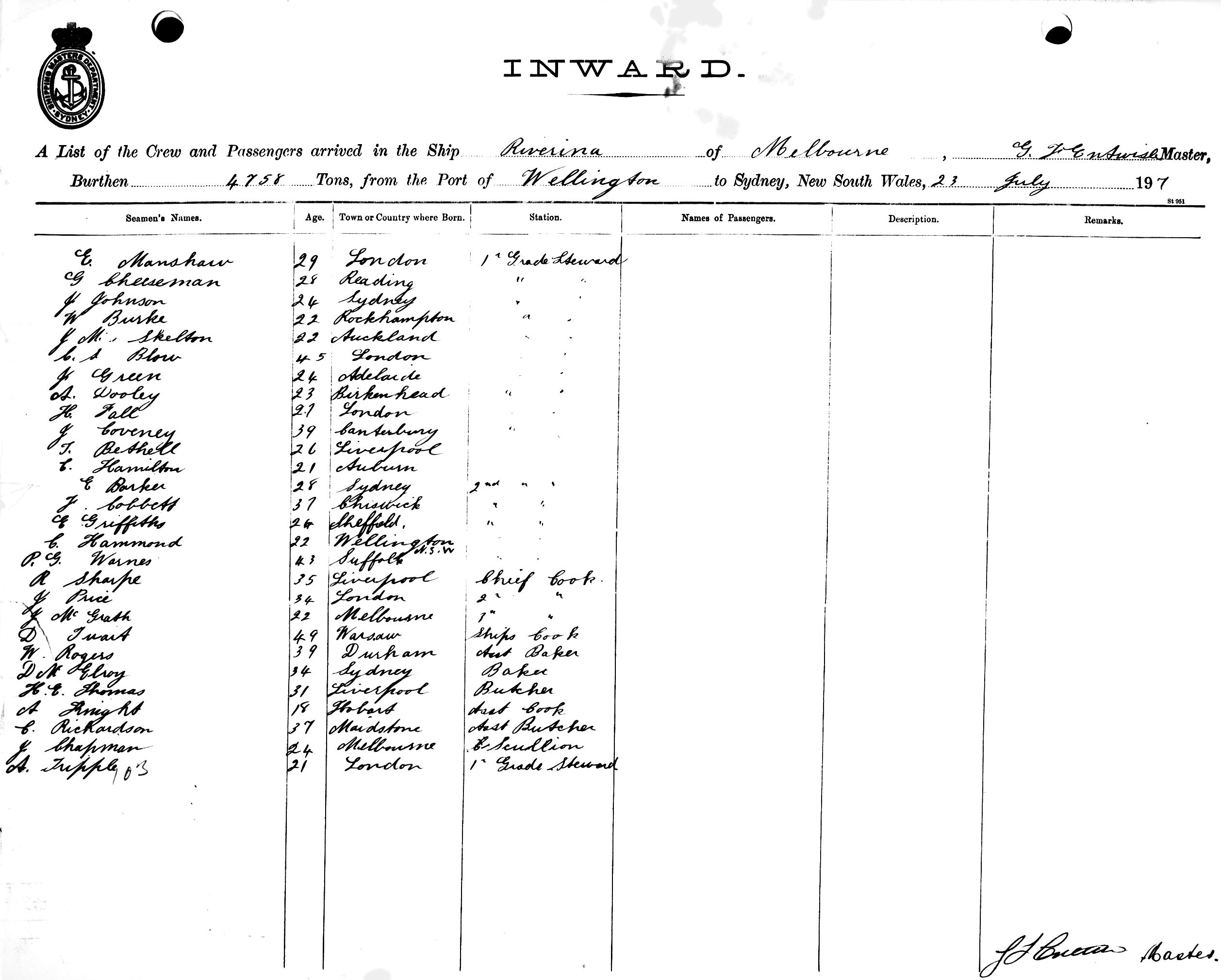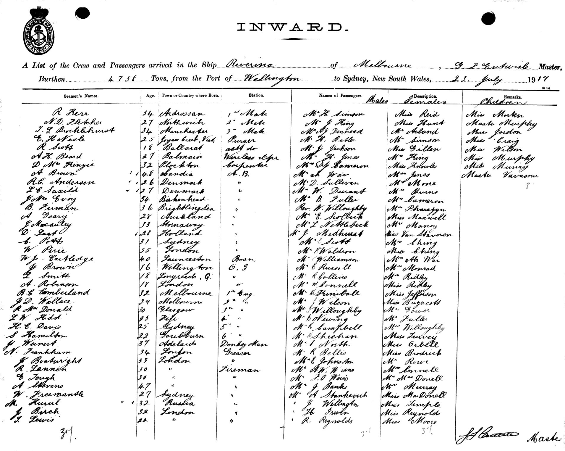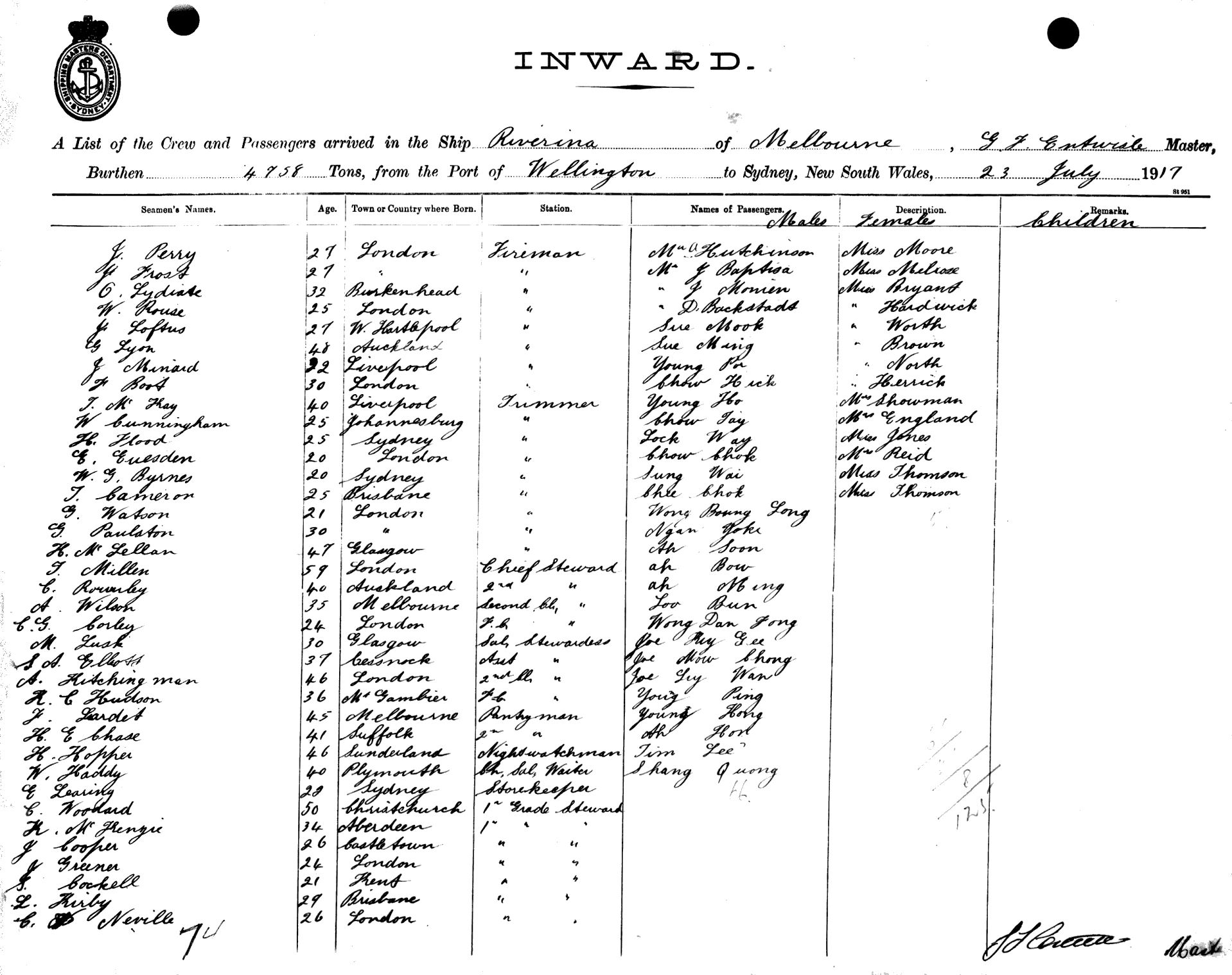Mariners and ships in Australian Waters | RIVERINAOF MELBOURNE, G. F. ENTWISLE, MASTER, BURTHEN 4758 TONS FROM THE PORT OF WELLINGTON TO SYDNEY, NEW SOUTH WALES, 23RD JULY 1917 |