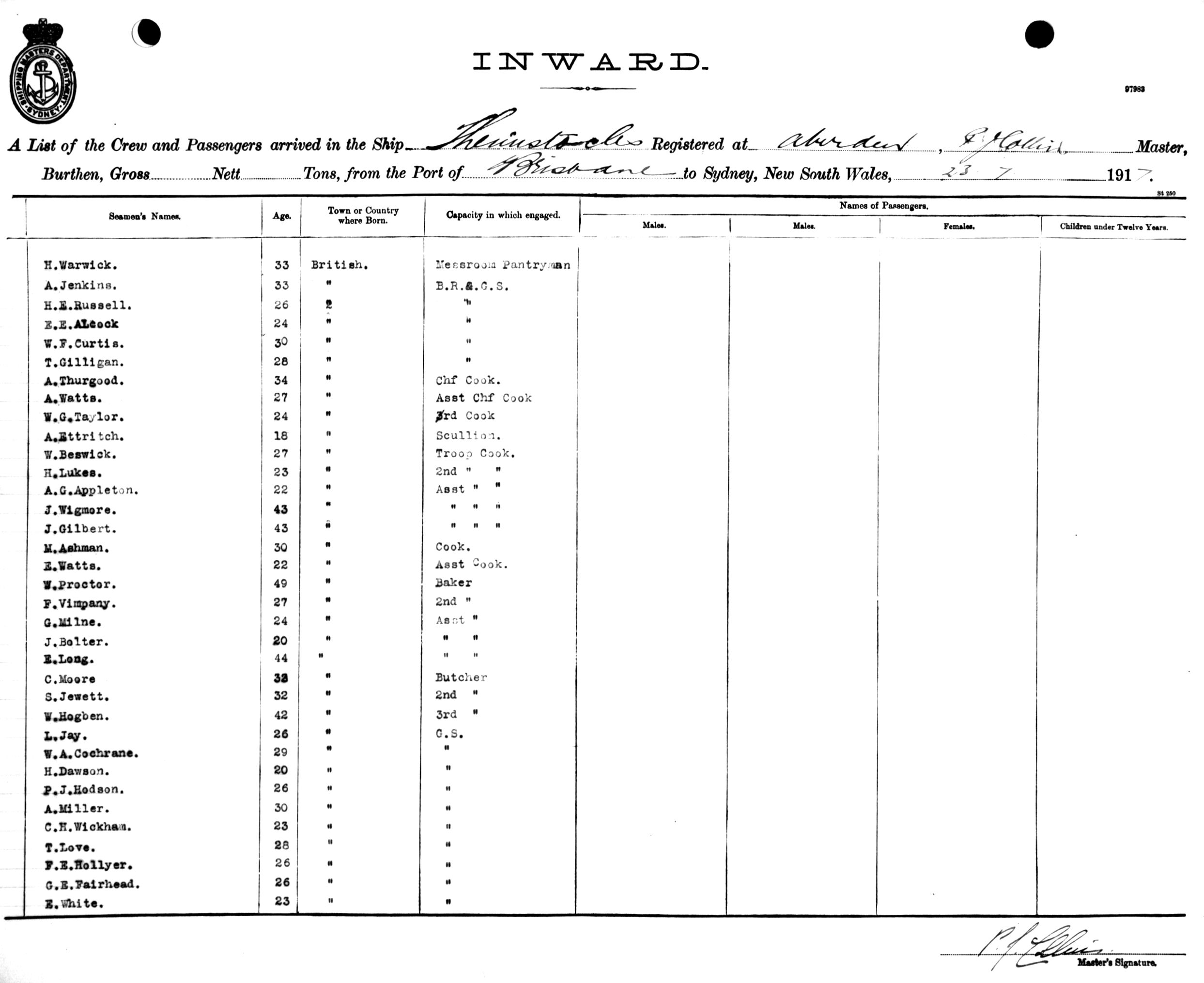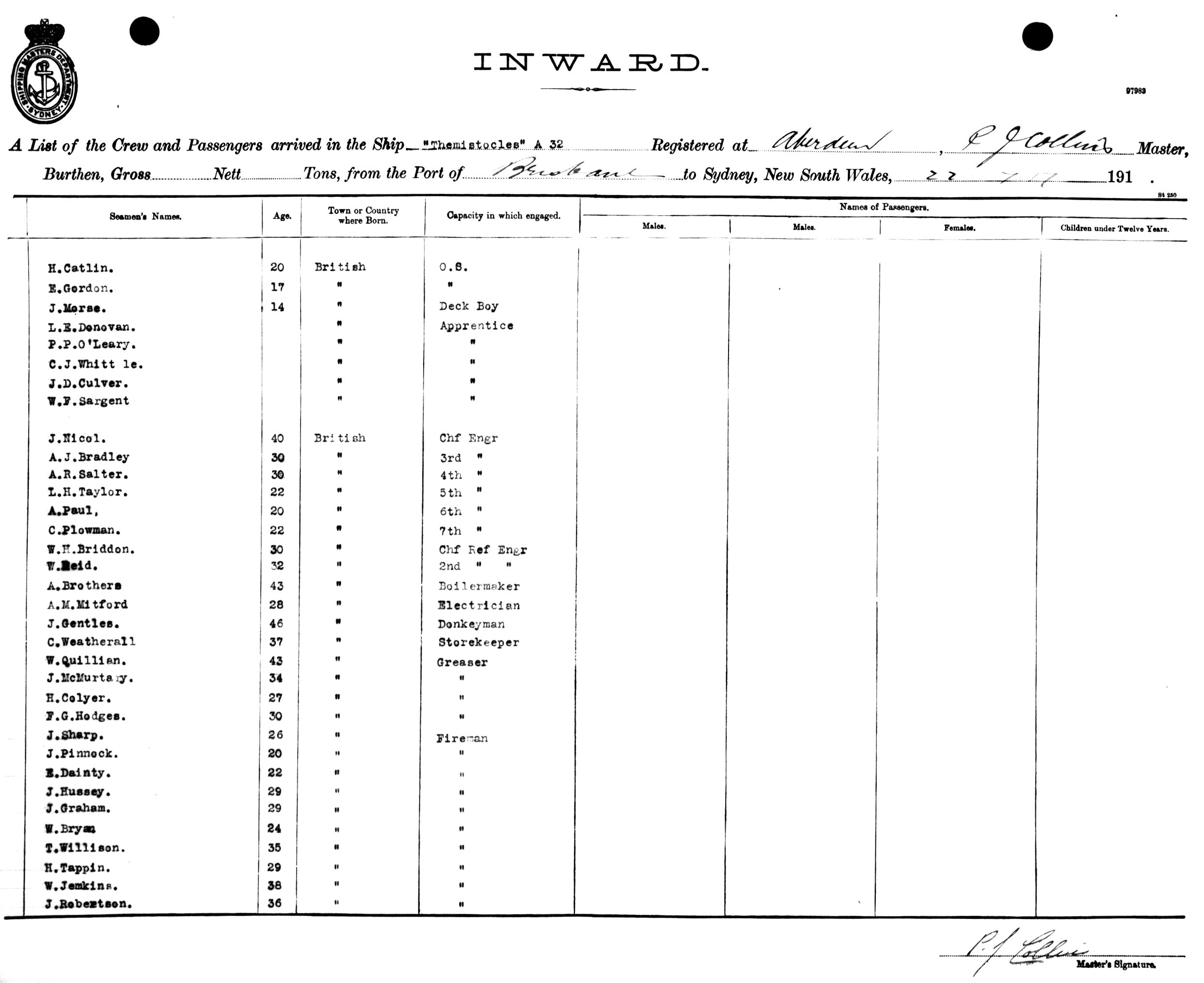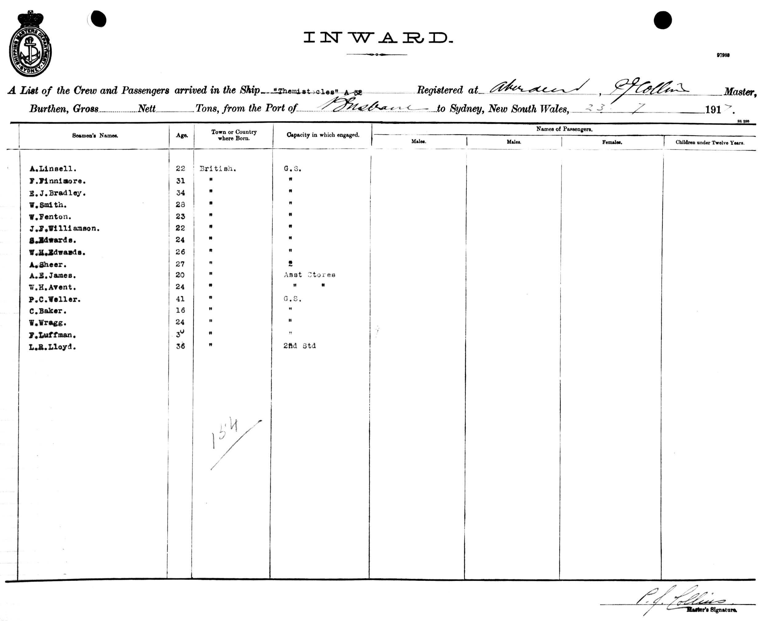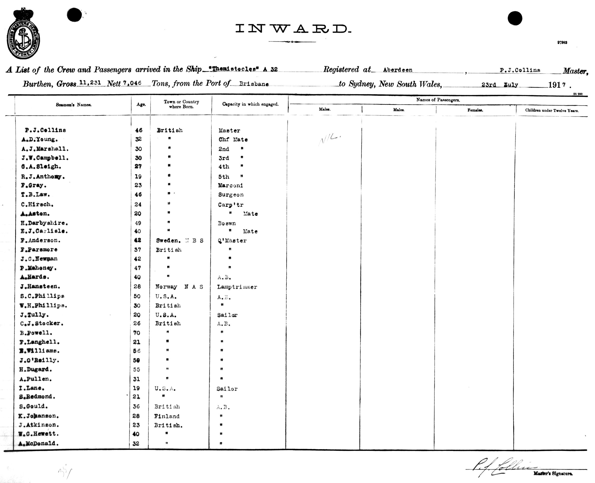 THEMISTOCLESOF ABERDEEN, P. J. COLLINS, MASTER, BURTHEN 11231/7046 TONS FROM THE PORT OF BRISBANE TO SYDNEY, NEW SOUTH WALES, 23RD JULY 1917 |