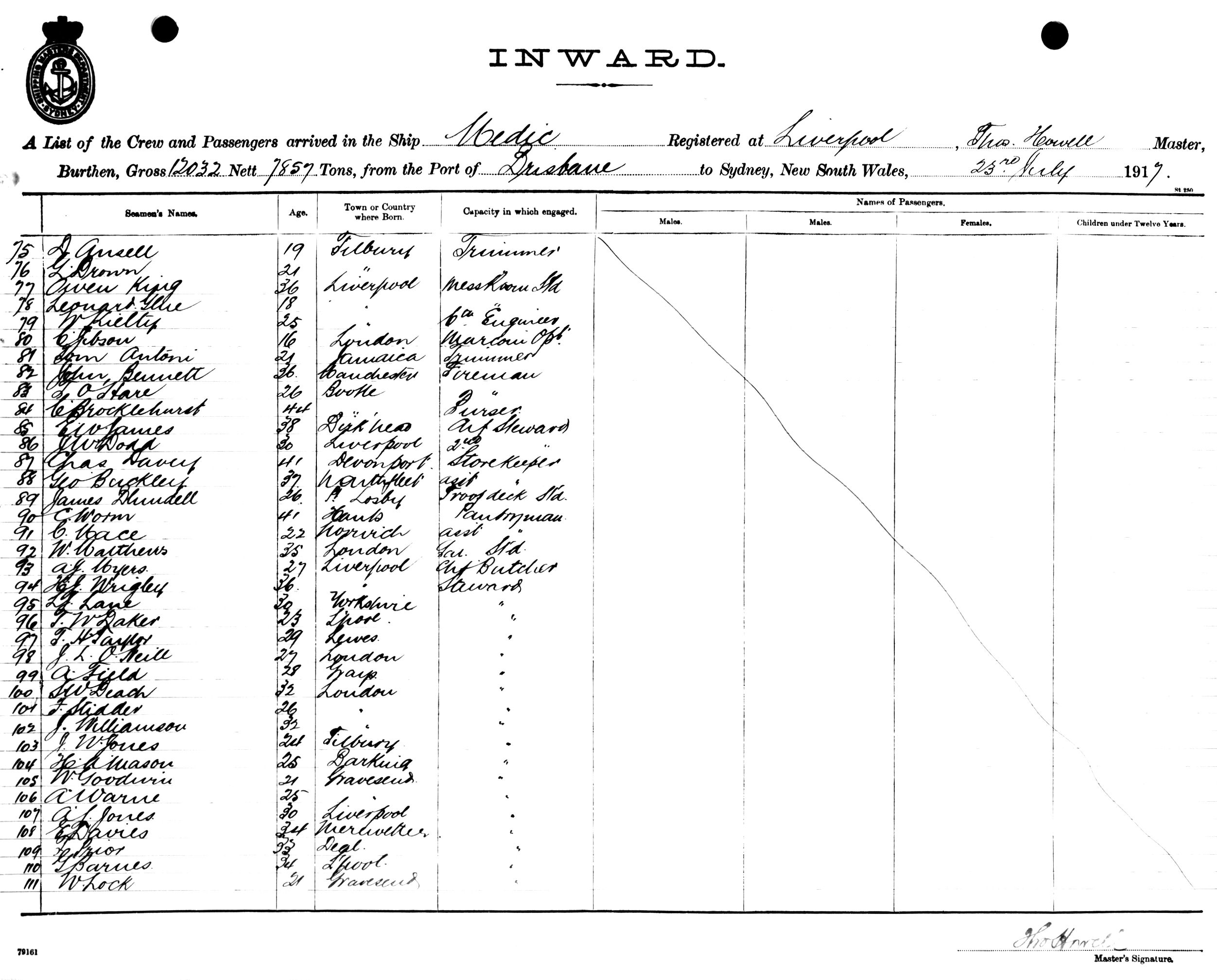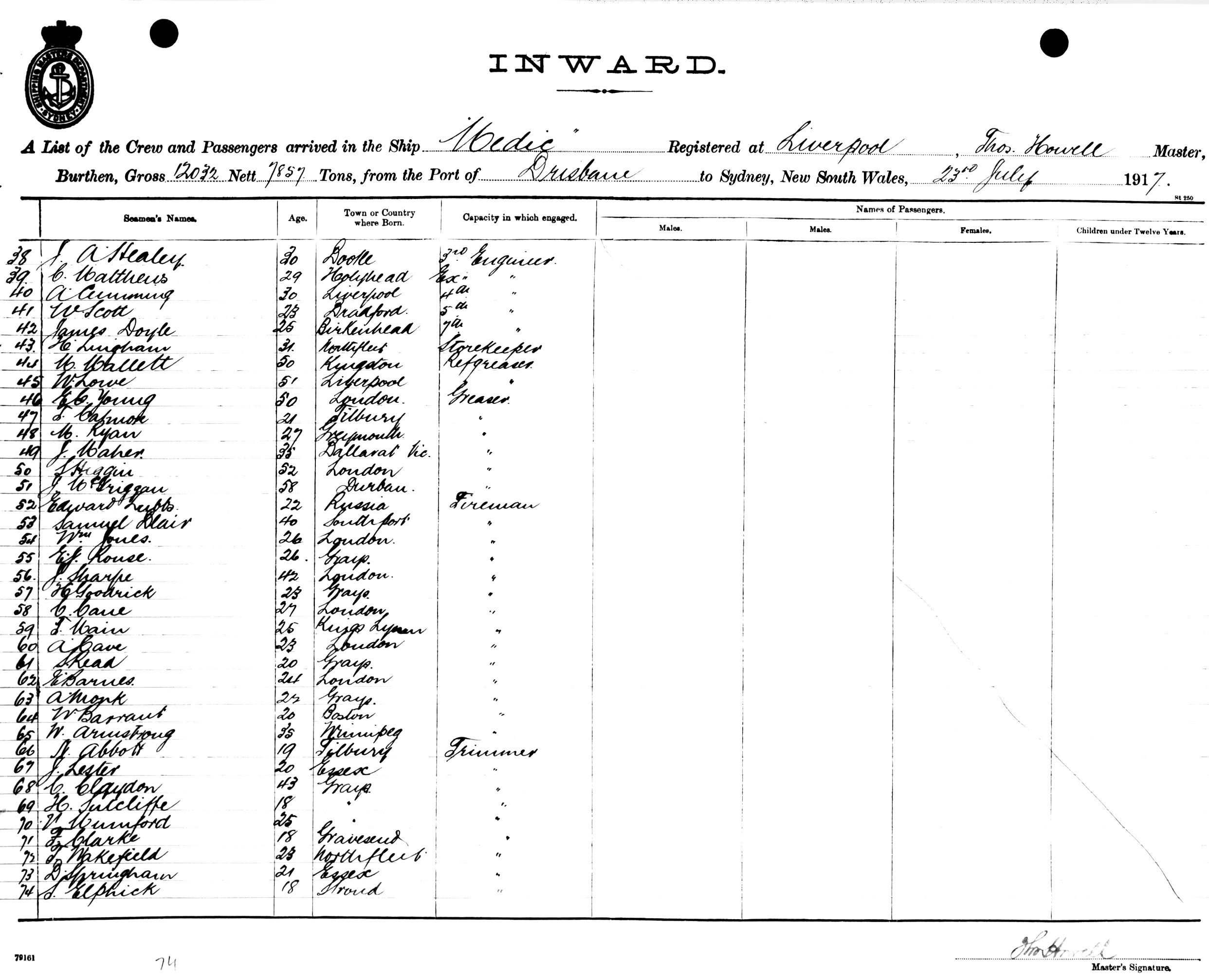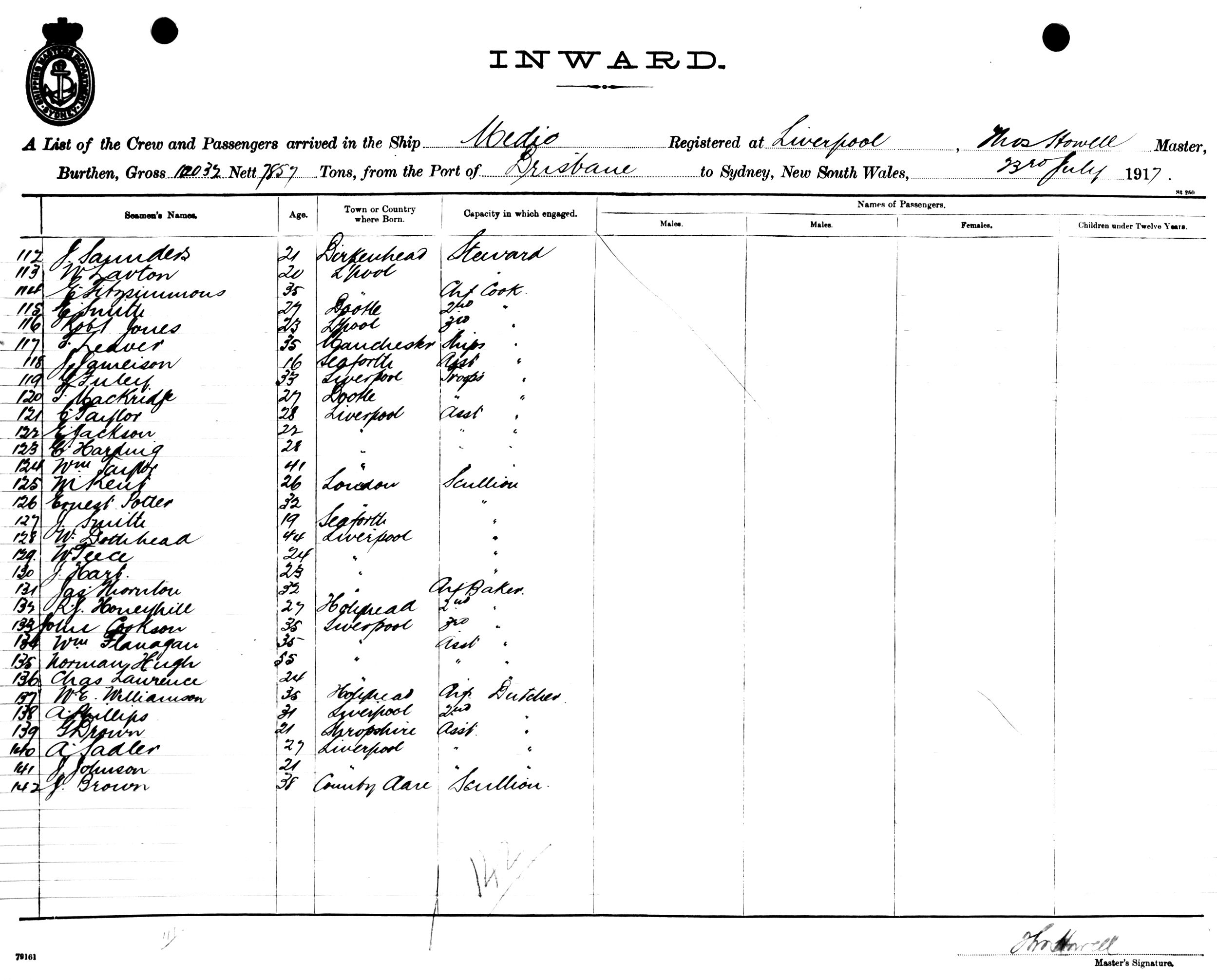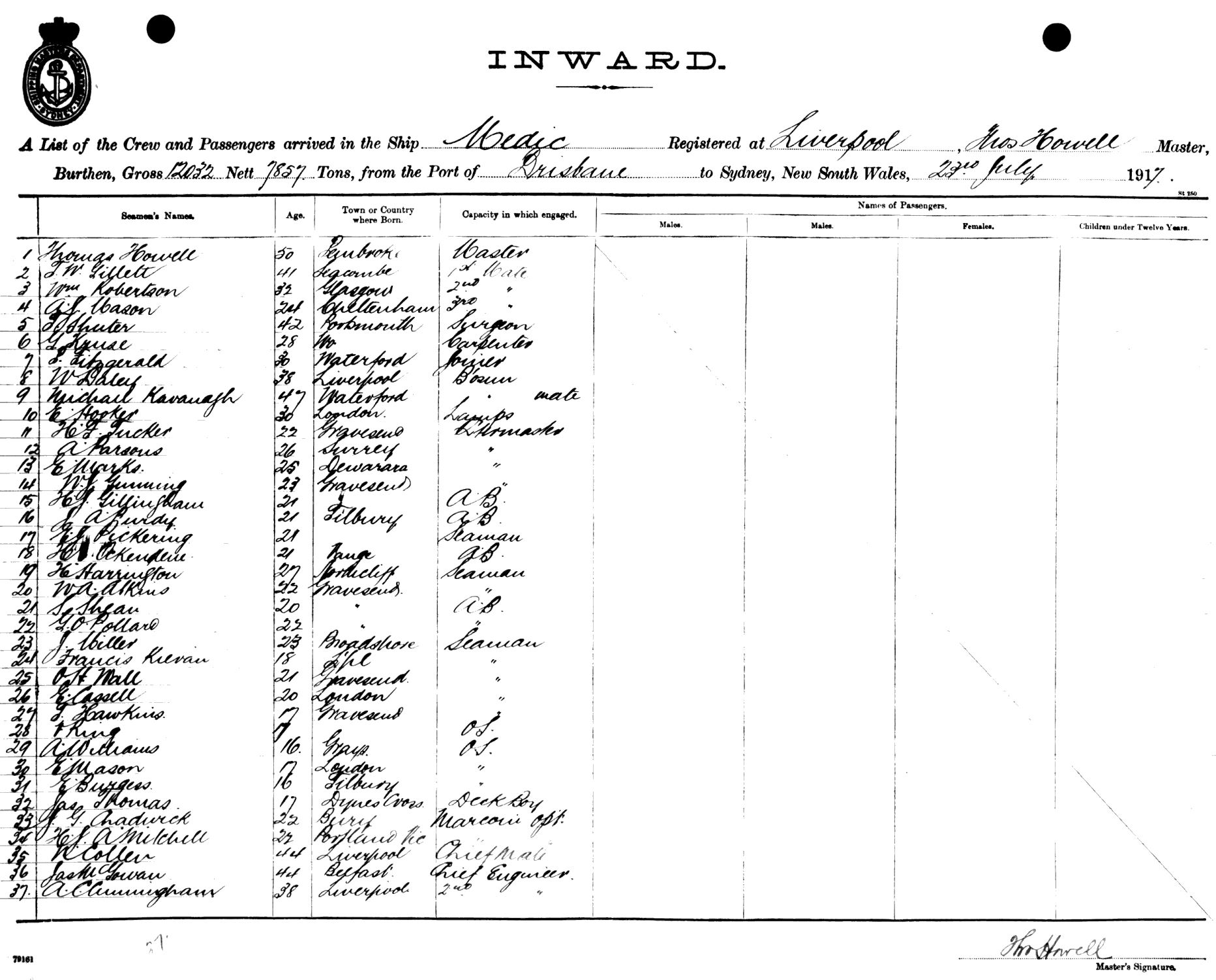Mariners and ships in Australian Waters | MEDICOF LIVERPOOL, THOMAS HOWELL, MASTER, BURTHEN 12032/7857 TONS FROM THE PORT OF BRISBANE TO SYDNEY, NEW SOUTH WALES, 23RD JULY 1917 |