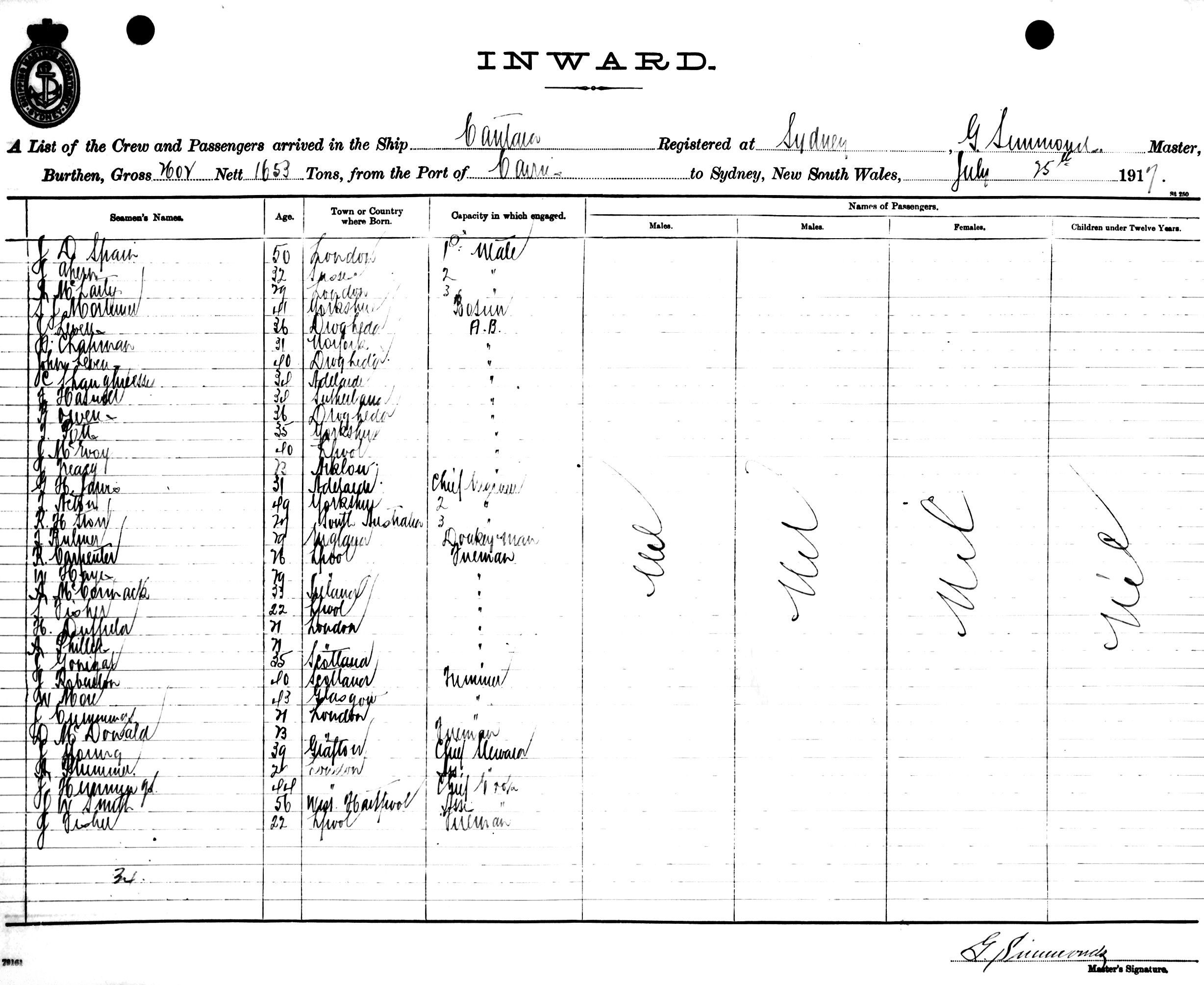 CANTARAOF SYDNEY, G. SIMMONDS, MASTER, BURTHEN 2602/1653 TONS FROM THE PORT OF CAIRNS TO SYDNEY, NEW SOUTH WALES, 25TH JULY 1917 |