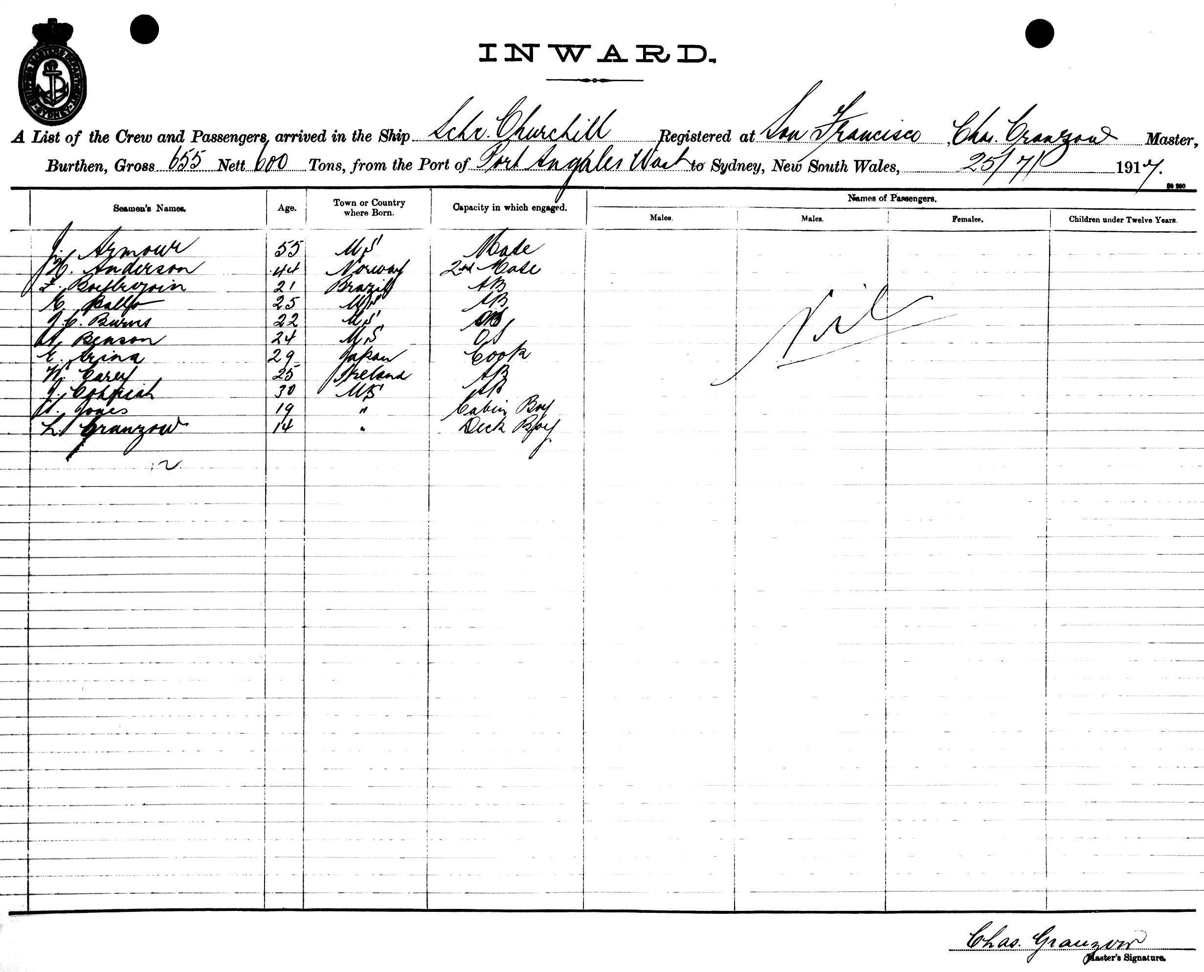 CHURCHILLOF SAN FRANCISCO, CHAS. GRANZOW, MASTER, BURTHEN 655/600 TONS FROM THE PORT OF PORT ANGELES, WASHINGTON STATE TO SYDNEY, NEW SOUTH WALES, 25TH JULY 1917 |