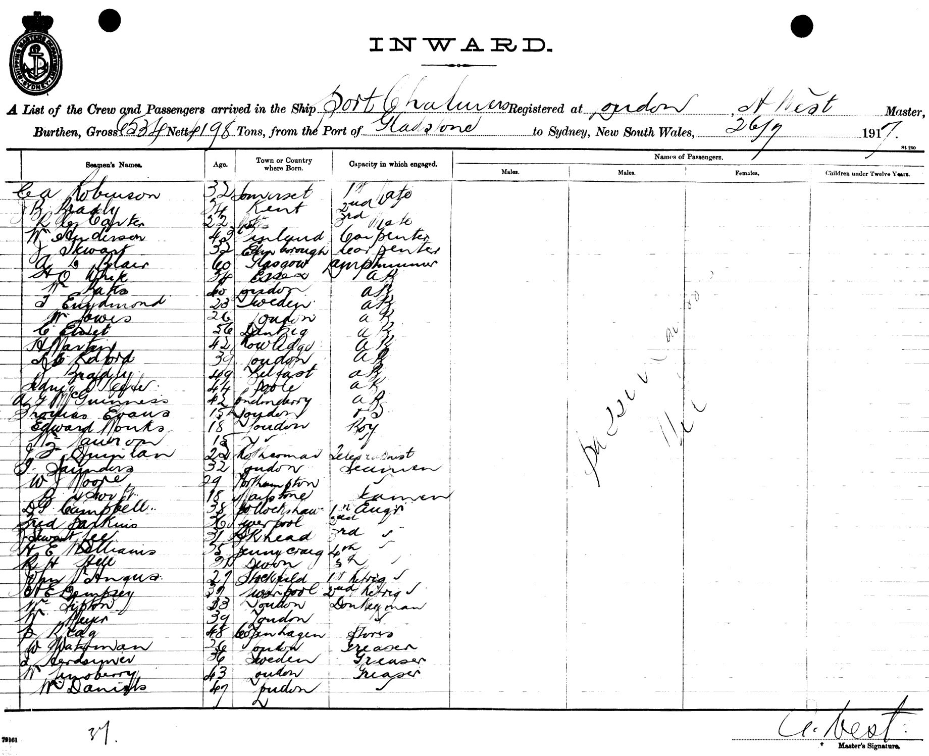 PORT CHALMERSOF LONDON, A. WEST, MASTER, BURTHEN 6534/4198 TONS FROM THE PORT OF GLADSTONE TO SYDNEY, NEW SOUTH WALES, 26TH JULY 1917 |