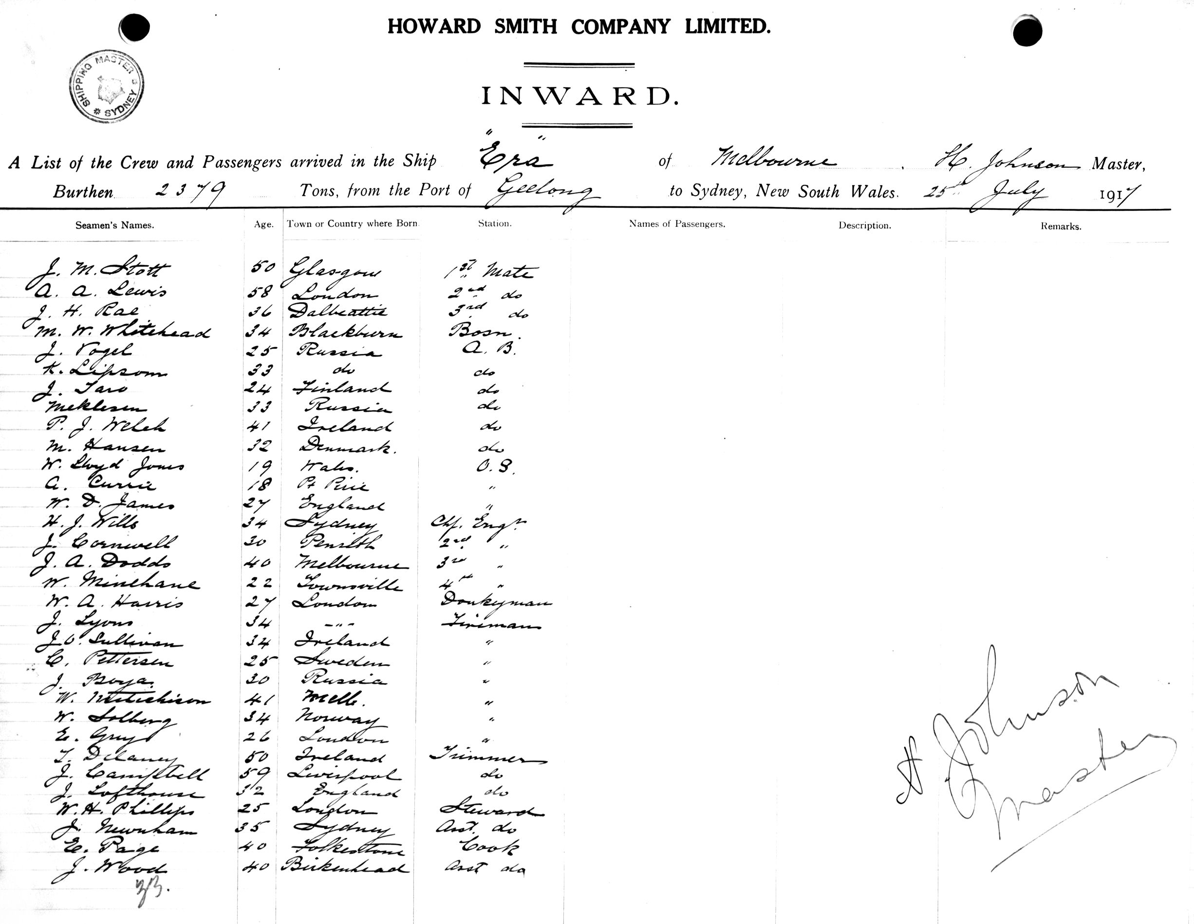 ERAOF MELBOURNE, H. JOHNSON, MASTER, BURTHEN 2379 TONS FROM THE PORT OF GEELONG TO SYDNEY, NEW SOUTH WALES, 25TH JULY 1917 |