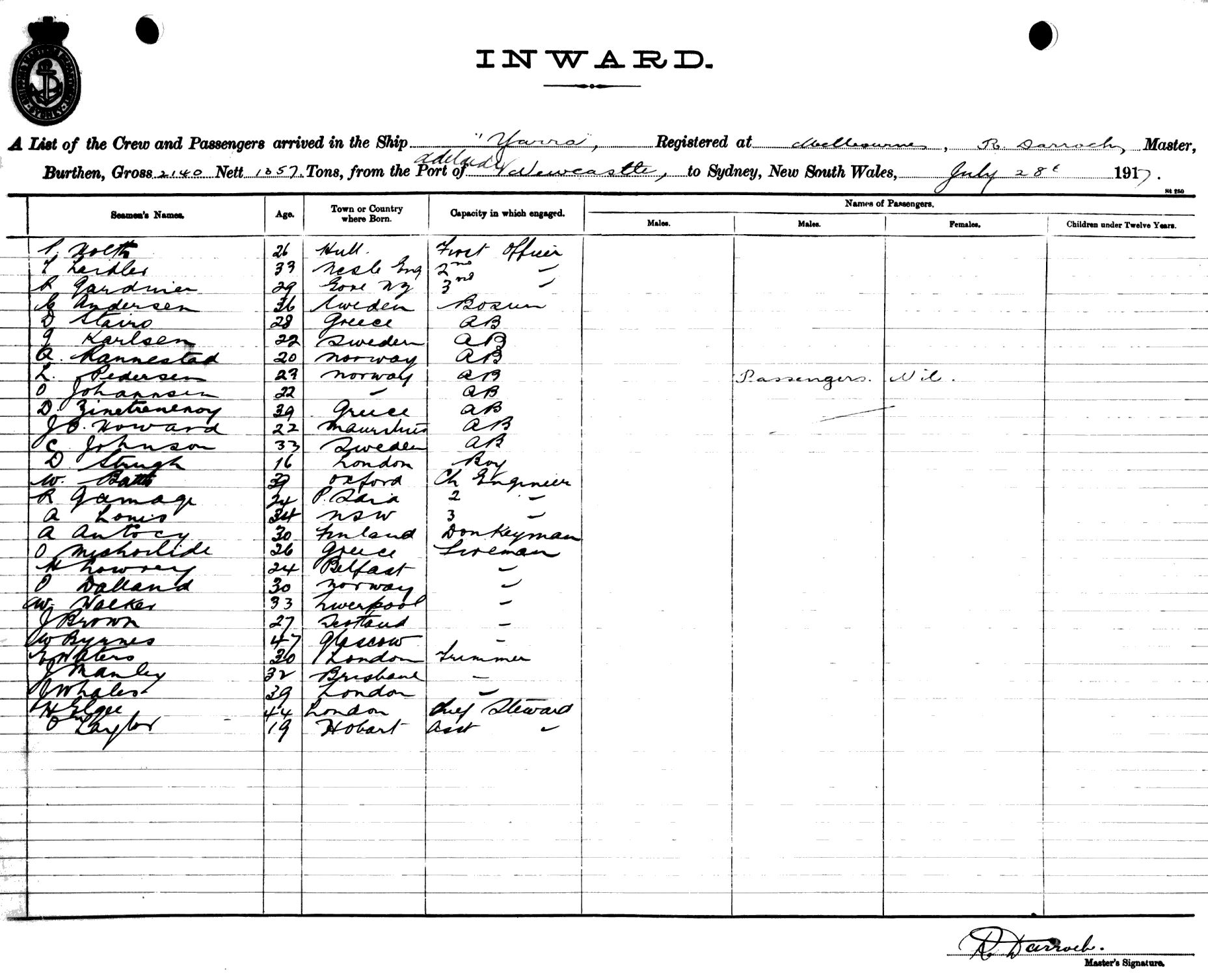 Mariners and ships in Australian Waters | YARRAOF MELBOURNE, R. DARROCH, MASTER, BURTHEN 2140/1357 TONS FROM THE PORT OF ADELAIDE via NEWCASTLE TO SYDNEY, NEW SOUTH WALES, 28TH JULY 1917 |