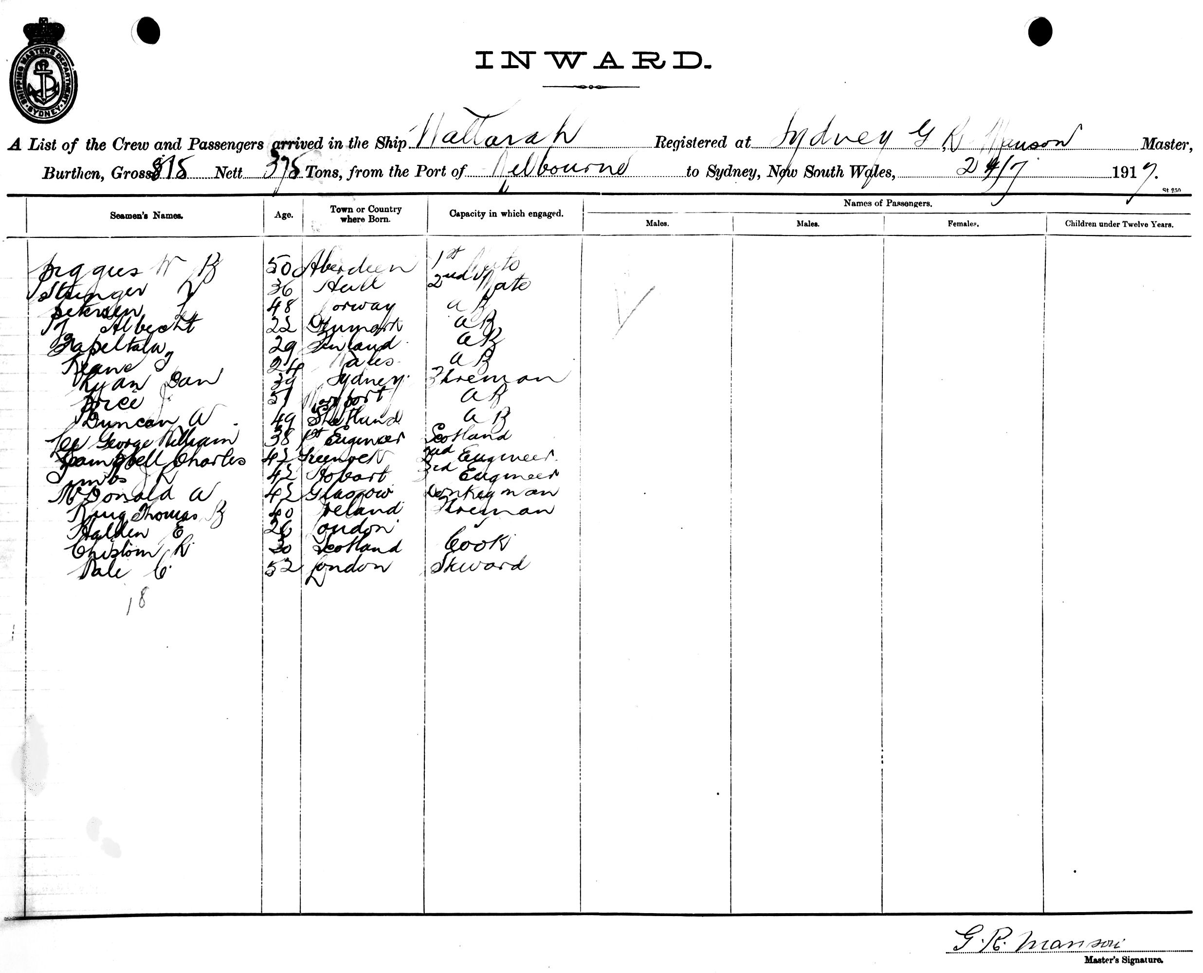 WALLARAHOF SYDNEY, G. R. MANSON, MASTER, BURTHEN 815/375 TONS FROM THE PORT OF MELBOURNE TO SYDNEY, NEW SOUTH WALES, 24TH JULY 1917 |