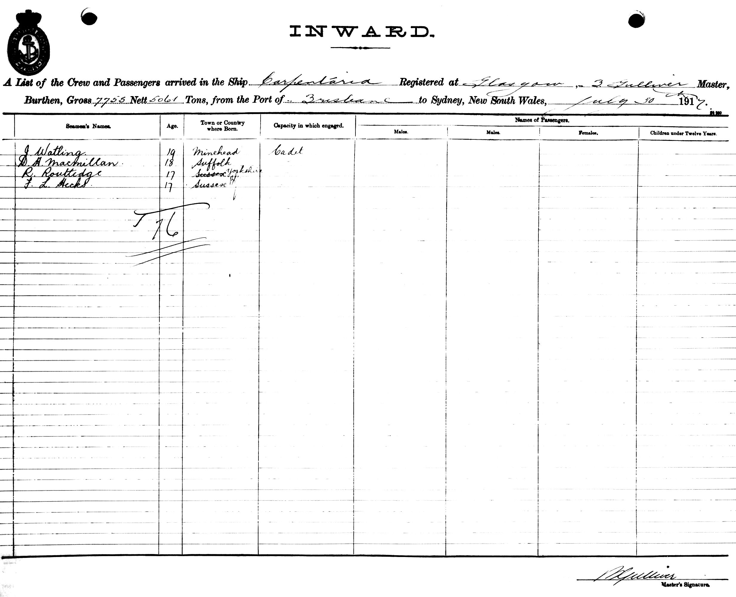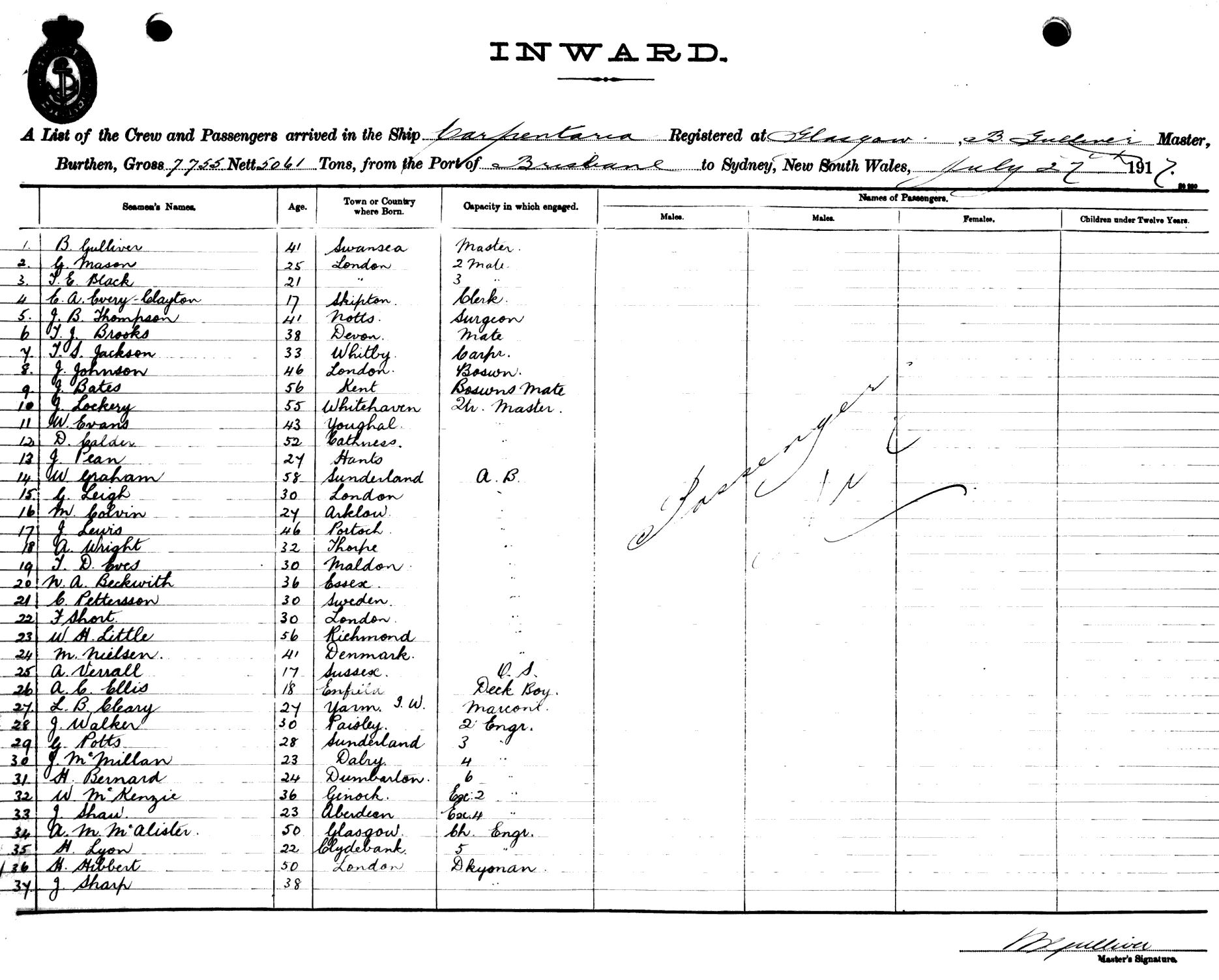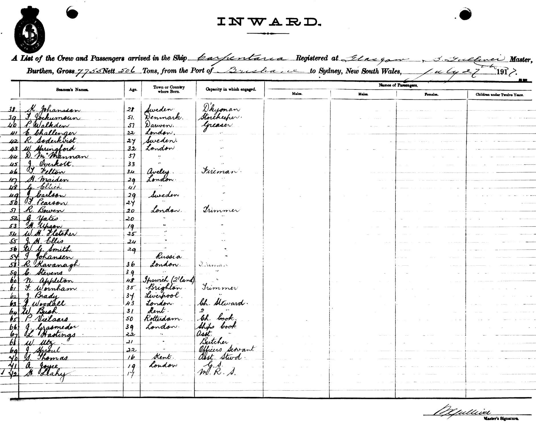 Mariners and ships in Australian Waters | CARPENTARIAOF GLASGOW, B. GULLIVER, MASTER, BURTHEN 7755/5061 TONS FROM THE PORT OF BRISBANE TO SYDNEY, NEW SOUTH WALES, 27TH JULY 1917 |