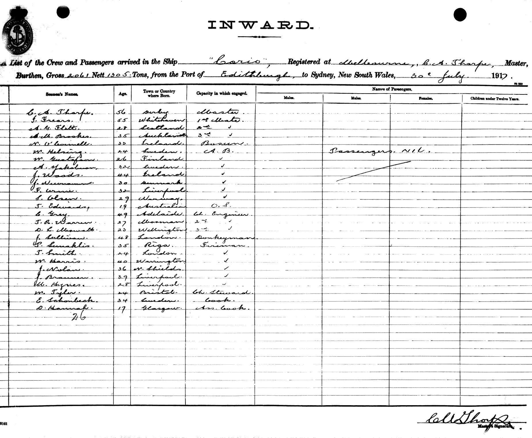 CORIOOF MELBOURNE, C. A. THORPE, MASTER, BURTHEN 2061/1305 TONS FROM THE PORT OF EDITHBURGH TO SYDNEY, NEW SOUTH WALES, 30TH JULY 1917 |