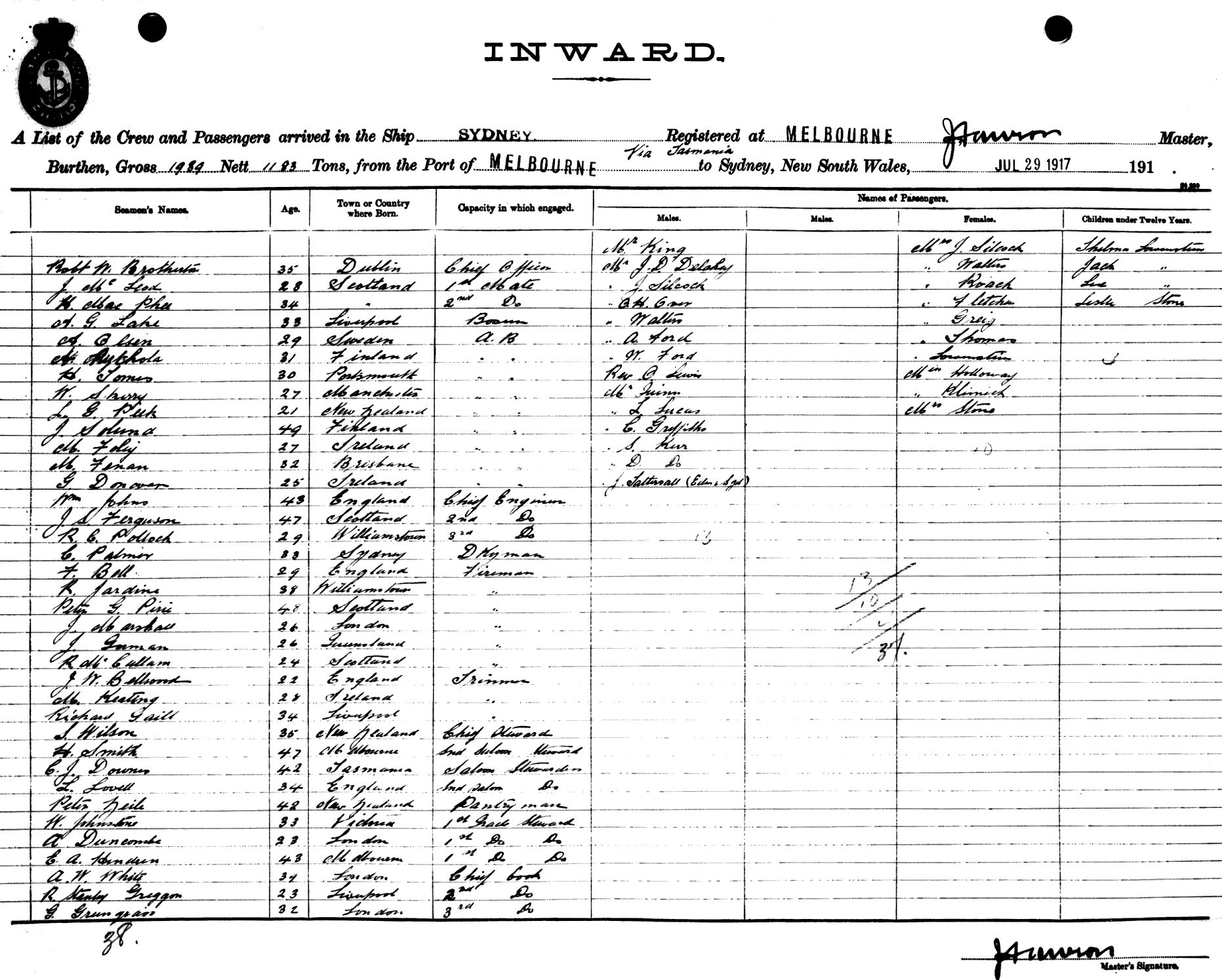 SYDNEYOF MELBOURNE, J. DAWSON, MASTER, BURTHEN 1989/1183 TONS FROM THE PORT OF MELBOURNE VIA TASMANIA TO SYDNEY, NEW SOUTH WALES, 29TH JULY 1917 |