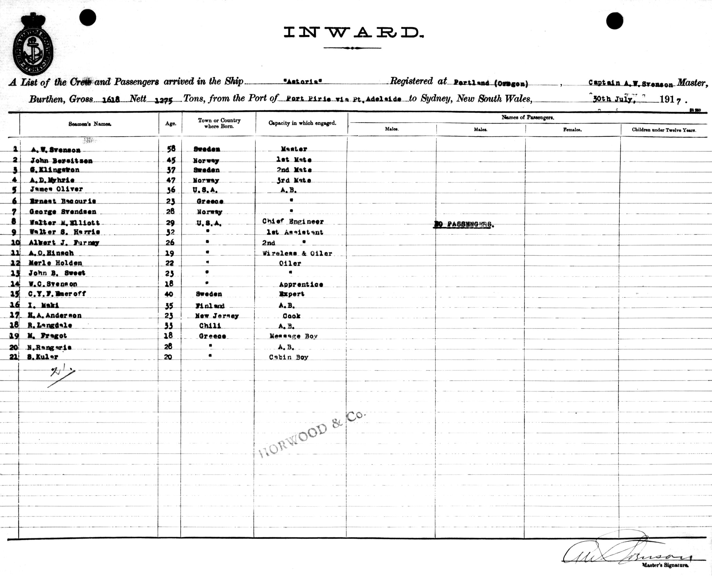 ASTORIAOF PORTLAND, OREGON, A. W. SVENSON, MASTER, BURTHEN 1618/1275 TONS FROM THE PORT OF PORT PIRIE VIA PORT ADELAIDE TO SYDNEY, NEW SOUTH WALES, 30TH JULY 1917 |